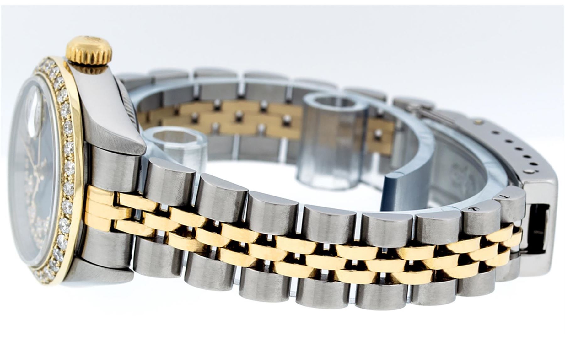 One Ladies 18K Two Tone Quickset Rolex Datejust Polished, Serviced & Electronically Tested, 18K Yellow Gold & Stainless Steel Case: 26mm, 18K Yellow Gold Crown, Custom Bezel: New 18K Yellow Gold Beadset Diamond Bezel, Diamond Count: 43 Diamonds in dial, Total Weight .70 Carat, Clarity: SI-VS, Color: G to H. Custom Crystal: New Synthetic Sapphire Cyclops Lens. Custom Hands: New Luminescent Hands. Movement: Automatic Winding Movement Caliber 2235. Custom Dial: Blue String VS Diamond Dial, Stone Count: 43 Diamonds, Clarity: VS, Color: G to H. Date Window: 3 O'Clock Position Date Display, Model: Datejust. Condition: G-6 Extra Fine. Bracelet: Two Tone 18K Yellow Gold & Stainless Steel Jubilee Band. Bright Polish. 6.0 Inch Length, Adjustable. Standard Clasp, With Rolex Logo. This Watch Has Been Serviced Time Tested And Is In Excellent Condition It Is Free Of All Scratches And Dents.