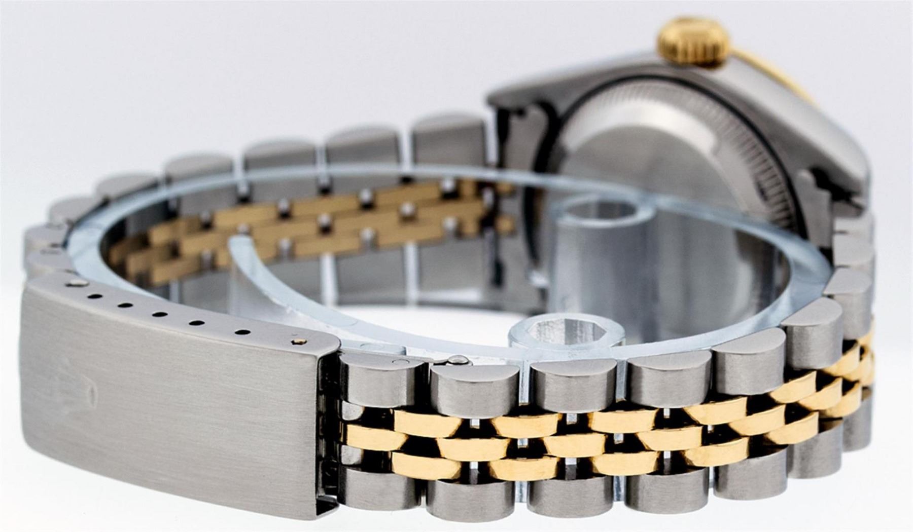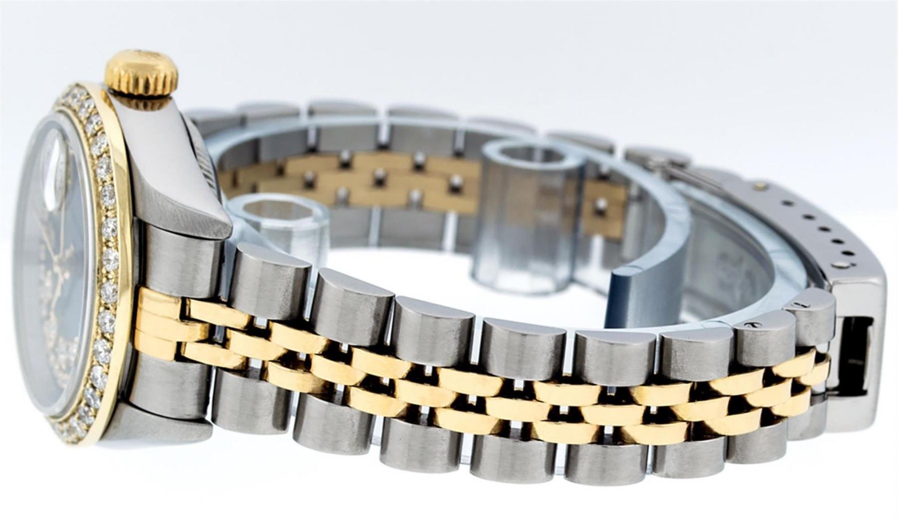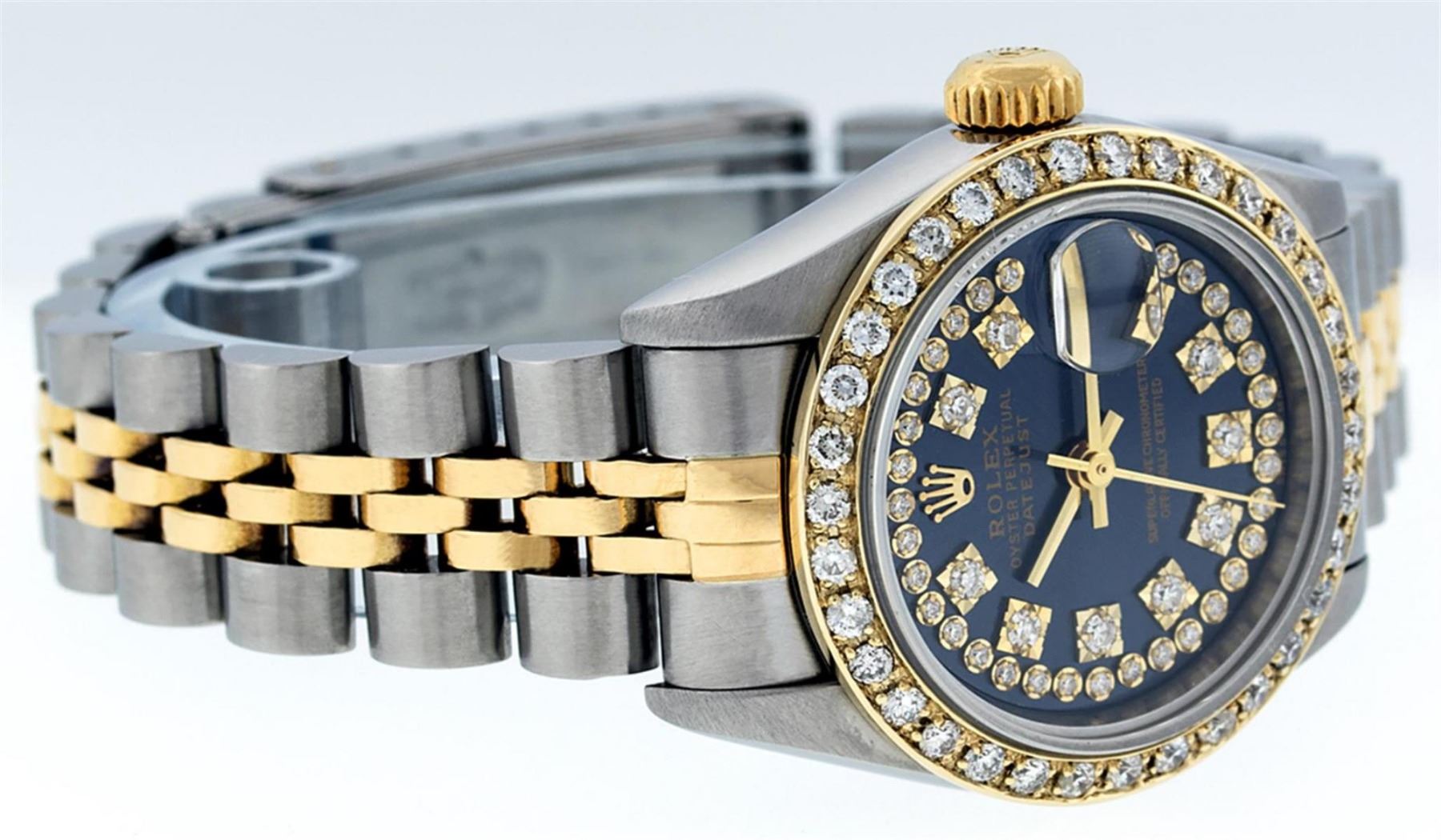 One Ladies 18K Two Tone Quickset Rolex Datejust Polished, Serviced & Electronically Tested, 18K Yellow Gold & Stainless Steel Case: 26mm, 18K Yellow Gold Crown, Custom Bezel: New 18K Yellow Gold Beadset Diamond Bezel, Diamond Count: 43 Diamonds in Dial, Total Weight .70 Carat, Clarity: SI-VS, Color: G to H. Custom Crystal: New Synthetic Sapphire Cyclops Lens. Custom Hands: New Luminescent Hands. Movement: Quickset Automatic Winding Movement . Custom Dial: Blue String VS Diamond Dial, Stone Count: 43 Diamonds, Clarity: VS, Color: G to H. Date Window: 3 O'Clock Position Date Display, Model: Datejust. Condition: G-6 Extra Fine. Bracelet: Two Tone 18K Yellow Gold & Stainless Steel Jubilee Band. Bright Polish. 6.0 Inch Length, Adjustable. Standard Clasp, With Rolex Logo. This Watch Has Been Serviced Time Tested And Is In Excellent Condition It Is Free Of All Scratches And Dents.