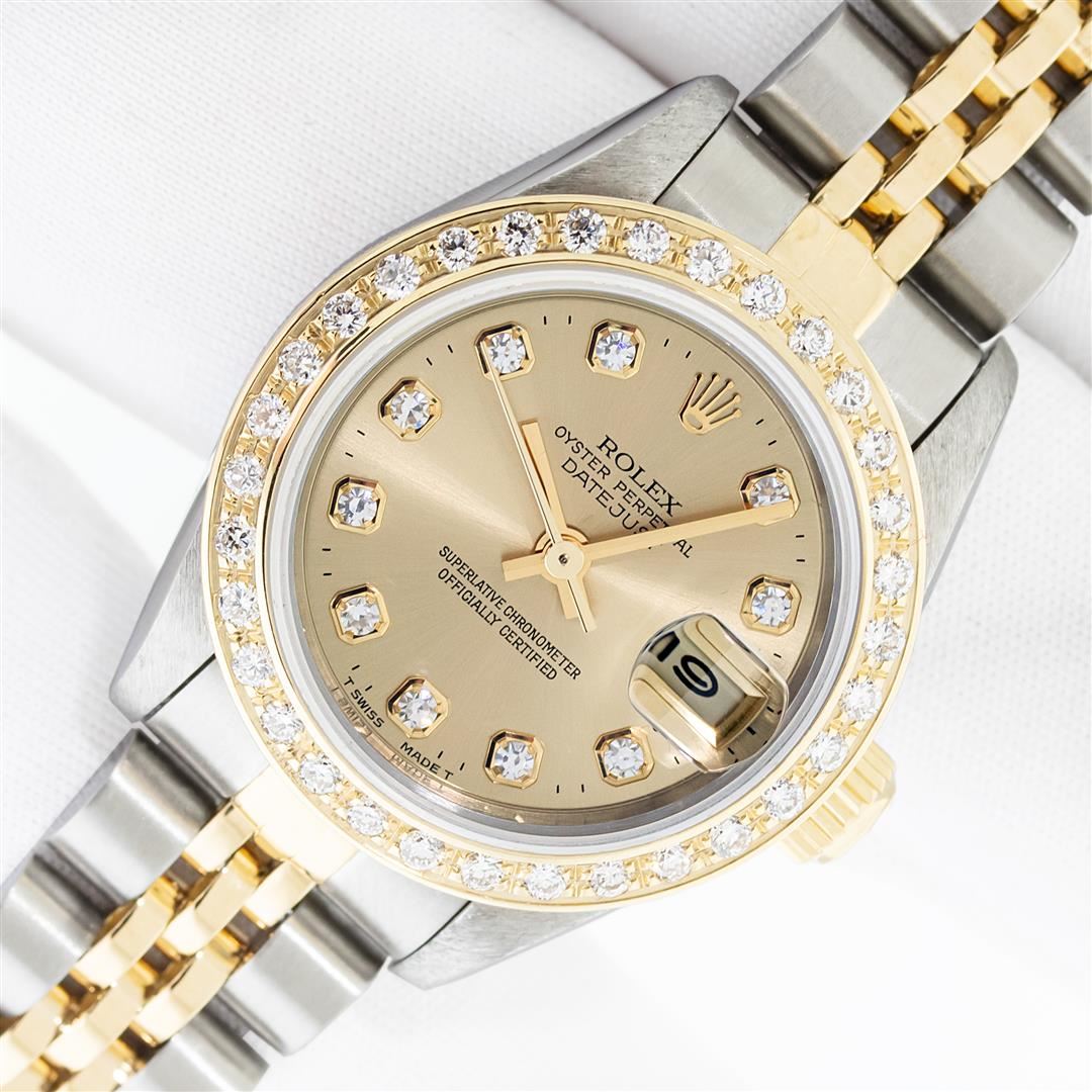 Rolex Ladies Pre Owned Sapphire Quickset 18K Yellow Gold and Stainless Steel Two Tone Datejust Polished Bright with Satin Finish, Serviced & Electronically Tested, Rolex Stainless Steel Case: 26mm, Rolex 18K Yellow Gold Crown, Custom Bezel: New Beadset Diamond Bezel, Diamond Count: 32 Diamonds On Bezel. Custom Crystal: New Sapphire With Magnified Date Window. Custom Hands: New Hands. Rolex Movement: Automatic Winding Movement 2235. Rolex Dial: Factory Champagne Diamond Dial, Diamond Count: 10 Diamonds On Dial. Date Window: 3 O'Clock Position Date Display, Model: Quickset Datejust, Condition: G-6 Extra Fine. Rolex Bracelet: 18K Yellow Gold & Stainless Steel Jubilee Band. Bright Polish & Satin Finish. 6.0 Inch Length, Adjustable. Standard Clasp, With Rolex Logo. This Watch Has Been Serviced Time Tested And Is In Excellent Condition It Is Free Of All Scratches And Dents. This Watch Comes With A Rolex Box.