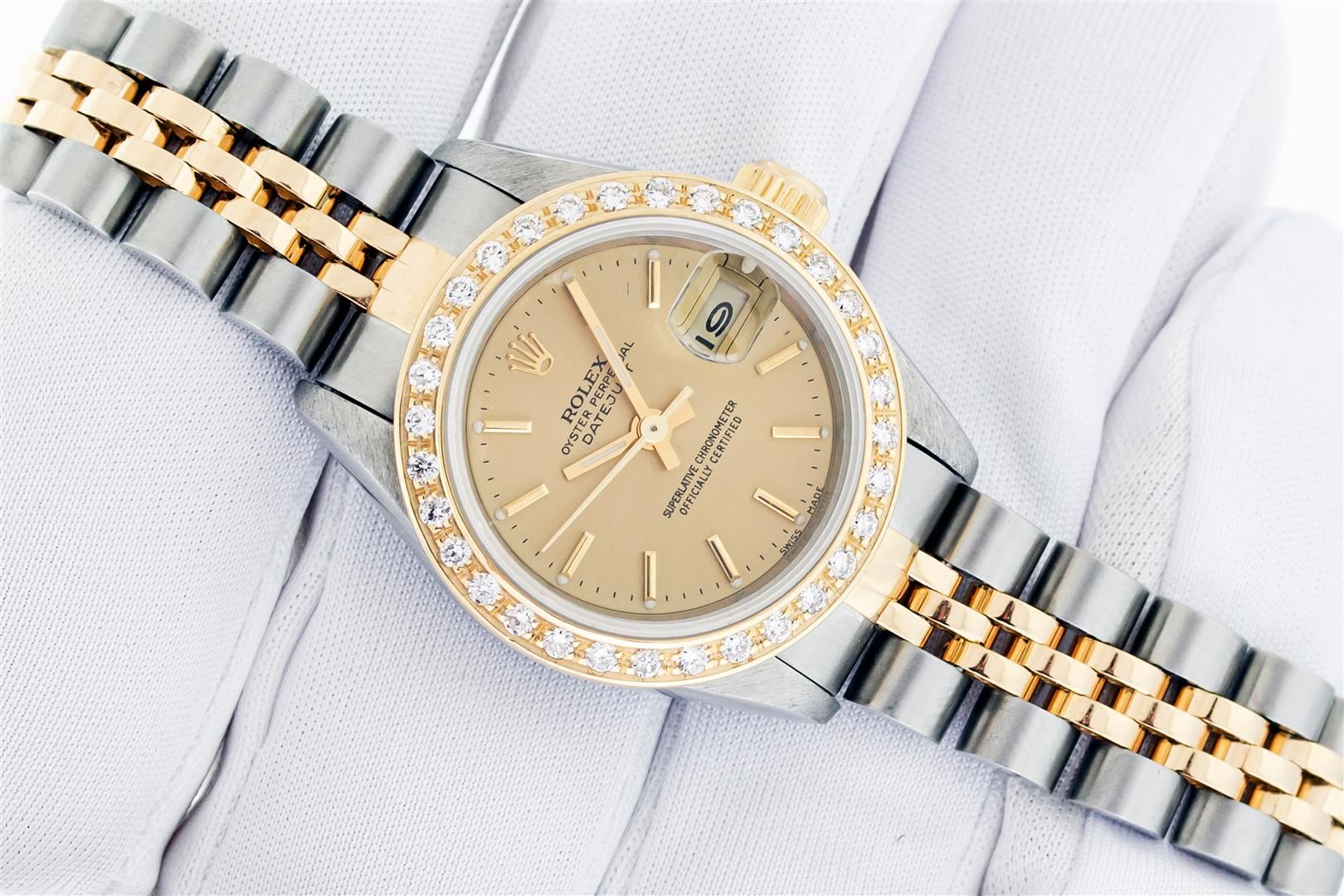 Rolex Ladies Pre Owned Sapphire Quickset 18K Yellow Gold and Stainless Steel Two Tone Datejust Polished Bright with Satin Finish, Serviced & Electronically Tested, Rolex Stainless Steel Case: 26mm, Rolex 18K Yellow Gold Crown, Custom Bezel: New Beadset Diamond Bezel, Diamond Count: 32 Diamonds On Bezel. Custom Crystal: New Sapphire With Magnified Date Window. Custom Hands: New Hands. Rolex Movement: Automatic Winding Movement 2235. Rolex Dial: Champagne With Index Hour Markers And Dash Track. Date Window: 3 O'Clock Position Date Display, Model: Quickset Datejust, Condition: G-6 Extra Fine. Rolex Bracelet: 18K Yellow Gold & Stainless Steel Jubilee Band. Bright Polish & Satin Finish. 6.0 Inch Length, Adjustable. Standard Clasp, With Rolex Logo. This Watch Has Been Serviced Time Tested And Is In Excellent Condition It Is Free Of All Scratches And Dents.