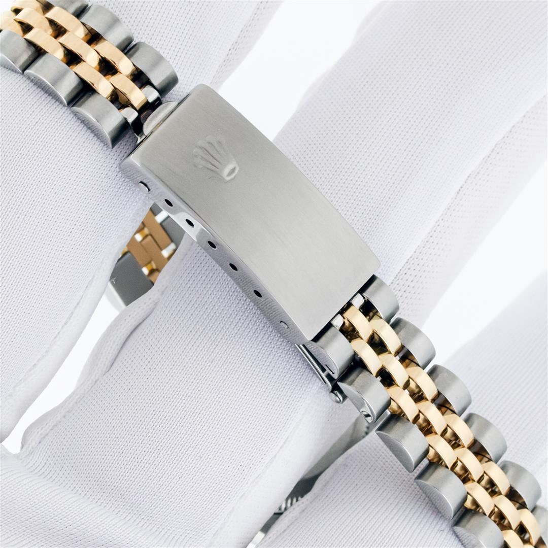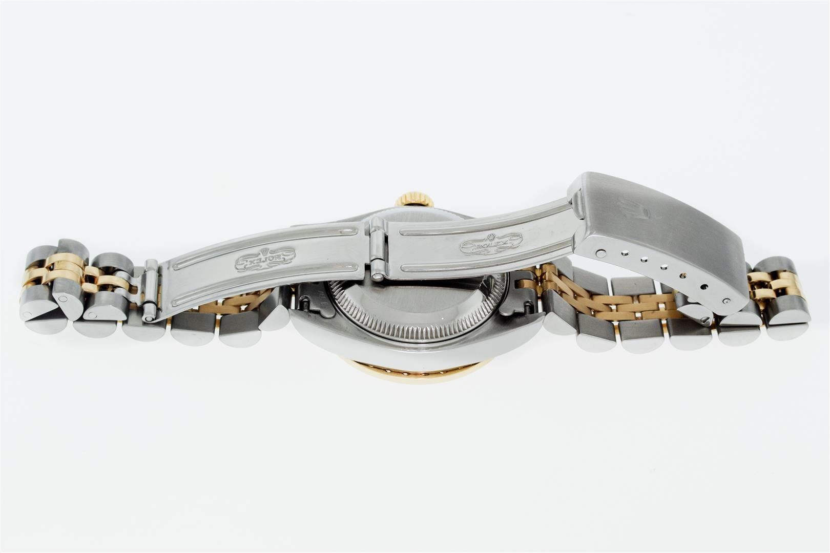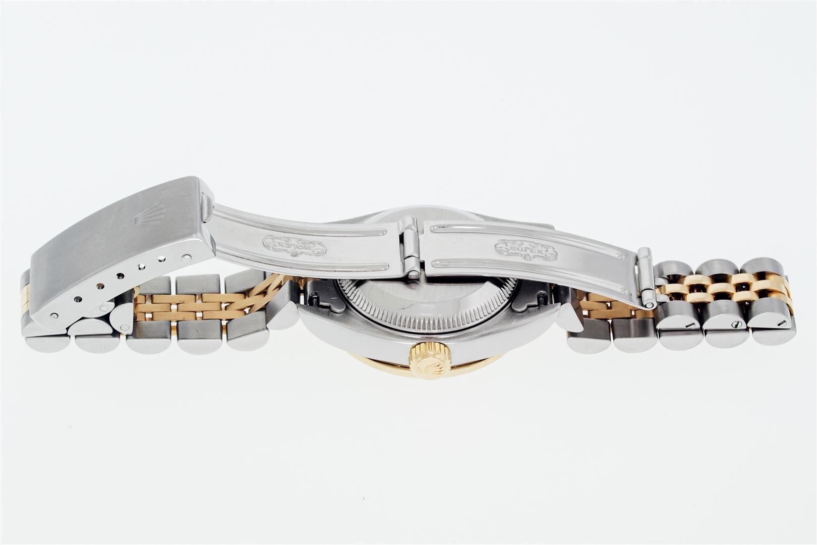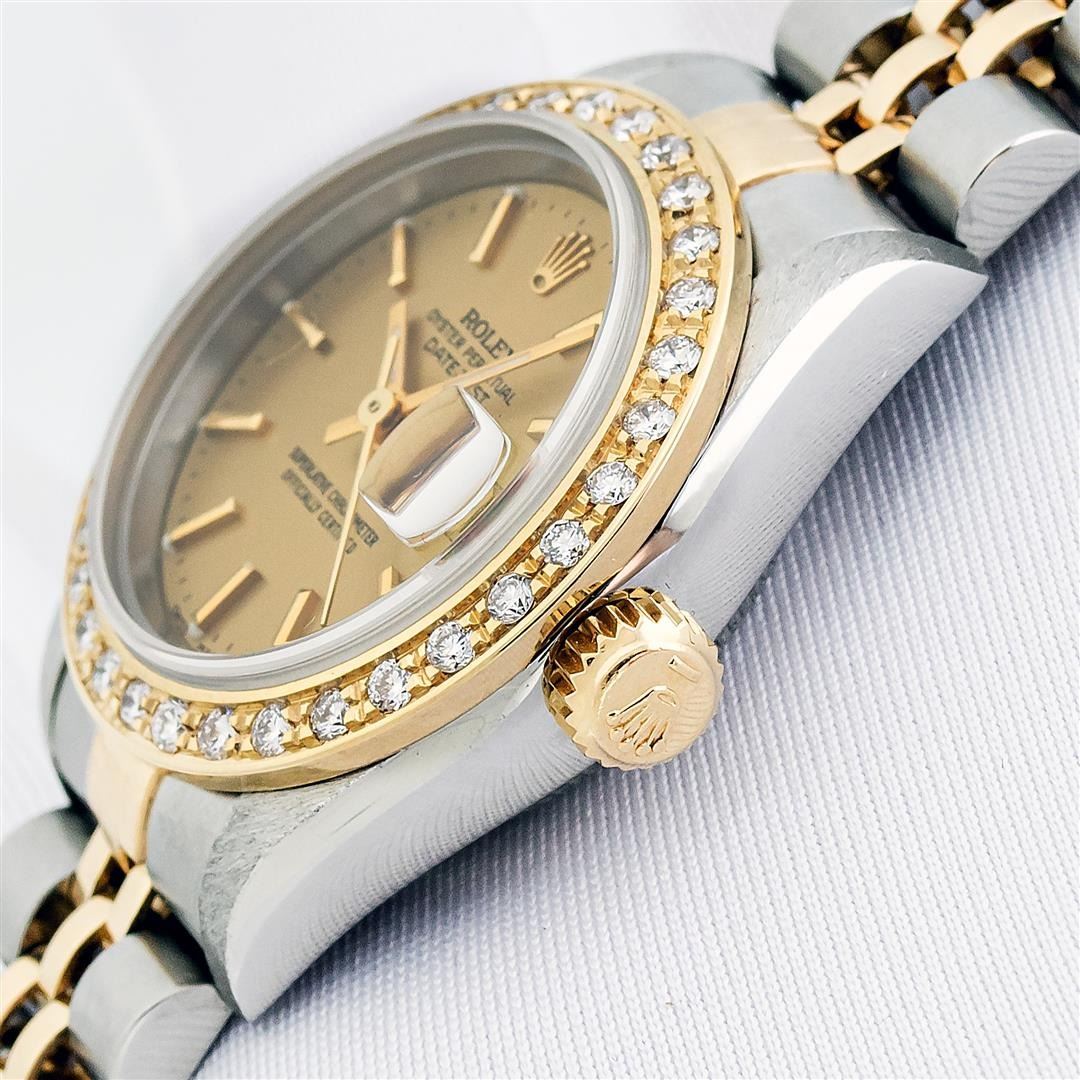 Rolex Ladies Pre Owned Sapphire Quickset 18K Yellow Gold and Stainless Steel Two Tone Datejust Polished Bright with Satin Finish, Serviced & Electronically Tested, Rolex Stainless Steel Case: 26mm, Rolex 18K Yellow Gold Crown, Custom Bezel: New Beadset Diamond Bezel, Diamond Count: 32 Diamonds On Bezel. Custom Crystal: New Sapphire With Magnified Date Window. Custom Hands: New Hands. Rolex Movement: Automatic Winding Movement 2235. Rolex Dial: Champagne With Index Hour Markers And Dash Track. Date Window: 3 O'Clock Position Date Display, Model: Quickset Datejust, Condition: G-6 Extra Fine. Rolex Bracelet: 18K Yellow Gold & Stainless Steel Jubilee Band. Bright Polish & Satin Finish. 6.0 Inch Length, Adjustable. Standard Clasp, With Rolex Logo. This Watch Has Been Serviced Time Tested And Is In Excellent Condition It Is Free Of All Scratches And Dents.