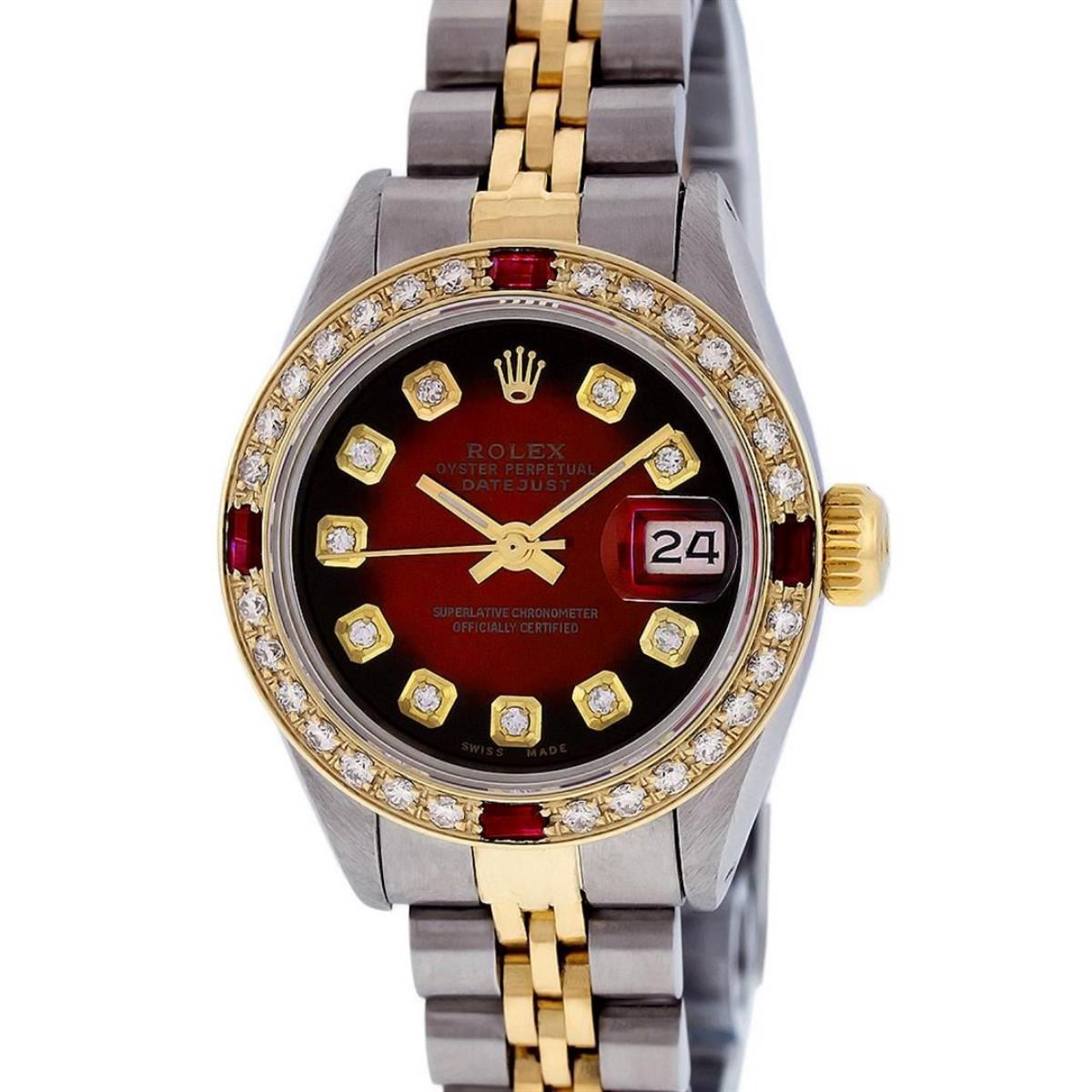 One Ladies Two Tone Rolex Datejust Polished, Serviced & Electronically Tested, Yellow Gold & Stainless Steel Case: 26mm, Yellow Gold Crown, Custom Bezel: New 18K Yellow Gold Ruby Beadset Diamond Bezel, Diamond + Gem Count: 28 Diamonds + 4 Rubies, Total Weight .70 Carat, Clarity: SI-VS, Color: G to H. Custom Crystal: New Scratch Resistant Synthetic Sapphire Cyclops Lens. Custom Hands: New Luminescent Hands. Movement: Automatic Winding Movement. Custom Dial: Red Vignette Diamond Dial. Date Window: 3 O'Clock Position Date Display, Model: Datejust, Condition: G-6 Extra Fine. Bracelet: Two Tone Yellow Gold & Stainless Steel Jubilee Band. Bright Polish. 6.0 Inch Length, Adjustable. Standard Clasp, With Rolex Logo. This Watch Has Been Serviced Time Tested And Is In Excellent Condition It Is Free Of All Scratches And Dents.
