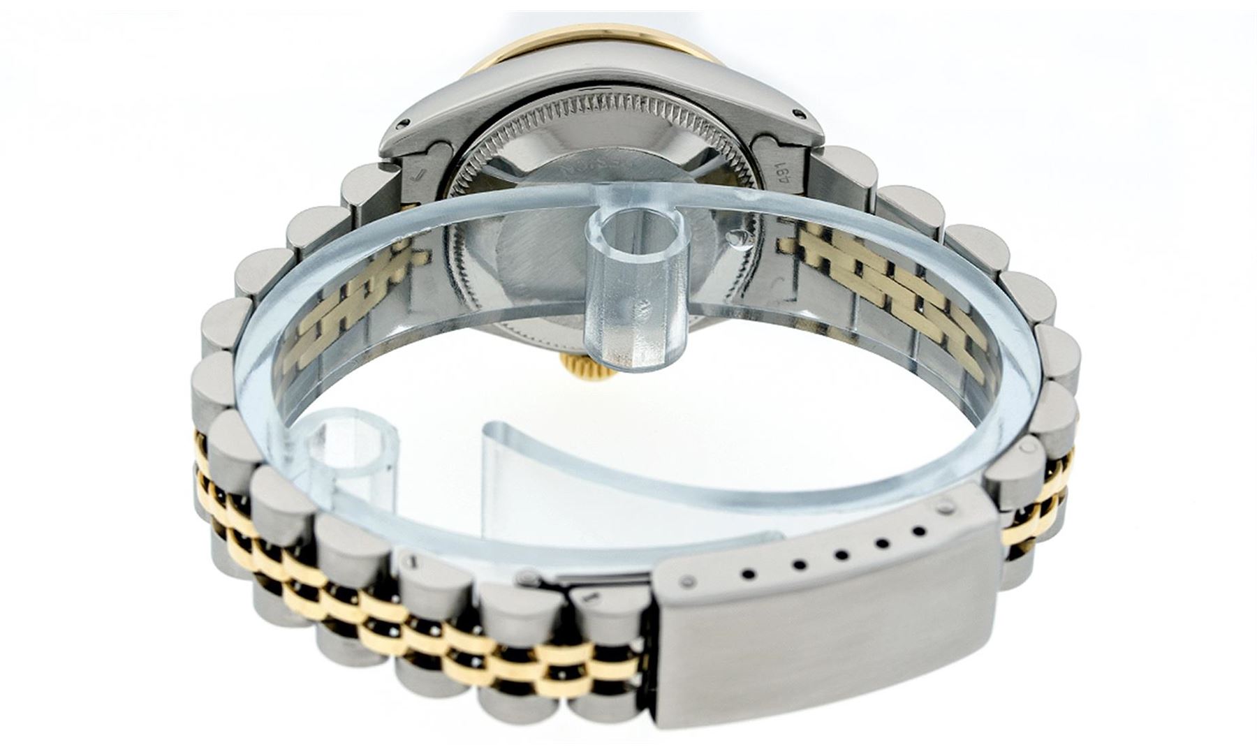 One Ladies Pre Owned Two Tone Rolex Datejust Polished, Serviced & Electronically Tested, Yellow Gold & Stainless Steel Case: 26mm, Yellow Gold Crown, Custom Bezel: New 18K Yellow Gold Ruby Beadset Diamond Bezel, Diamond + Gem Count: 28 Diamonds + 4 Rubies, Clarity: SI-VS, Color: G to H. Custom Crystal: New Sapphire With Date Window. Custom Hands: New Luminescent Hands. Rolex Movement: Automatic Winding Movement. Custom Dial: Refinished To Red Vignette With Custom Added Diamonds. Date Window: 3 O'Clock Position Date Display, Model: Datejust, Condition: G-6 Extra Fine. Rolex Bracelet: Two Tone Yellow Gold & Stainless Steel Jubilee Band. Bright Polish. 6.0 Inch Length, Adjustable. Standard Clasp, With Rolex Logo. This Pre Owned Watch Has Been Serviced Time Tested And Is In Excellent Condition It Is Free Of All Scratches And Dents.