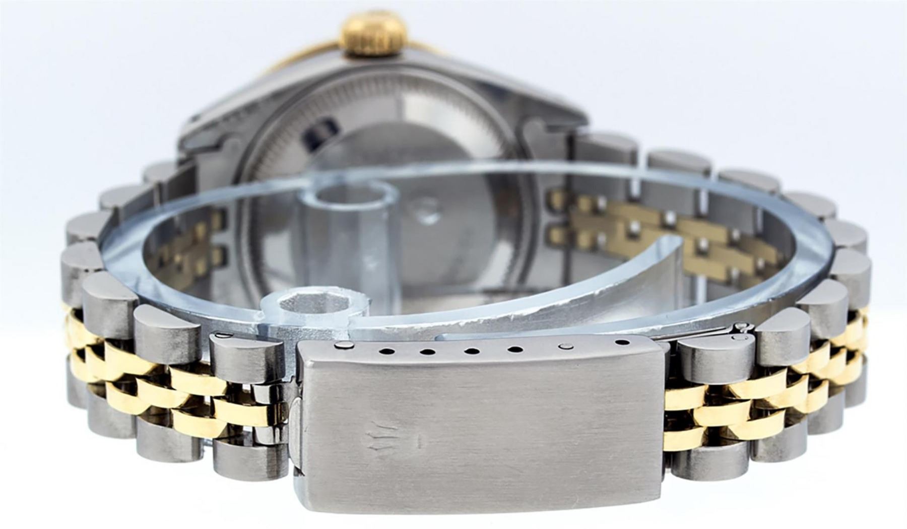 One Ladies Two Tone Rolex Datejust Polished, Serviced & Electronically Tested, Yellow Gold & Stainless Steel Case: 26mm, Yellow Gold Crown, Diamond Lugs: 24 Diamonds On Lugs, Clarity: SI-VS, Color: G to H. Custom Bezel: New 18K Yellow Gold Ruby Beadset Diamond Bezel, Diamond Count: 28 Diamonds + 4 Rubies On Bezel, Total Weight .70 Carat, Clarity: SI-VS, Color: G to H. Custom Crystal: New Synthetic Scratch Resistant Sapphire Cyclops Lens. Custom Hands: New Luminescent Hands. Movement: Automatic Winding Movement. Custom Refinished Dial: Red Vignette With String Single Cut Diamond Hour Markers, Diamond Count: 43 Diamonds On Dial, Clarity: SI-VS, Color: G to H. Date Window: 3 O'Clock Position Date Display, Model: Datejust. Condition: G-6 Extra Fine. Bracelet: Two Tone Yellow Gold & Stainless Steel Jubilee Band. Bright Polish. 6.0 Inch Length, Adjustable. Standard Clasp, With Rolex Logo. This Watch Has Been Serviced Time Tested And Is In Excellent Condition It Is Free Of All Scratches And Dents.