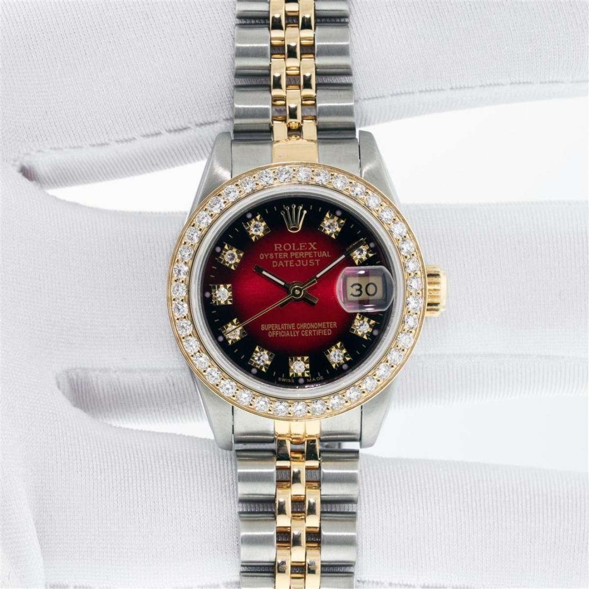 One Ladies Two Tone Rolex Datejust Polished, Serviced & Electronically Tested, Yellow Gold & Stainless Steel Case: 26mm, Yellow Gold Crown, Custom Bezel: New 18K 1ctw Yellow Gold Beadset Diamond Bezel, Diamond Count: 42 Diamonds, Total Weight 1.00 Carat, Clarity: SI-VS, Color: G to H. Custom Crystal: New Scratch Resistant Synthetic Sapphire Cyclops Lens. Custom Hands: New Luminescent Hands. Movement: Automatic Winding Movement. Custom Dial: Red Vignette VS Diamond Dial, Diamond Count: 10 Single Cut Diamonds in Dial, G To H In Color, VS Clarity. Date Window: 3 O'Clock Position Date Display, Model: Datejust, Condition: G-6 Extra Fine. Bracelet: Two Tone Yellow Gold & Stainless Steel Jubilee Band. Bright Polish. 6.0 Inch Length, Adjustable. Standard Clasp, With Rolex Logo. This Watch Has Been Serviced Time Tested And Is In Excellent Condition It Is Free Of All Scratches And Dents.