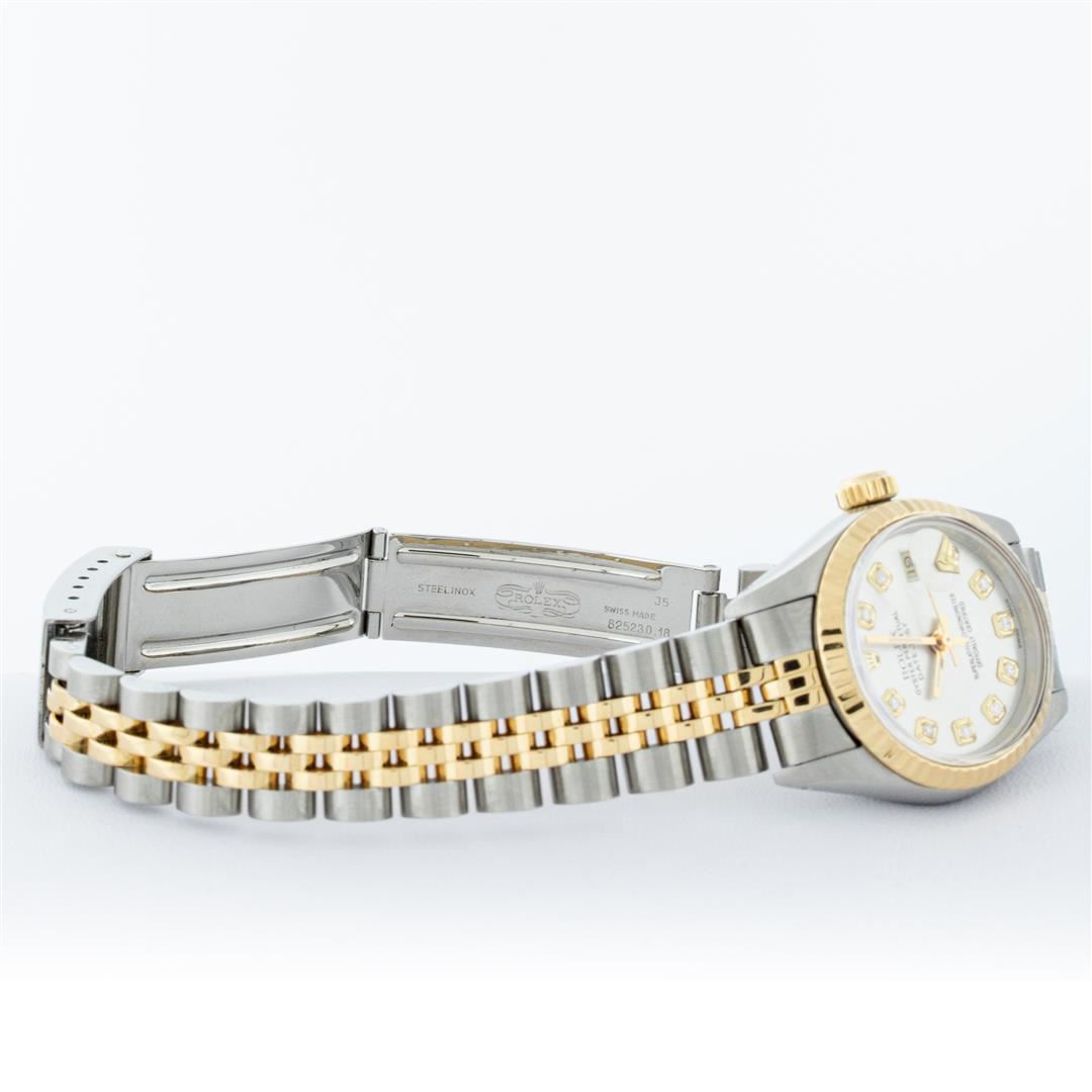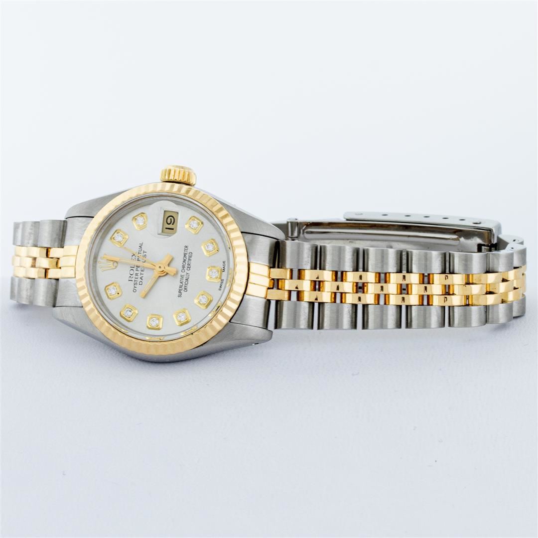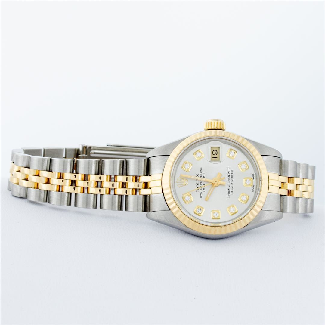One Ladies Two Tone Rolex Datejust Polished, Serviced & Electronically Tested, Yellow Gold & Stainless Steel Case: 26mm, Yellow Gold Crown, Bezel: Yellow Gold Fluted Bezel. Custom Crystal: New Acrylic Cyclops Lens. Custom Hands: New Luminescent Hands. Movement: Automatic Winding Movement. Custom Dial: Silver With Diamond Hour Markers, Diamond Count: 10 Diamonds, Color: G to H, Clarity: VS2-SI1. Date Window: 3 O'Clock Position Date Display, Model: Datejust. Condition: G-6 Extra Fine. Bracelet: Two Tone Yellow Gold & Stainless Steel Jubilee Band. Bright Polish. 6.0 Inch Length, Adjustable. Standard Clasp, With Rolex Logo. This Watch Has Been Serviced Time Tested And Is In Excellent Condition It Is Free Of All Scratches And Dents.