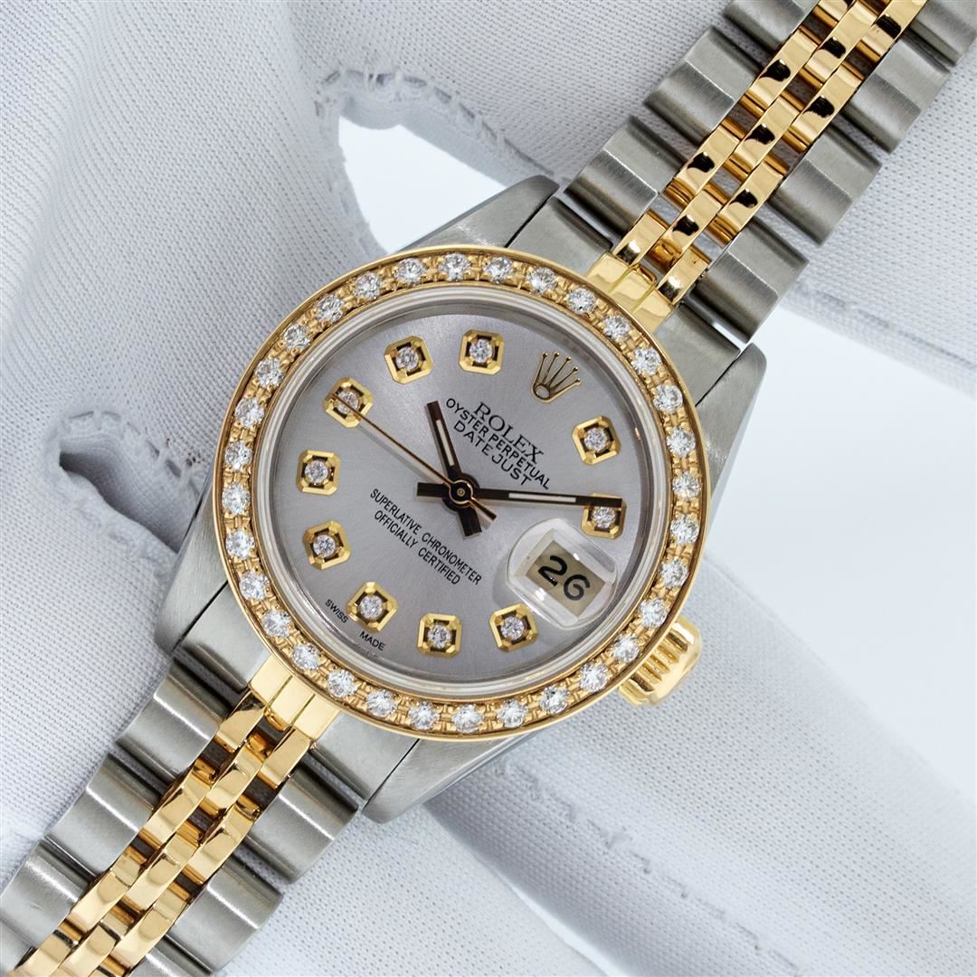 One Ladies Two Tone Rolex Datejust Polished, Serviced & Electronically Tested, Yellow Gold & Stainless Steel Case: 26mm, Yellow Gold Crown, Custom Bezel: 18K Yellow Gold Beadset Diamond Bezel, Diamond Count: 32 Diamonds Total Weight .70 Carat, Clarity: Si-VS, Color: G to H. Custom Crystal: Synthetic Sapphire Cyclops Lens. Custom Hands: New Luminescent Hands. Movement: Automatic Winding Movement. Custom Dial: Silver Dial Set With Diamond Hour Markers, 10 Diamond in Dial G To H In Color, Si-VS Clarity. Date Window: 3 O'Clock Position Date Display, Model: Datejust. Condition: G-6 Extra Fine. Bracelet: Two Tone Yellow Gold & Stainless Steel Jubilee. Bright Polish. 6.0 Inch Length, Adjustable. Standard Clasp, With Rolex Logo. This Watch Has Been Serviced Time Tested And Is In Excellent Condition It Is Free Of All Scratches And Dents. This Watch Comes With A Rolex Box.