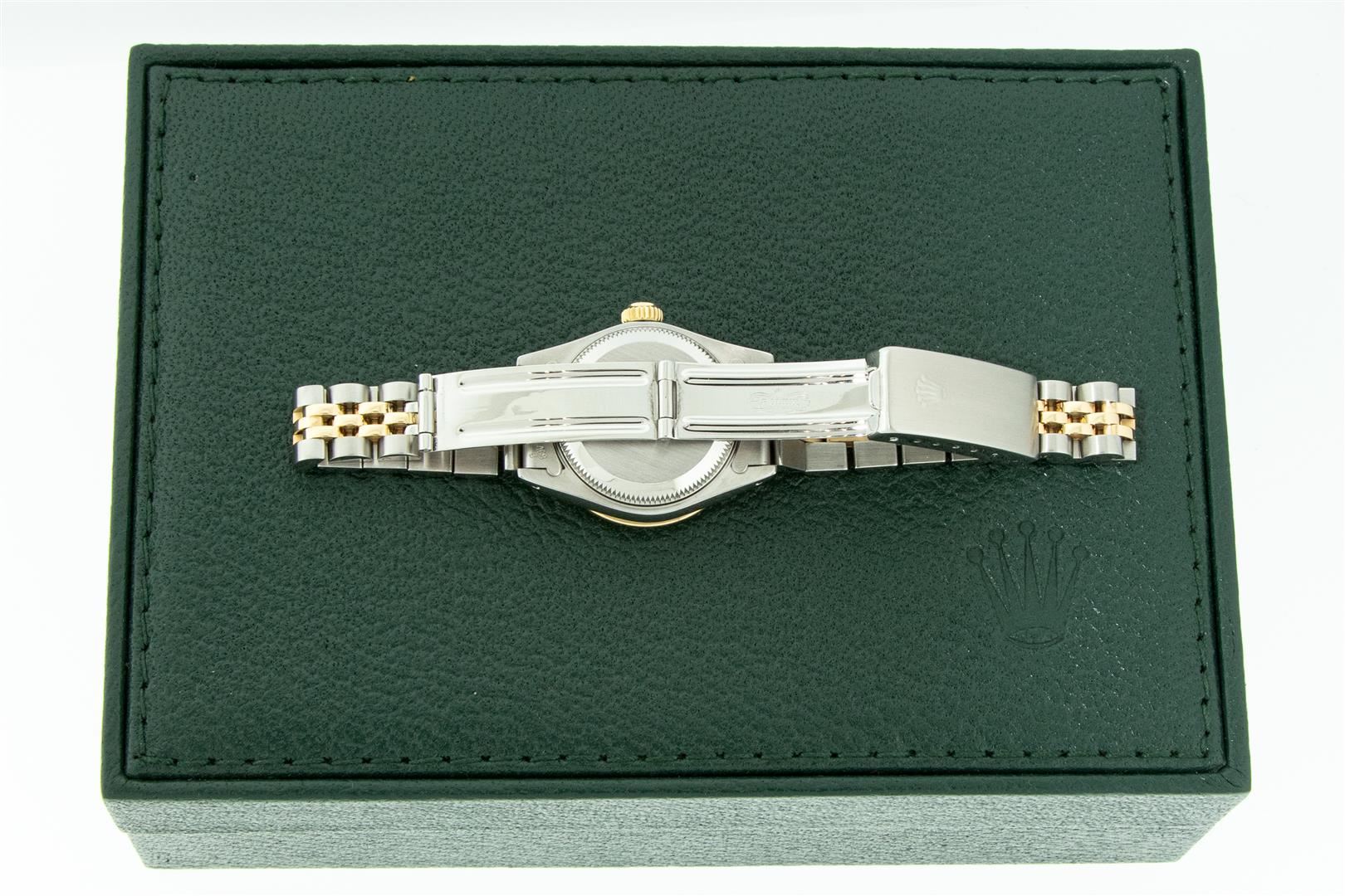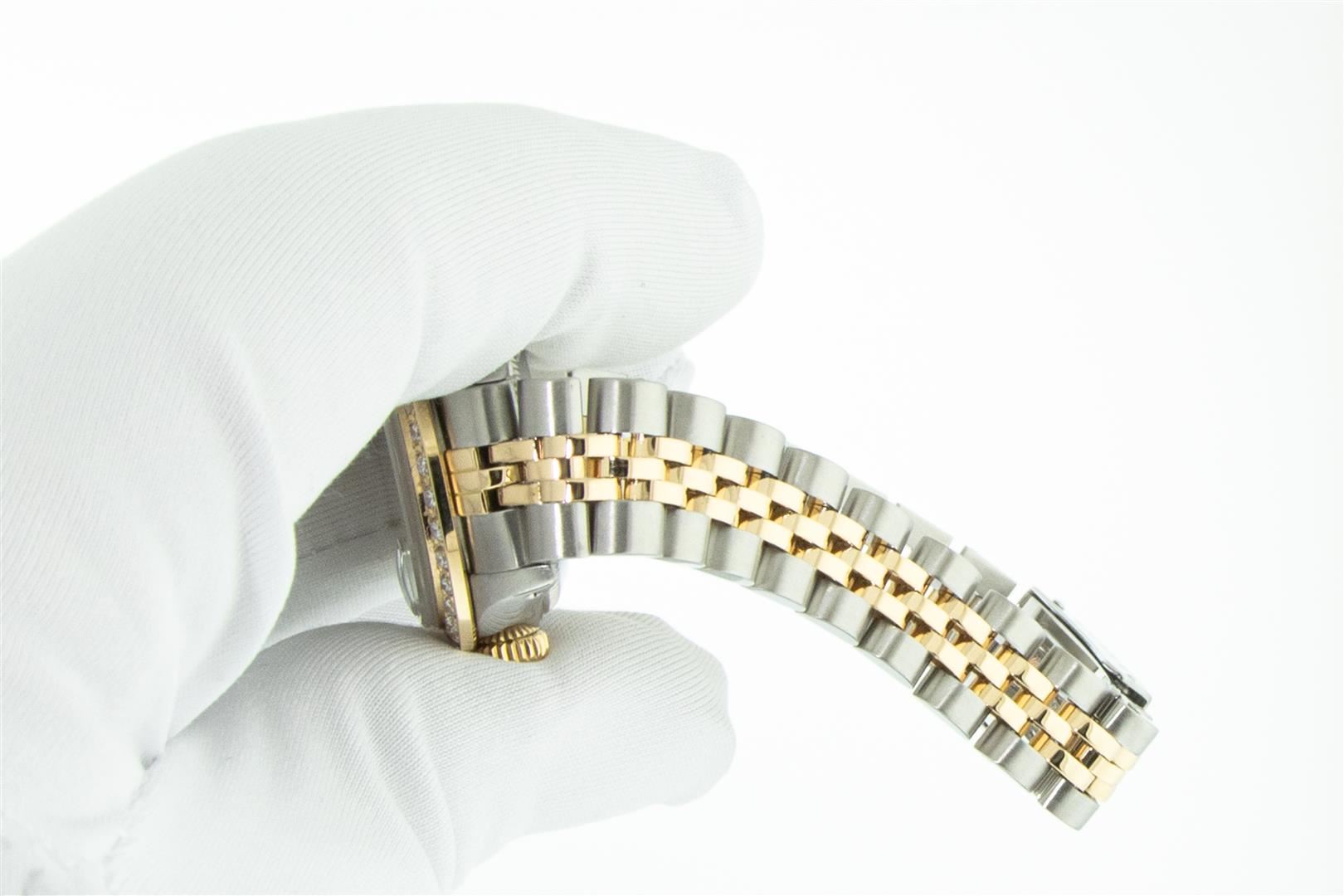 One Ladies Two Tone Rolex Datejust Polished, Serviced & Electronically Tested, Yellow Gold & Stainless Steel Case: 26mm, Yellow Gold Crown, Custom Bezel: 18K Yellow Gold Beadset Diamond Bezel, Diamond Count: 32 Diamonds Total Weight .70 Carat, Clarity: Si-VS, Color: G to H. Custom Crystal: Synthetic Sapphire Cyclops Lens. Custom Hands: New Luminescent Hands. Movement: Automatic Winding Movement. Custom Dial: Silver Dial Set With Diamond Hour Markers, 10 Diamond in Dial G To H In Color, Si-VS Clarity. Date Window: 3 O'Clock Position Date Display, Model: Datejust. Condition: G-6 Extra Fine. Bracelet: Two Tone Yellow Gold & Stainless Steel Jubilee. Bright Polish. 6.0 Inch Length, Adjustable. Standard Clasp, With Rolex Logo. This Watch Has Been Serviced Time Tested And Is In Excellent Condition It Is Free Of All Scratches And Dents. This Watch Comes With A Rolex Box.