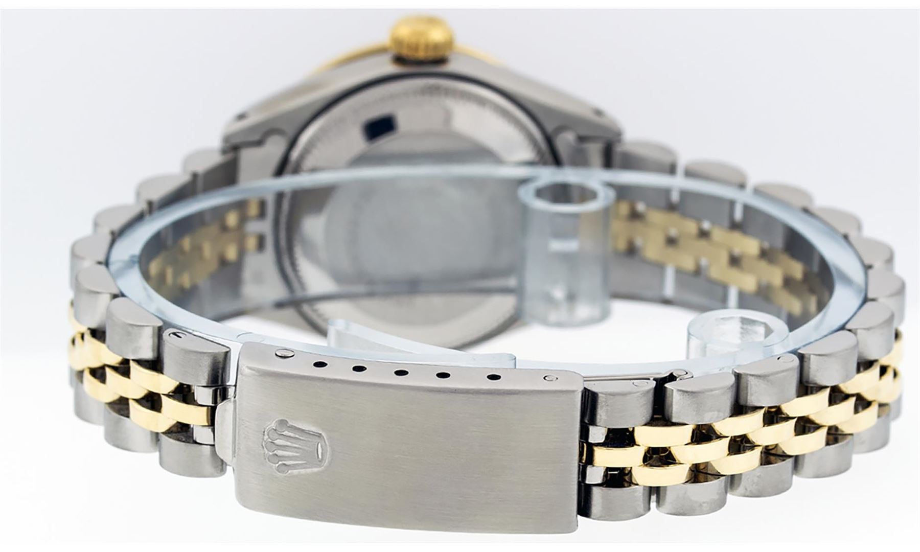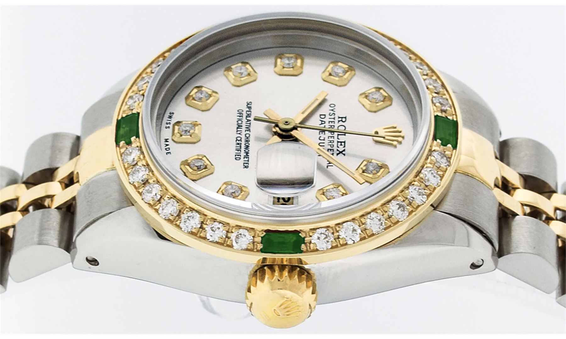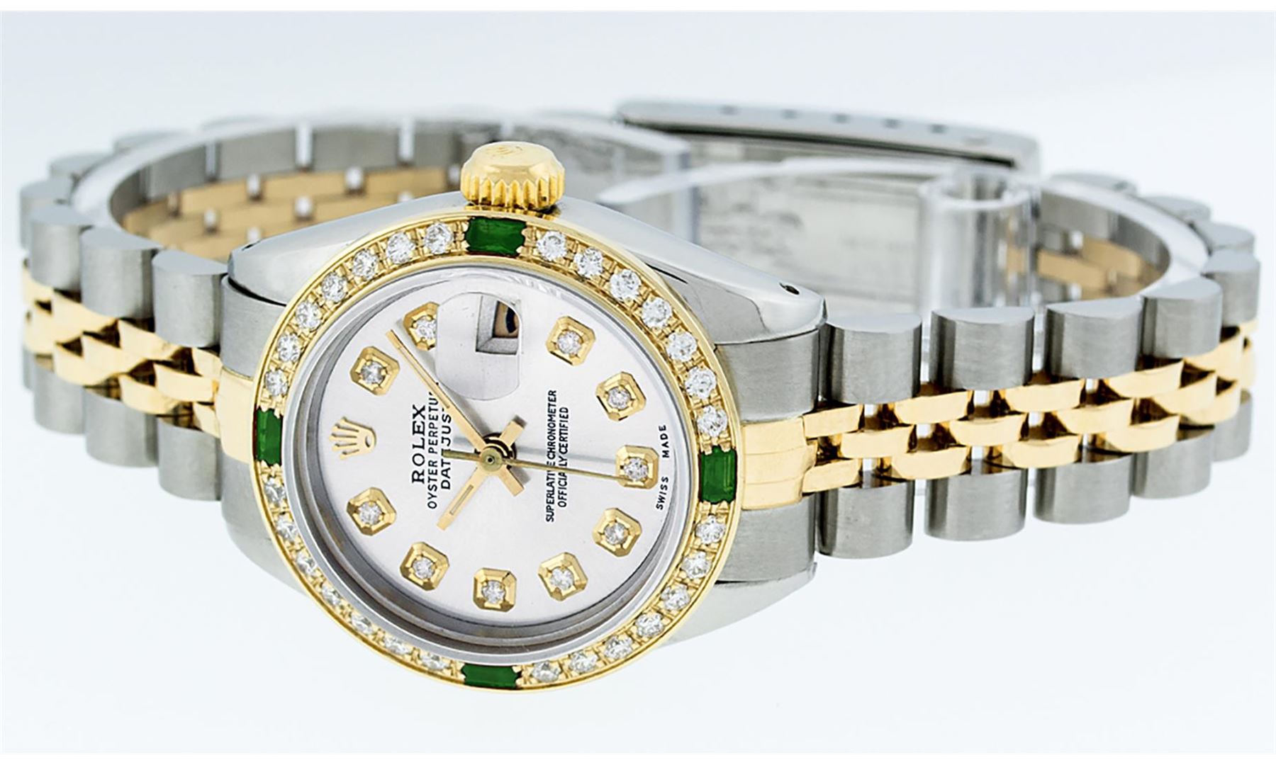 One Ladies 14K Two Tone Rolex Datejust Polished, Serviced & Electronically Tested, 14K Yellow Gold & Stainless Steel Case: 26mm, 14K Yellow Gold Crown, Custom Bezel: New 18K Yellow Gold Emerald Beadset Diamond Bezel, Diamond + Gem Count: 28 Diamonds + 4 Emeralds Total Weight .70 Carat, Clarity: SI-VS, Color: G to H. Custom Crystal: New Scratch Resistant Synthetic Sapphire Cyclops Lens. Custom Hands: New Luminescent Hands. Movement: Automatic Winding Movement Caliber 2030. Custom Dial: Silver Set With Diamond Hour Markers, Diamond Count: 10 Diamond in Dial, G To H In Color, SI-VS Clarity. Date Window: 3 O'Clock Position Date Display, Model: Datejust, Condition: G-6 Extra Fine. Bracelet: Two Tone 14K Yellow Gold & Stainless Steel Jubilee Band. Bright Polish. 6.0 Inch Length, Adjustable. Standard Clasp, With Rolex Logo. This Watch Has Been Serviced Time Tested And Is In Excellent Condition It Is Free Of All Scratches And Dents.