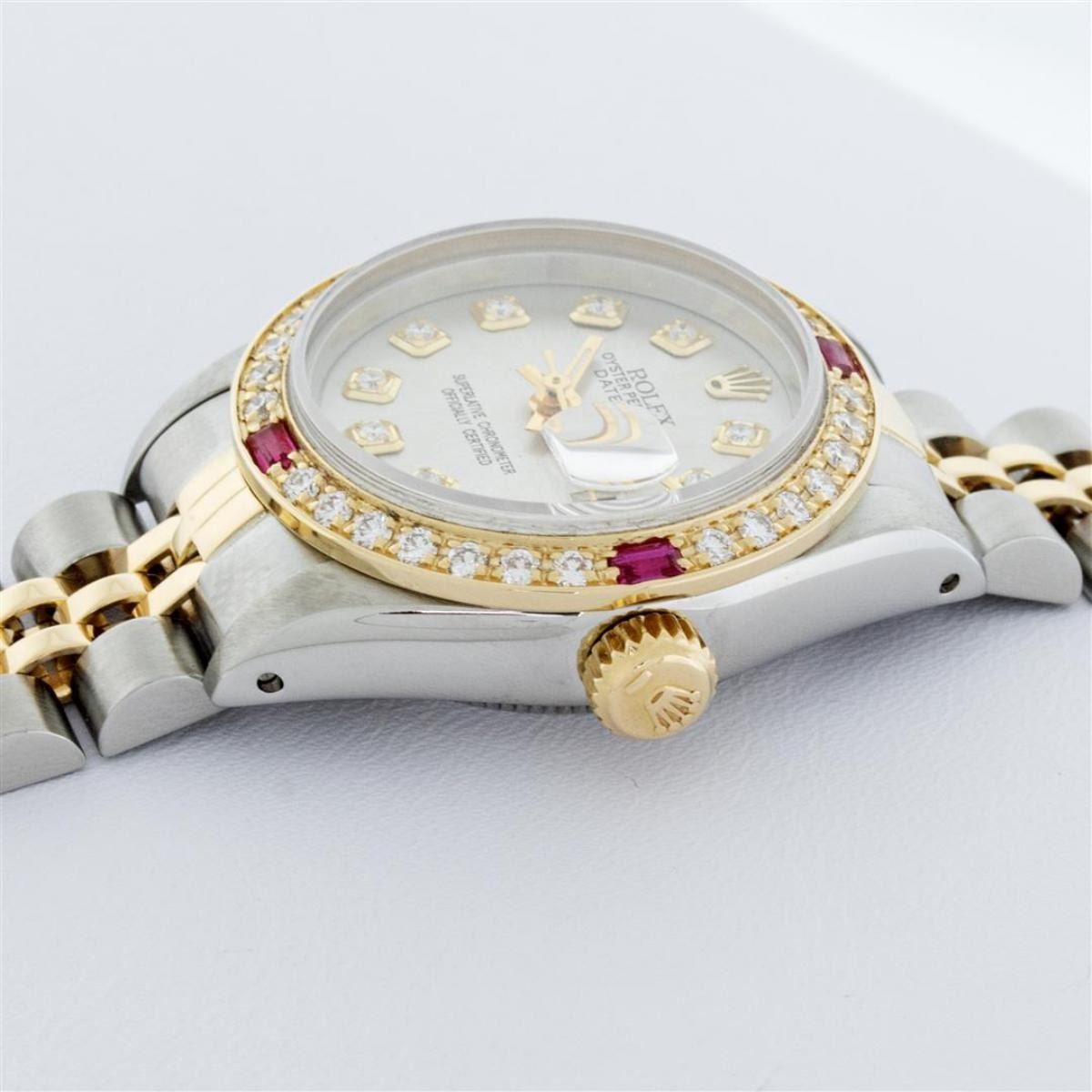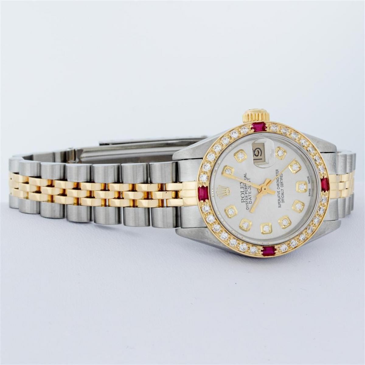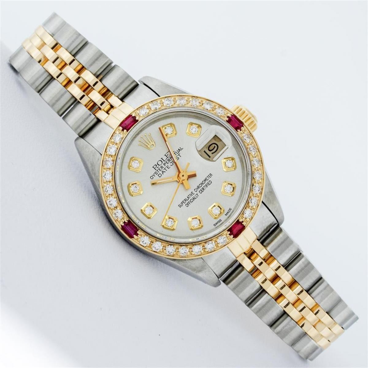 One Ladies Two Tone Rolex Datejust Polished, Serviced & Electronically Tested, Yellow Gold & Stainless Steel Case: 26mm, Yellow Gold Crown, Custom Bezel: New 18K Yellow Gold Ruby Beadset Diamond Bezel, Diamond + Gem Count: 28 Diamonds + 4 Rubies Total Weight .70 Carat, Clarity: Si-VS, Color: G to H. Custom Crystal: New Synthetic Sapphire Cyclops Lens. Custom Hands: New Luminescent Hands. Movement: Automatic Winding Movement. Custom Dial: Silver With Diamond Hour Markers, Diamond Count: 10 Diamonds On Dial, G To H In Color, Si-VS Clarity. Date Window: 3 O'Clock Position Date Display, Model: Datejust, Condition: G-6 Extra Fine. Bracelet: Two Tone Yellow Gold & Stainless Steel Jubilee. Bright Polish. 6.0 Inch Length, Adjustable. Standard Clasp, With Rolex Logo. This Watch Has Been Serviced Time Tested And Is In Excellent Condition It Is Free Of All Scratches And Dents.