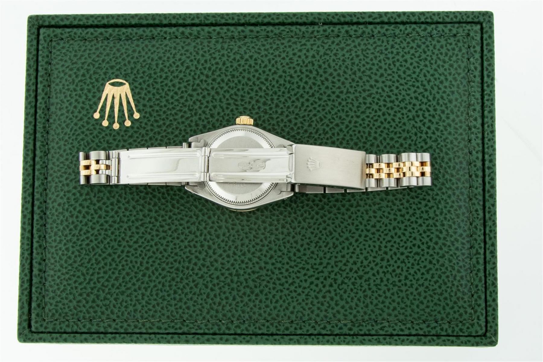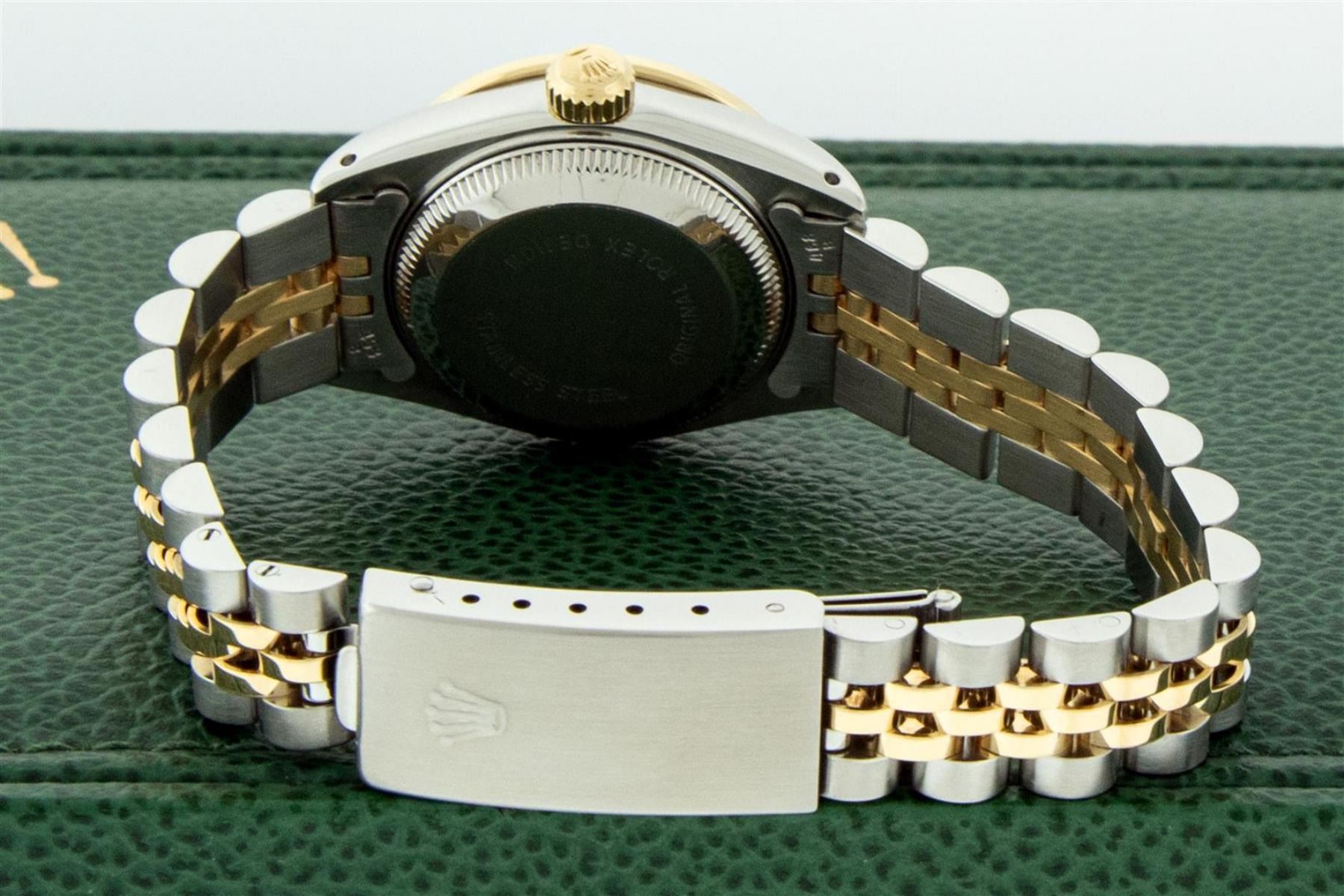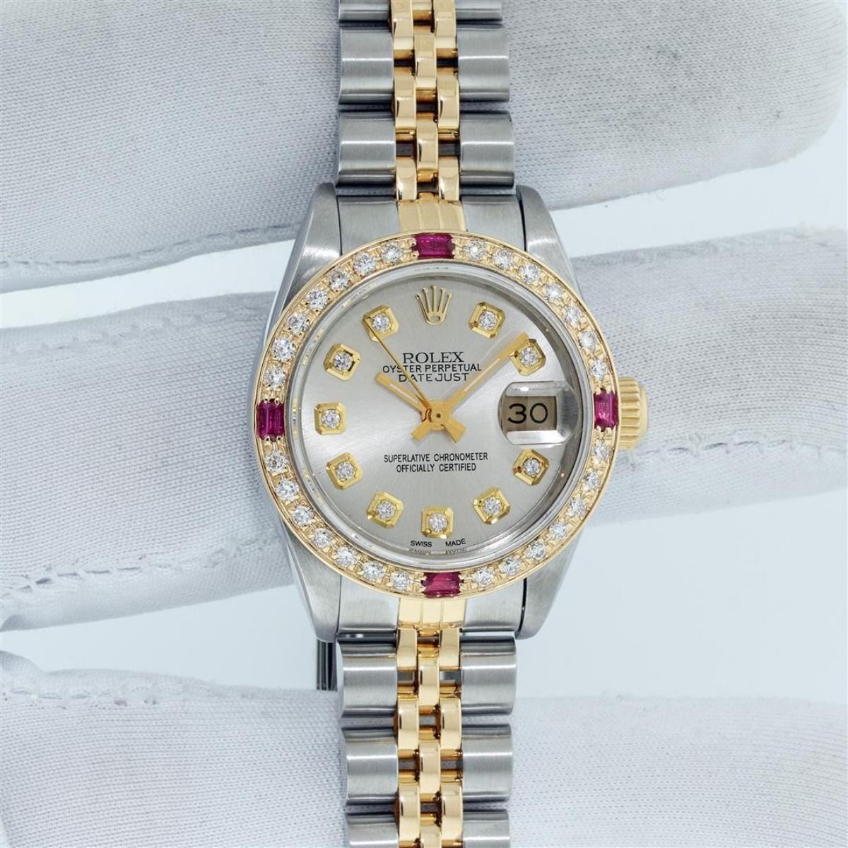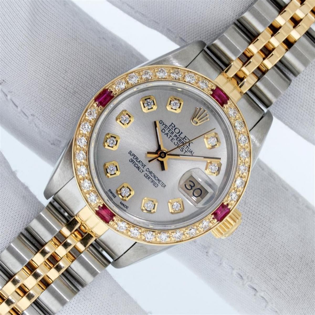 One Ladies Two Tone Rolex Datejust Polished, Serviced & Electronically Tested, Yellow Gold & Stainless Steel Case: 26mm, Yellow Gold Crown, Custom Bezel: New 18K Yellow Gold Ruby Beadset Diamond Bezel, Diamond + Gem Count: 28 Diamonds + 4 Rubies Total Weight .70 Carat, Clarity: Si-VS, Color: G to H. Custom Crystal: New Synthetic Sapphire Cyclops Lens. Custom Hands: New Luminescent Hands. Movement: Automatic Winding Movement. Custom Dial: Silver With Diamond Hour Markers, Diamond Count: 10 Diamonds On Dial, G To H In Color, Si-VS Clarity. Date Window: 3 O'Clock Position Date Display, Model: Datejust, Condition: G-6 Extra Fine. Bracelet: Two Tone Yellow Gold & Stainless Steel Jubilee. Bright Polish. 6.0 Inch Length, Adjustable. Standard Clasp, With Rolex Logo. This Watch Has Been Serviced Time Tested And Is In Excellent Condition It Is Free Of All Scratches And Dents.
