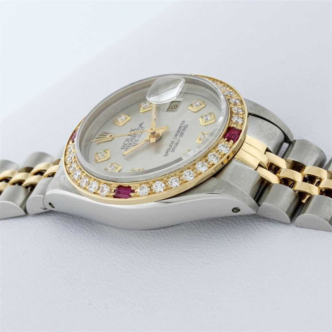 One Ladies Two Tone Rolex Datejust Polished, Serviced & Electronically Tested, Yellow Gold & Stainless Steel Case: 26mm, Yellow Gold Crown, Custom Bezel: New 18K Yellow Gold Ruby Beadset Diamond Bezel, Diamond + Gem Count: 28 Diamonds + 4 Rubies Total Weight .70 Carat, Clarity: Si-VS, Color: G to H. Custom Crystal: New Synthetic Sapphire Cyclops Lens. Custom Hands: New Luminescent Hands. Movement: Automatic Winding Movement. Custom Dial: Silver With Diamond Hour Markers, Diamond Count: 10 Diamonds On Dial, G To H In Color, Si-VS Clarity. Date Window: 3 O'Clock Position Date Display, Model: Datejust, Condition: G-6 Extra Fine. Bracelet: Two Tone Yellow Gold & Stainless Steel Jubilee. Bright Polish. 6.0 Inch Length, Adjustable. Standard Clasp, With Rolex Logo. This Watch Has Been Serviced Time Tested And Is In Excellent Condition It Is Free Of All Scratches And Dents.