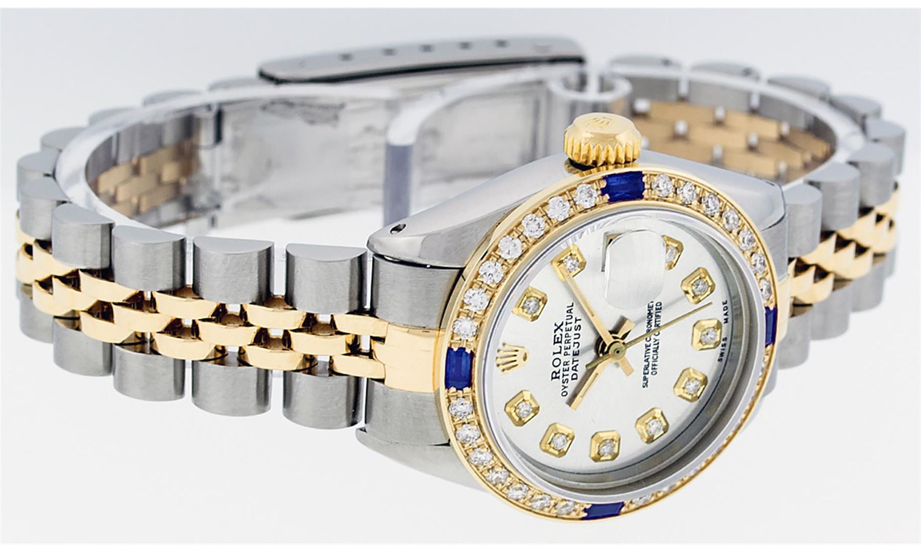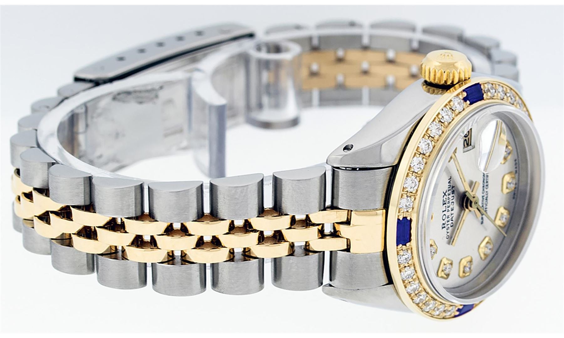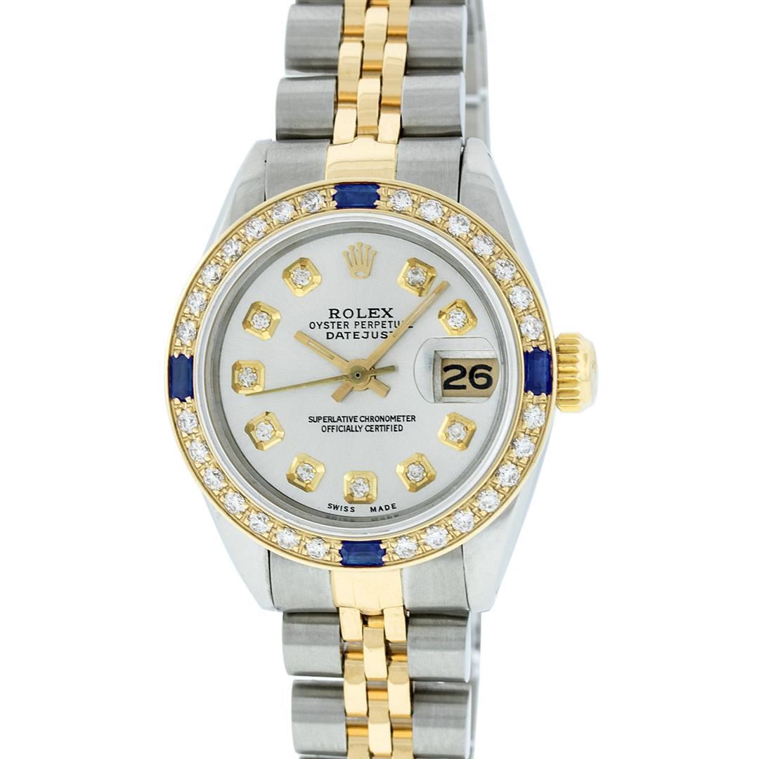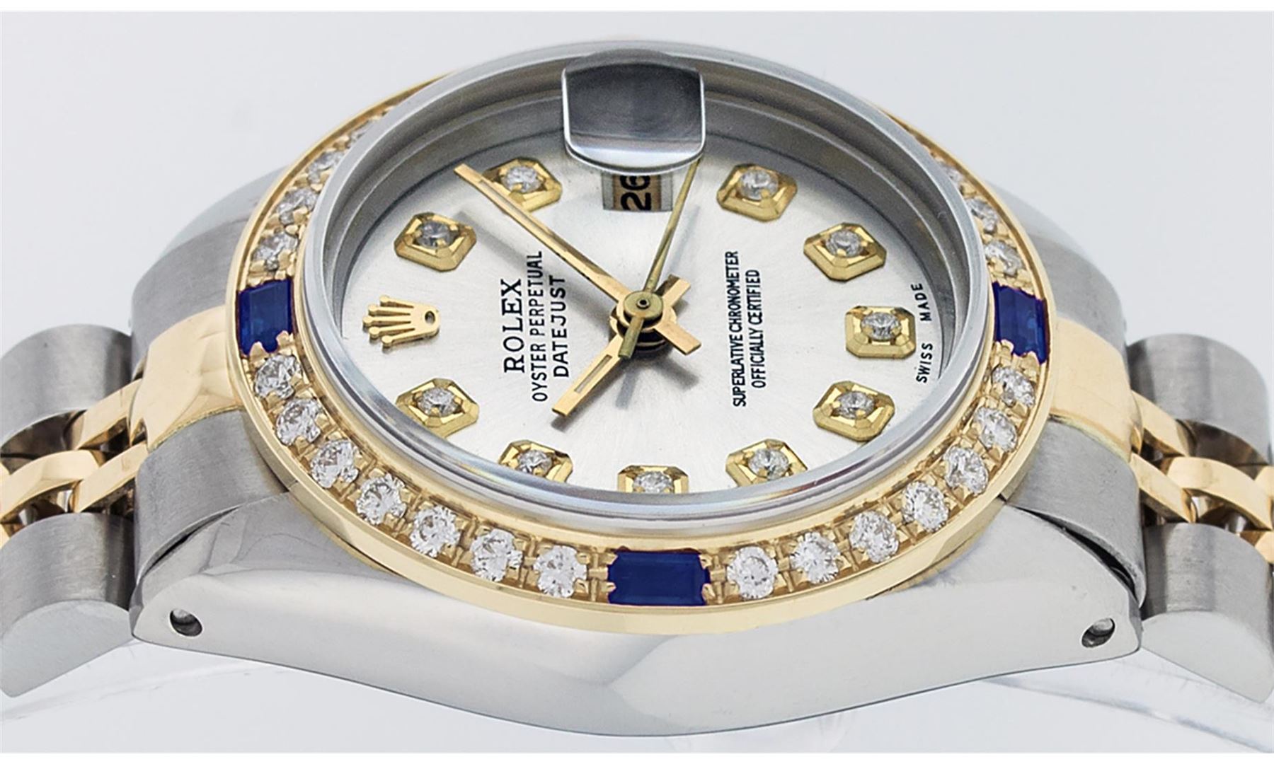 One Ladies 14K Two Tone Rolex Datejust Polished, Serviced & Electronically Tested, 14K Yellow Gold & Stainless Steel Case: 26mm, 14K Yellow Gold Crown, Custom Bezel: New 18K Yellow Gold Sapphire Beadset Diamond Bezel, Diamond + Gem Count: 28 Diamonds + 4 Sapphires, Total Weight .70 Carat, Clarity: SI-VS, Color: G to H. Custom Crystal: New Scratch Resistant Synthetic Sapphire Cyclops Lens. Custom Hands: New Luminescent Hands. Movement: Automatic Winding Movement Caliber 2030. Custom Dial: Silver Set With Diamond Hour Markers, Diamond Count: 10 Diamonds in Dial, G To H In Color, SI-VS Clarity. Date Window: 3 O'Clock Position Date Display, Model: Datejust, Condition: G-6 Extra Fine. Bracelet: Two Tone 14K Yellow Gold & Stainless Steel Jubilee Band. Bright Polish. 6.0 Inch Length, Adjustable. Standard Clasp, With Rolex Logo. This Watch Has Been Serviced Time Tested And Is In Excellent Condition It Is Free Of All Scratches And Dents.