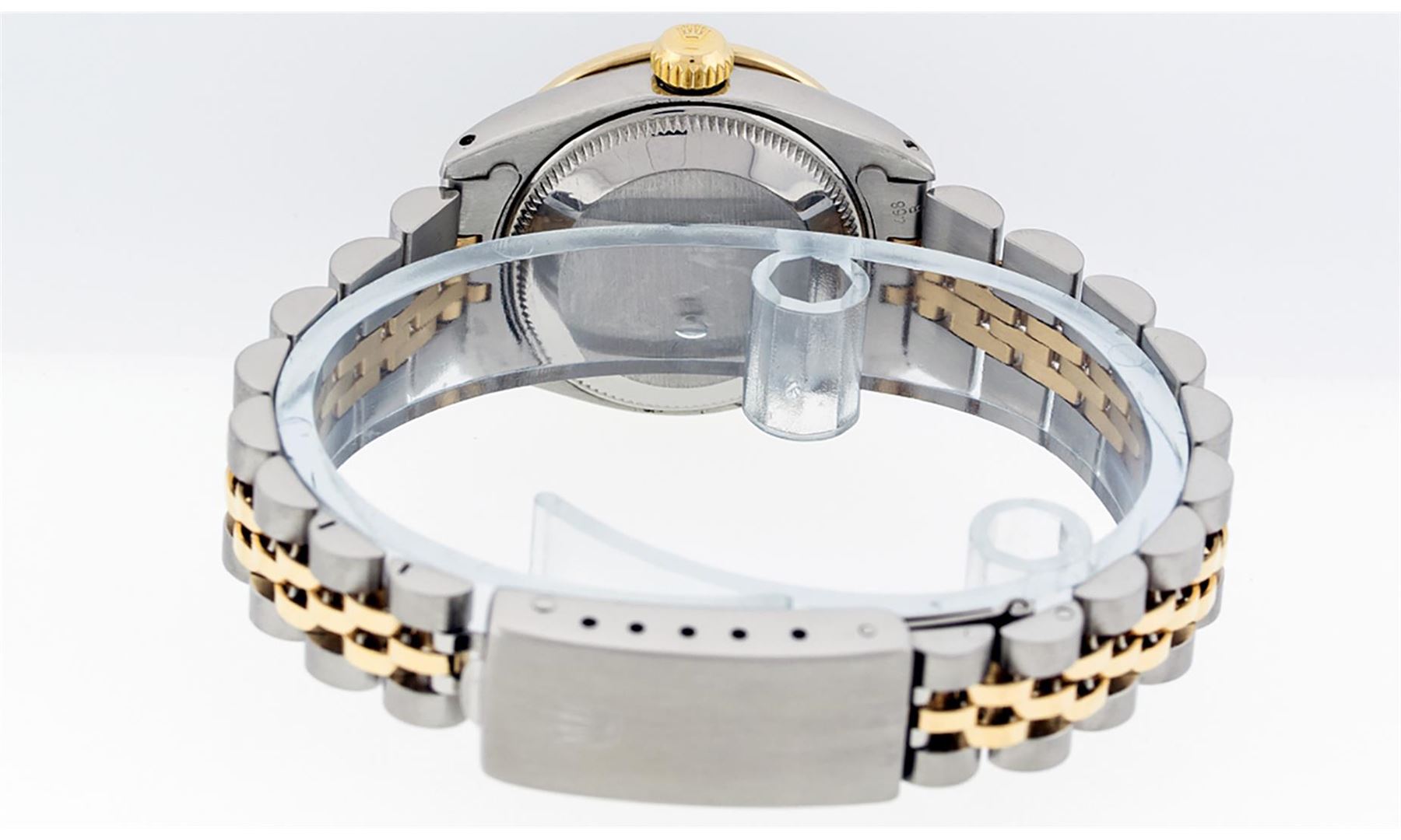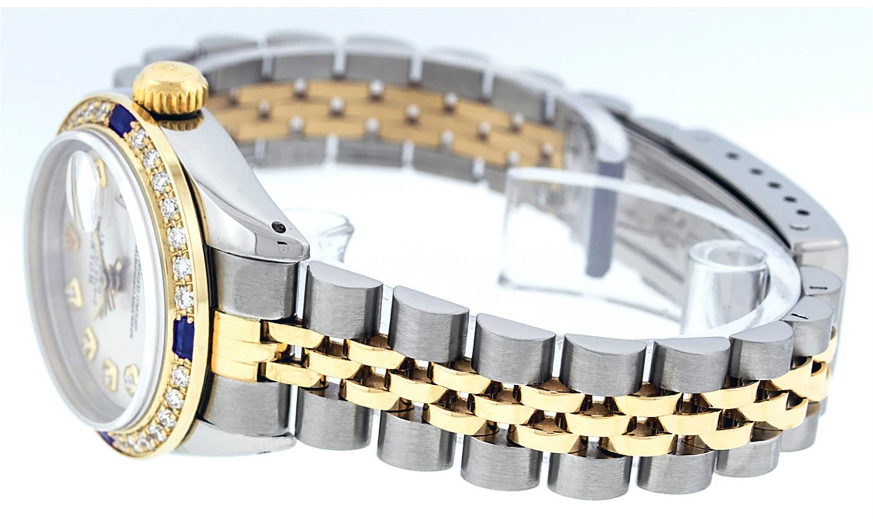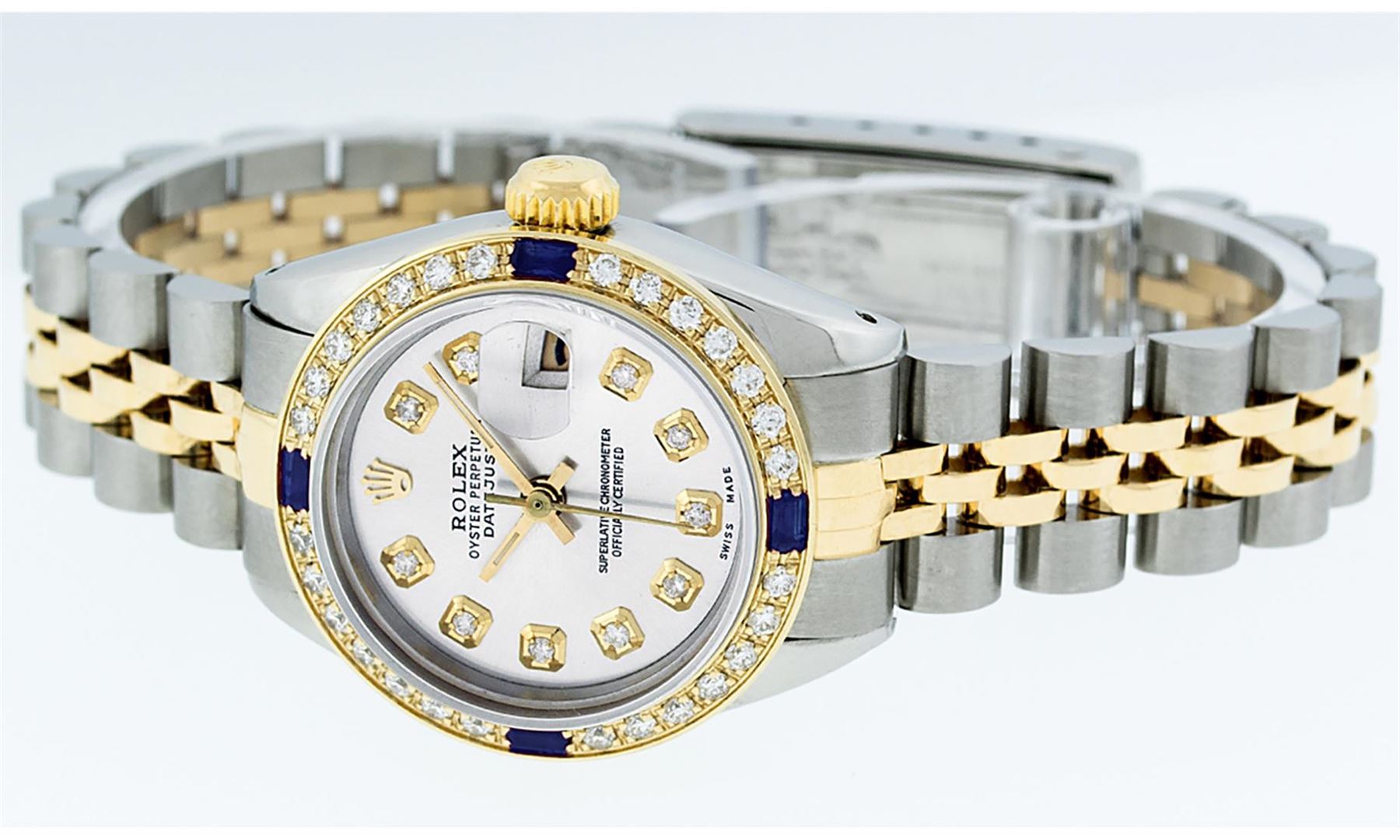 One Ladies 14K Two Tone Rolex Datejust Polished, Serviced & Electronically Tested, 14K Yellow Gold & Stainless Steel Case: 26mm, 14K Yellow Gold Crown, Custom Bezel: New 18K Yellow Gold Sapphire Beadset Diamond Bezel, Diamond + Gem Count: 28 Diamonds + 4 Sapphires, Total Weight .70 Carat, Clarity: SI-VS, Color: G to H. Custom Crystal: New Scratch Resistant Synthetic Sapphire Cyclops Lens. Custom Hands: New Luminescent Hands. Movement: Automatic Winding Movement Caliber 2030. Custom Dial: Silver Set With Diamond Hour Markers, Diamond Count: 10 Diamonds in Dial, G To H In Color, SI-VS Clarity. Date Window: 3 O'Clock Position Date Display, Model: Datejust, Condition: G-6 Extra Fine. Bracelet: Two Tone 14K Yellow Gold & Stainless Steel Jubilee Band. Bright Polish. 6.0 Inch Length, Adjustable. Standard Clasp, With Rolex Logo. This Watch Has Been Serviced Time Tested And Is In Excellent Condition It Is Free Of All Scratches And Dents.
