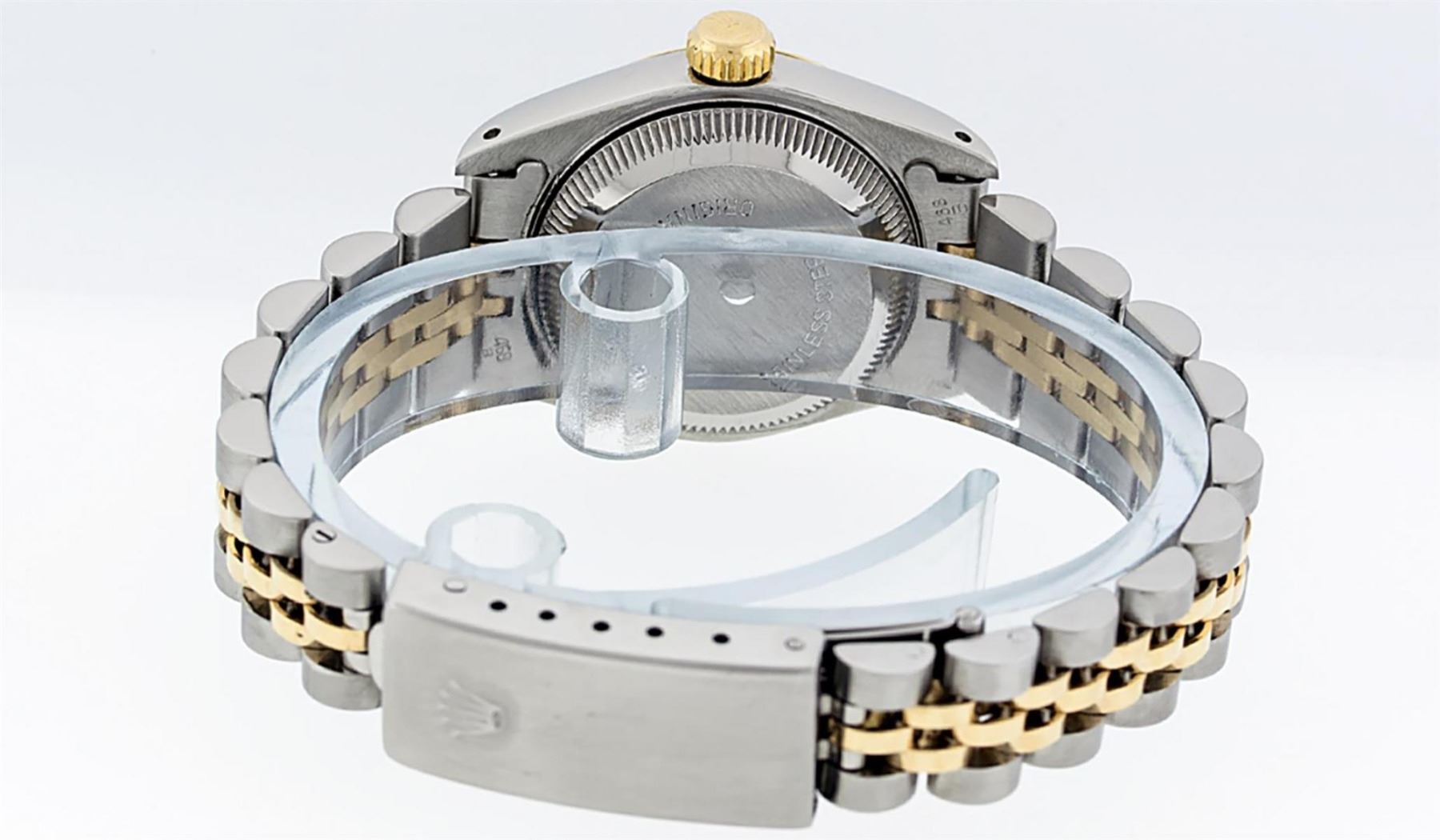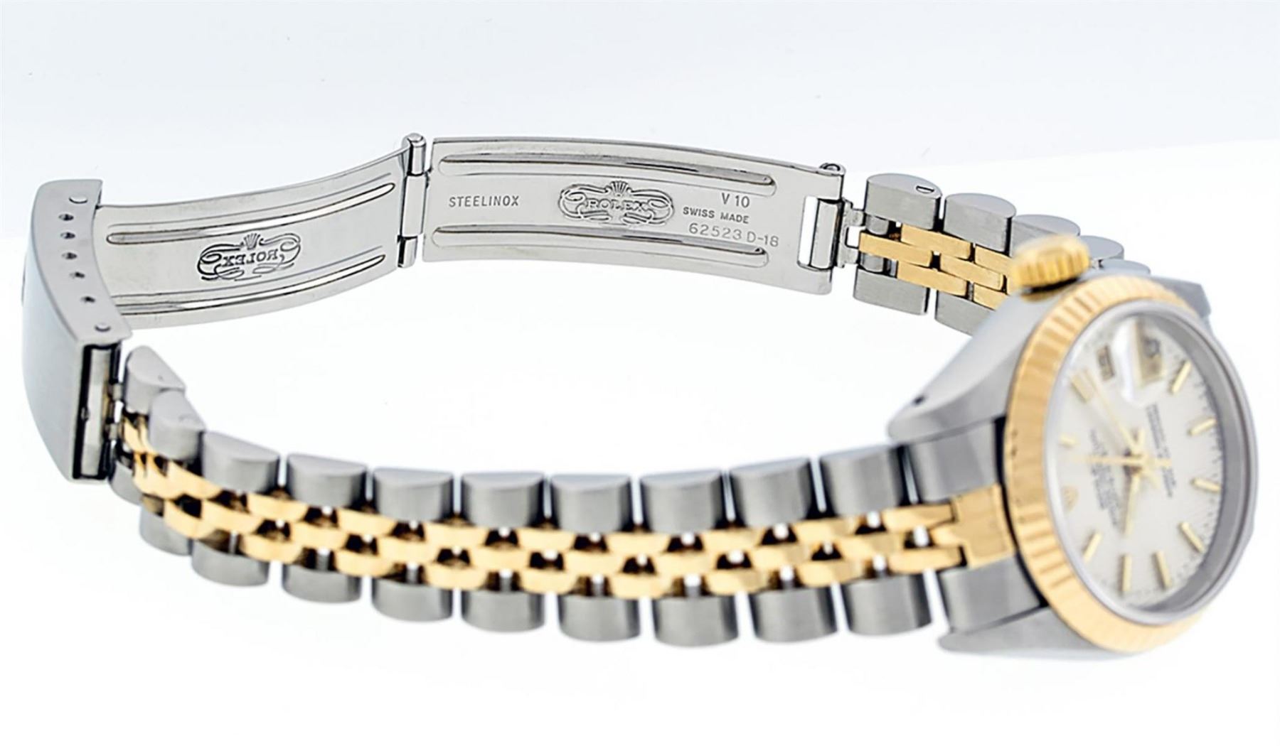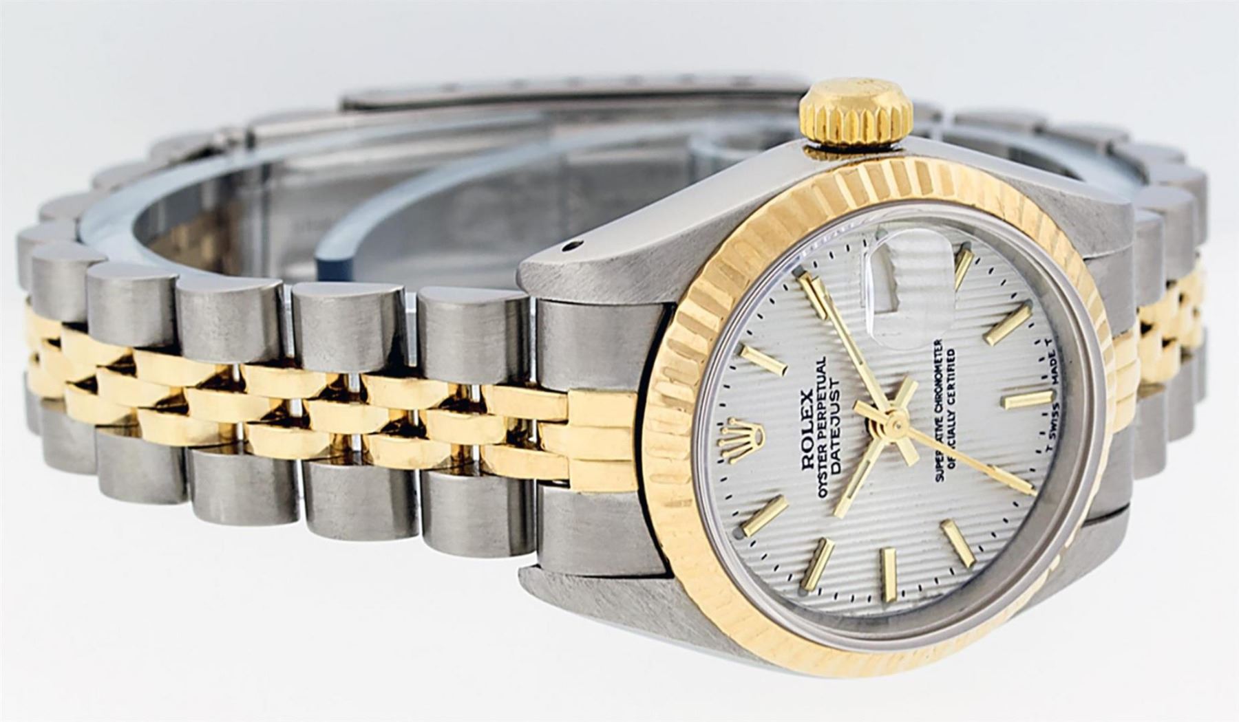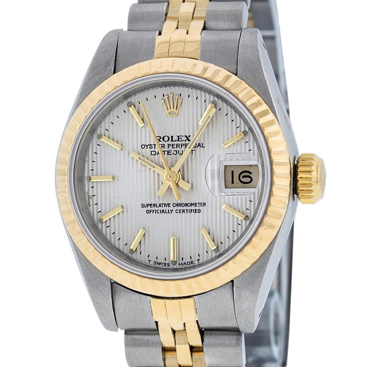 One Ladies Two Tone Rolex Datejust Polished, Serviced & Electronically Tested, Yellow Gold & Stainless Steel Case: 26mm, Yellow Gold Crown, Bezel: Yellow Gold Fluted Bezel. Custom Crystal: New Acrylic Cyclops Lens. Hands: Luminescent Hands. Movement: Automatic Winding Movement. Dial: Silver Index Tapestry With Dash Track & Lumi Dots. Date Window: 3 O'Clock Position Date Display, Model: Datejust. Condition: G-6 Extra Fine. Bracelet: Two Tone Yellow Gold & Stainless Steel Jubilee Band. Bright Polish. 6.0 Inch Length, Adjustable. Standard Clasp, With Rolex Logo. This Watch Has Been Serviced Time Tested And Is In Excellent Condition It Is Free Of All Scratches And Dents.