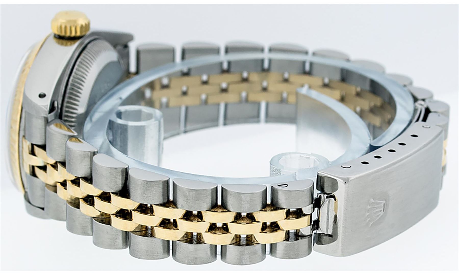 One Ladies Two Tone Rolex Datejust Polished, Serviced & Electronically Tested, Yellow Gold & Stainless Steel Case: 26mm, Yellow Gold Crown, Bezel: Yellow Gold Fluted Bezel. Custom Crystal: New Acrylic Cyclops Lens. Hands: Luminescent Hands. Movement: Automatic Winding Movement. Dial: Silver Index Tapestry With Dash Track & Lumi Dots. Date Window: 3 O'Clock Position Date Display, Model: Datejust. Condition: G-6 Extra Fine. Bracelet: Two Tone Yellow Gold & Stainless Steel Jubilee Band. Bright Polish. 6.0 Inch Length, Adjustable. Standard Clasp, With Rolex Logo. This Watch Has Been Serviced Time Tested And Is In Excellent Condition It Is Free Of All Scratches And Dents.