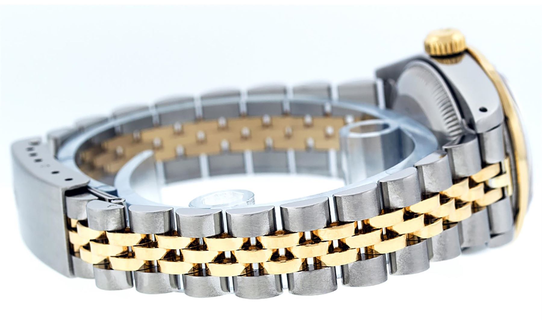 One Ladies Two Tone Rolex Datejust Polished, Serviced & Electronically Tested, Yellow Gold & Stainless Steel Case: 26mm, Yellow Gold Crown, Bezel: Yellow Gold Fluted Bezel. Custom Crystal: New Acrylic Cyclops Lens. Custom Hands: New Luminescent Hands. Movement: Automatic Winding Movement. Custom Dial: Slate Grey With Diamond Hour Markers, Diamond Count: 10 Diamonds, Color: G to H, Clarity: VS2-SI1. Date Window: 3 O'Clock Position Date Display, Model: Datejust. Condition: G-6 Extra Fine. Bracelet: Two Tone Yellow Gold & Stainless Steel Jubilee Band. Bright Polish. 6.0 Inch Length, Adjustable. Standard Clasp, With Rolex Logo. This Watch Has Been Serviced Time Tested And Is In Excellent Condition It Is Free Of All Scratches And Dents.