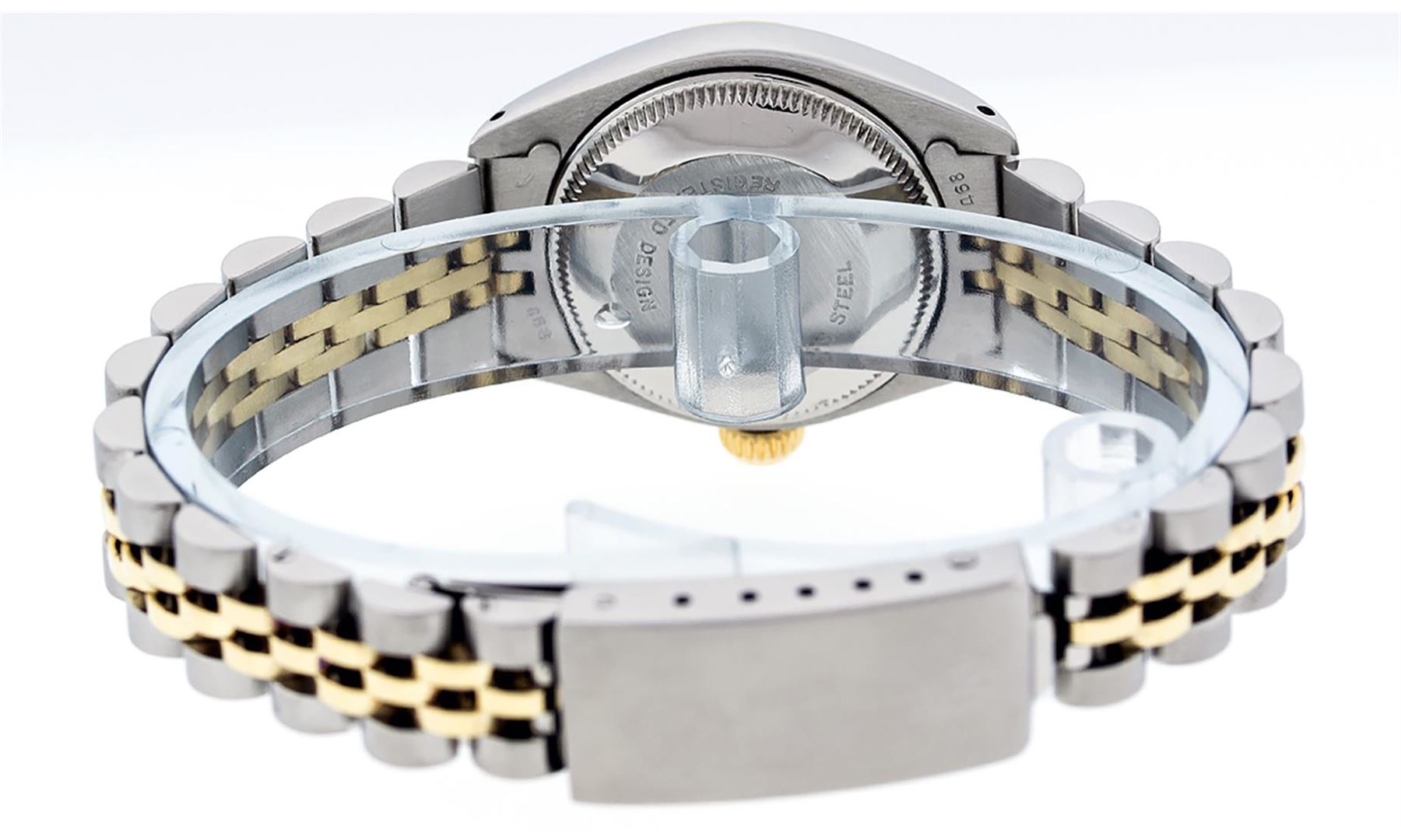 One Ladies Two Tone Rolex Datejust Polished, Serviced & Electronically Tested, Yellow Gold & Stainless Steel Case: 26mm, Yellow Gold Crown, Bezel: Yellow Gold Fluted Bezel. Custom Crystal: New Acrylic Cyclops Lens. Custom Hands: New Luminescent Hands. Movement: Automatic Winding Movement. Custom Dial: Slate Grey With Diamond Hour Markers, Diamond Count: 10 Diamonds, Color: G to H, Clarity: VS2-SI1. Date Window: 3 O'Clock Position Date Display, Model: Datejust. Condition: G-6 Extra Fine. Bracelet: Two Tone Yellow Gold & Stainless Steel Jubilee Band. Bright Polish. 6.0 Inch Length, Adjustable. Standard Clasp, With Rolex Logo. This Watch Has Been Serviced Time Tested And Is In Excellent Condition It Is Free Of All Scratches And Dents.