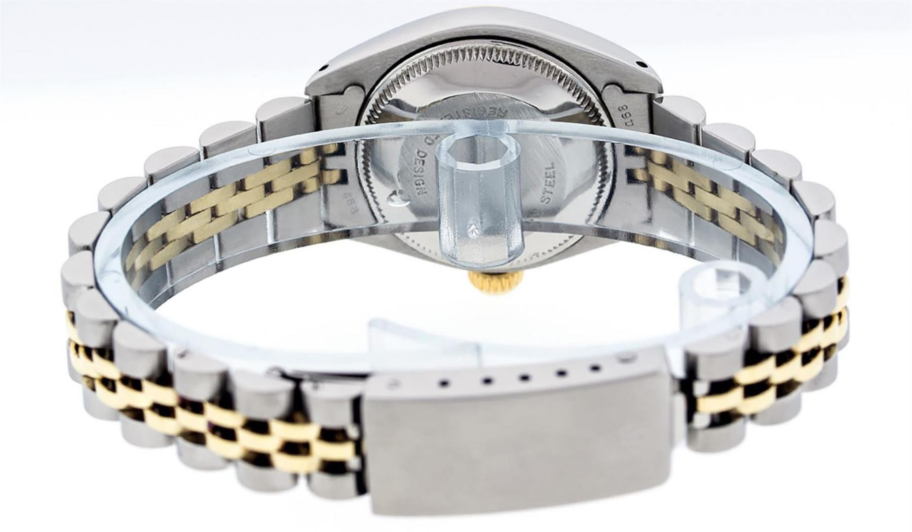 One Ladies Two Tone Rolex Datejust Polished, Serviced & Electronically Tested, Yellow Gold & Stainless Steel Case: 26mm, Yellow Gold Crown, Bezel: Yellow Gold Fluted Bezel. Custom Crystal: New Acrylic Cyclops Lens. Custom Hands: New Luminescent Hands. Movement: Automatic Winding Movement. Custom Dial: Slate Grey With Diamond Hour Markers, Diamond Count: 10 Diamonds, Color: G to H, Clarity: VS2-SI1. Date Window: 3 O'Clock Position Date Display, Model: Datejust. Condition: G-6 Extra Fine. Bracelet: Two Tone Yellow Gold & Stainless Steel Jubilee Band. Bright Polish. 6.0 Inch Length, Adjustable. Standard Clasp, With Rolex Logo. This Watch Has Been Serviced Time Tested And Is In Excellent Condition It Is Free Of All Scratches And Dents.