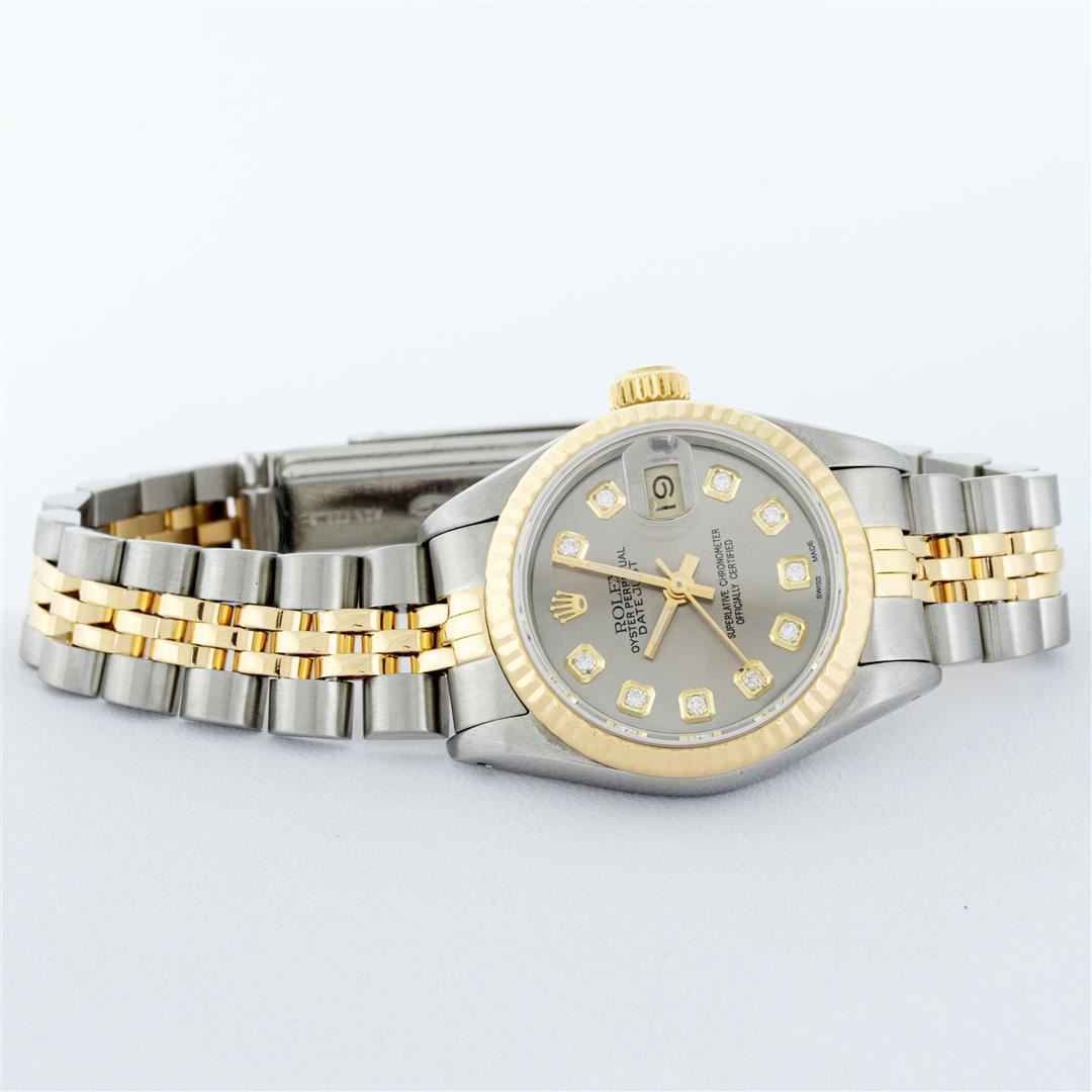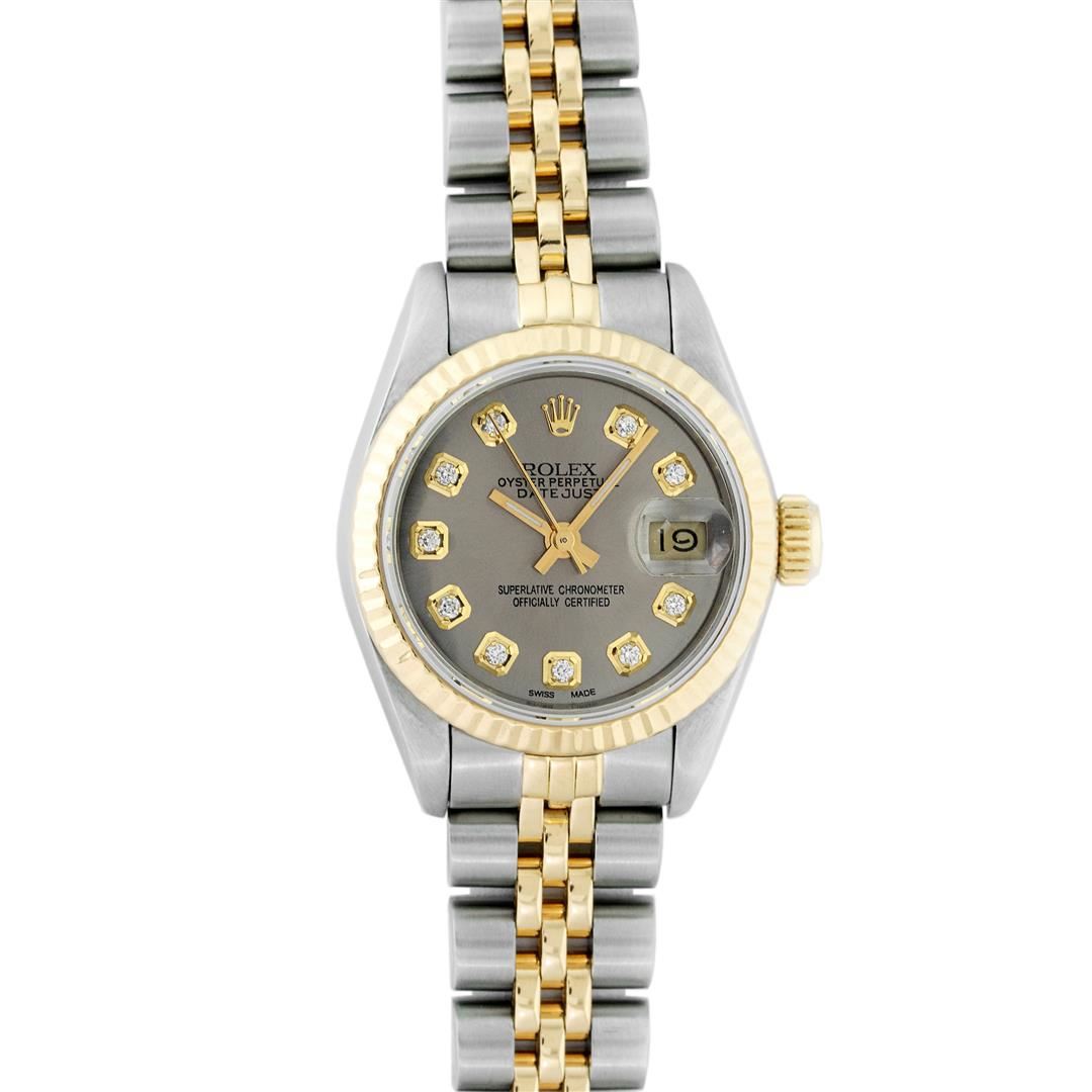 One Ladies Pre Owned Two Tone Rolex Datejust Polished, Serviced & Electronically Tested, Rolex Yellow Gold & Stainless Steel Case: 26mm, Rolex Yellow Gold Crown, Rolex Bezel: Yellow Gold Fluted Bezel. Custom Crystal: New Acrylic Cyclops Lens. Custom Hands: New Luminescent Hands. Rolex Movement: Automatic Winding Movement. Custom Dial: Refinish To Slate Grey With Diamond Hour Markers, Diamond Count: 10 Diamonds, Color: G to H, Clarity: VS2-SI1. Date Window: 3 O'Clock Position Date Display, Model: Datejust. Condition: G-6 Extra Fine. Rolex Bracelet: Two Tone Yellow Gold & Stainless Steel Jubilee Band. Bright Polish. 6.0 Inch Length, Adjustable. Standard Clasp, With Rolex Logo. This Watch Has Been Serviced Time Tested And Is In Excellent Condition It Is Free Of All Scratches And Dents.