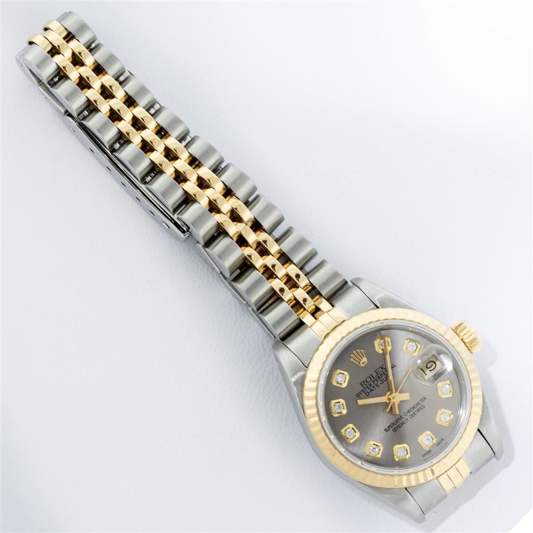 One Ladies Pre Owned Two Tone Rolex Datejust Polished, Serviced & Electronically Tested, Rolex Yellow Gold & Stainless Steel Case: 26mm, Rolex Yellow Gold Crown, Rolex Bezel: Yellow Gold Fluted Bezel. Custom Crystal: New Acrylic Cyclops Lens. Custom Hands: New Luminescent Hands. Rolex Movement: Automatic Winding Movement. Custom Dial: Refinish To Slate Grey With Diamond Hour Markers, Diamond Count: 10 Diamonds, Color: G to H, Clarity: VS2-SI1. Date Window: 3 O'Clock Position Date Display, Model: Datejust. Condition: G-6 Extra Fine. Rolex Bracelet: Two Tone Yellow Gold & Stainless Steel Jubilee Band. Bright Polish. 6.0 Inch Length, Adjustable. Standard Clasp, With Rolex Logo. This Watch Has Been Serviced Time Tested And Is In Excellent Condition It Is Free Of All Scratches And Dents.