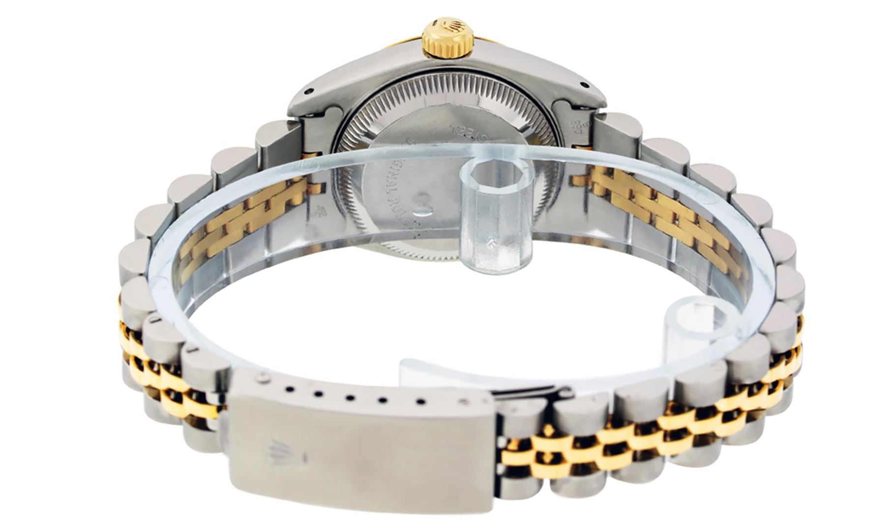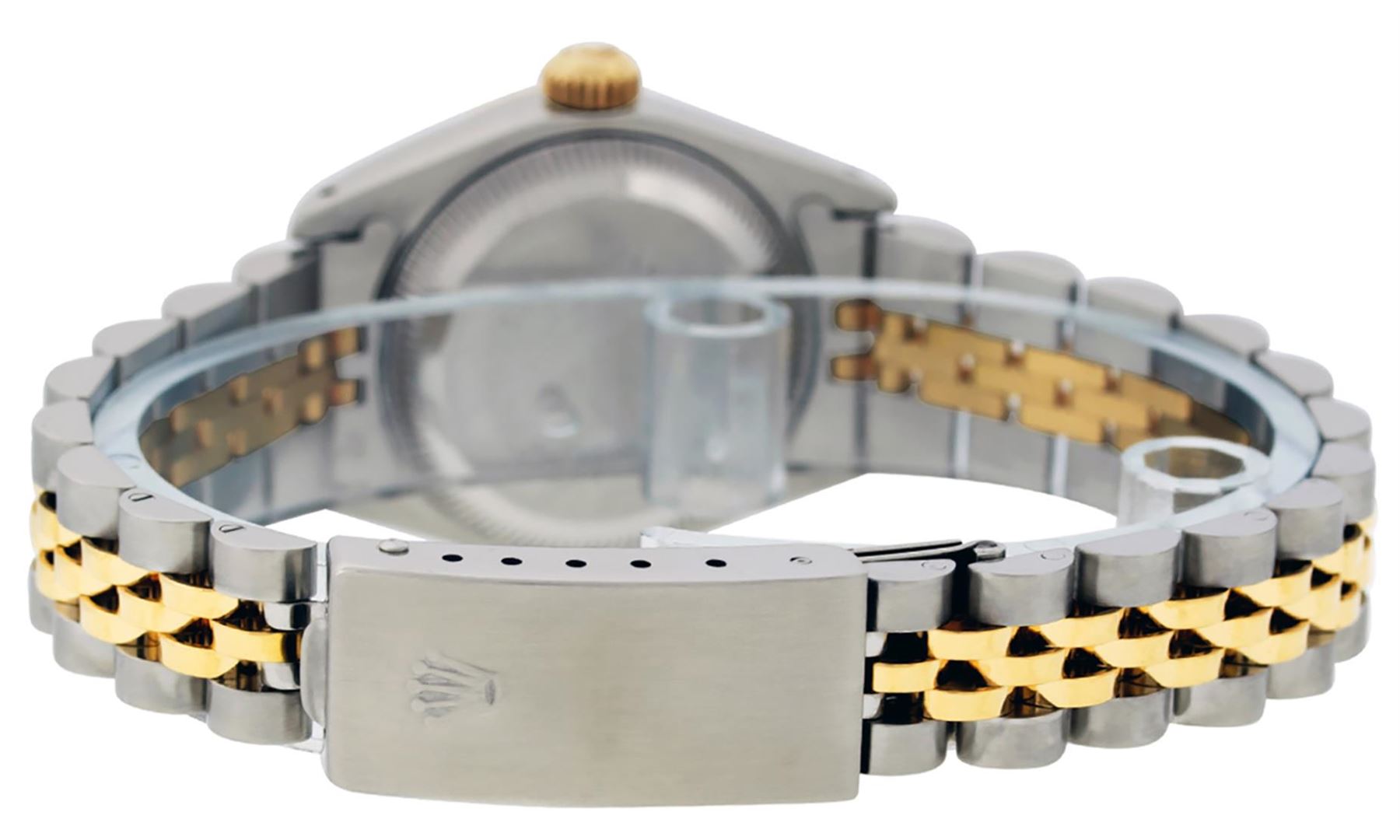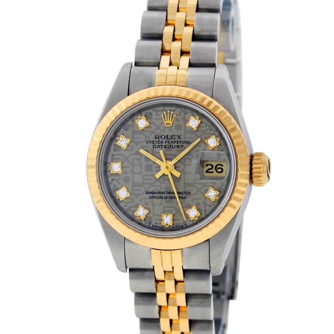 One Ladies Two Tone Rolex Datejust Polished, Serviced & Electronically Tested, Yellow Gold & Stainless Steel Case: 26mm, Yellow Gold Crown, Bezel: Yellow Gold Fluted Bezel. Custom Crystal: New Acrylic Cyclops Lens. Custom Hands: New Luminescent Hands. Movement: Automatic Winding Movement. Custom Dial: Slate Grey Jubilee With Single Cut Diamond Hour Markers, Diamond Count: 10 Diamonds On Dial, Color: G to H, Clarity: VS2-SI1. Date Window: 3 O'Clock Position Date Display, Model: Datejust. Condition: G-6 Extra Fine. Bracelet: Two Tone Yellow Gold & Stainless Steel Jubilee. Bright Polish. 6.0 Inch Length, Adjustable. Standard Clasp, With Rolex Logo. This Watch Has Been Serviced Time Tested And Is In Excellent Condition It Is Free Of All Scratches And Dents.