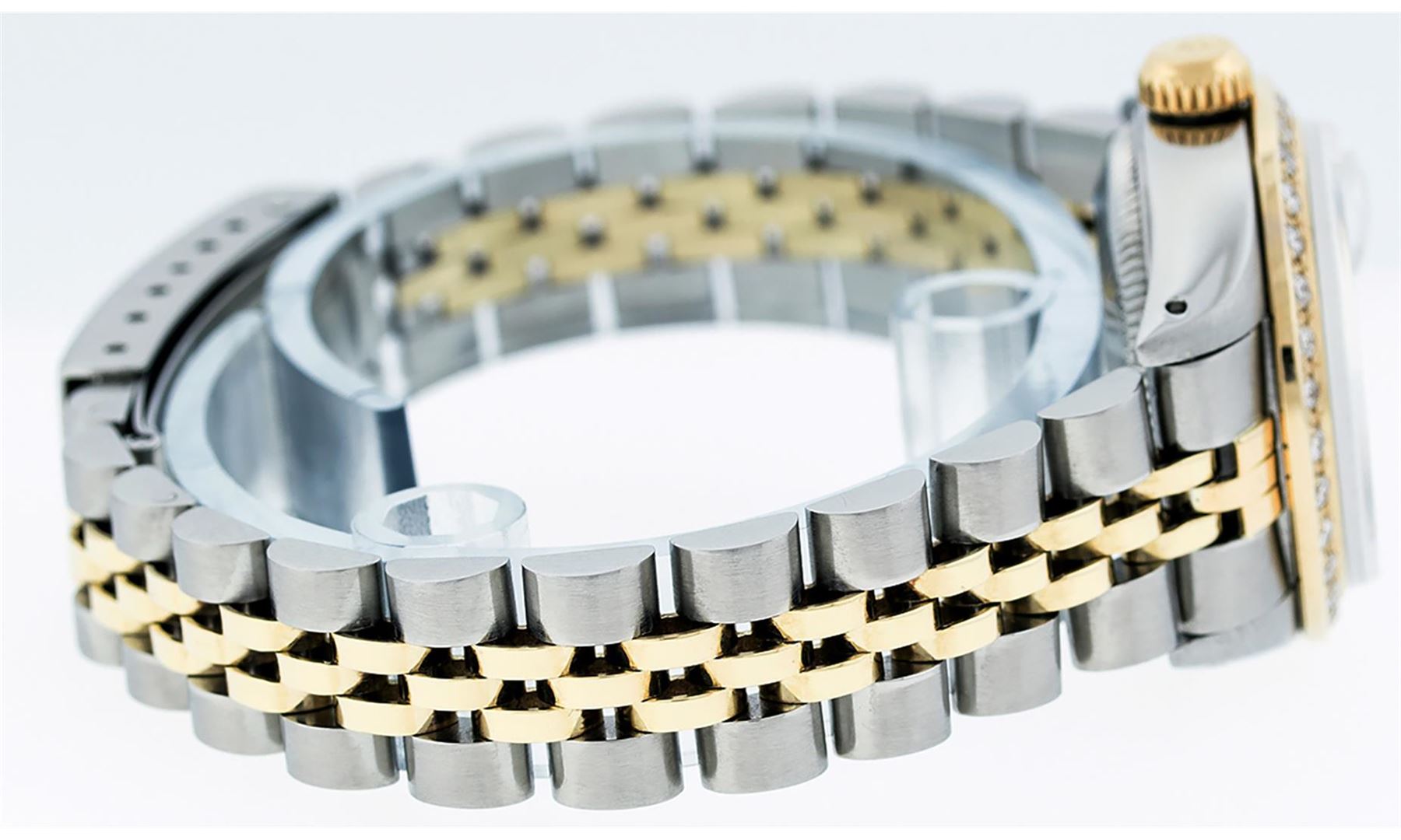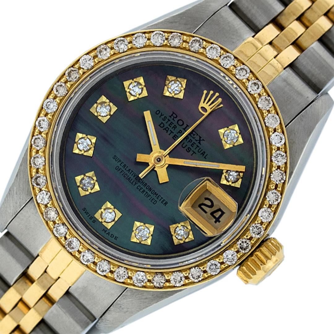 One Ladies Pre Owned Two Tone Rolex Datejust Polished, Serviced & Electronically Tested, Yellow Gold & Stainless Steel Case: 26mm, Yellow Gold Crown, Custom Bezel: New 18K Yellow Gold Beadset Diamond Bezel, Diamond Count: 32 Diamonds On Bezel, Clarity: SI-VS, Color: G to H. Custom Crystal: New Sapphire With Date Window. Custom Hands: New Luminescent Hands. Rolex Movement: Automatic Winding Movement. Custom Dial: Tahitian MOP With Single Cut Diamond Hour Markers, 10 Diamonds In Dial, G To H In Color, SI-VS Clarity. Date Window: 3 Oclock Position Date Display, Model: Datejust. Condition: G-6 Extra Fine. Rolex Bracelet: Two Tone Yellow Gold & Stainless Steel Jubilee Band. Bright Polish. 6.0 Inch Length, Adjustable. Standard Clasp, With Rolex Logo. This Watch Has Been Serviced Time Tested And Is In Excellent Condition It Is Free Of All Scratches And Dents.