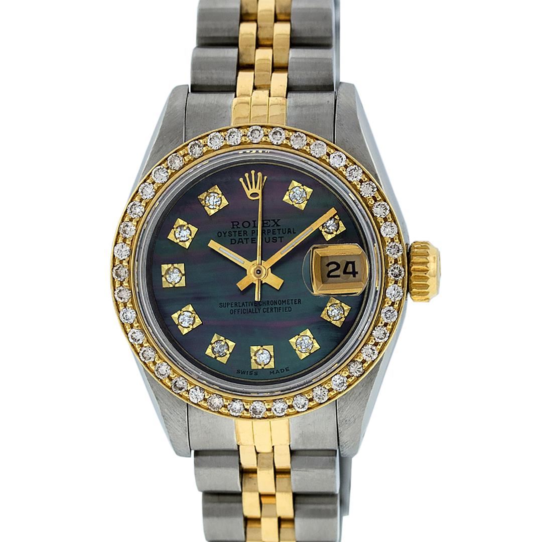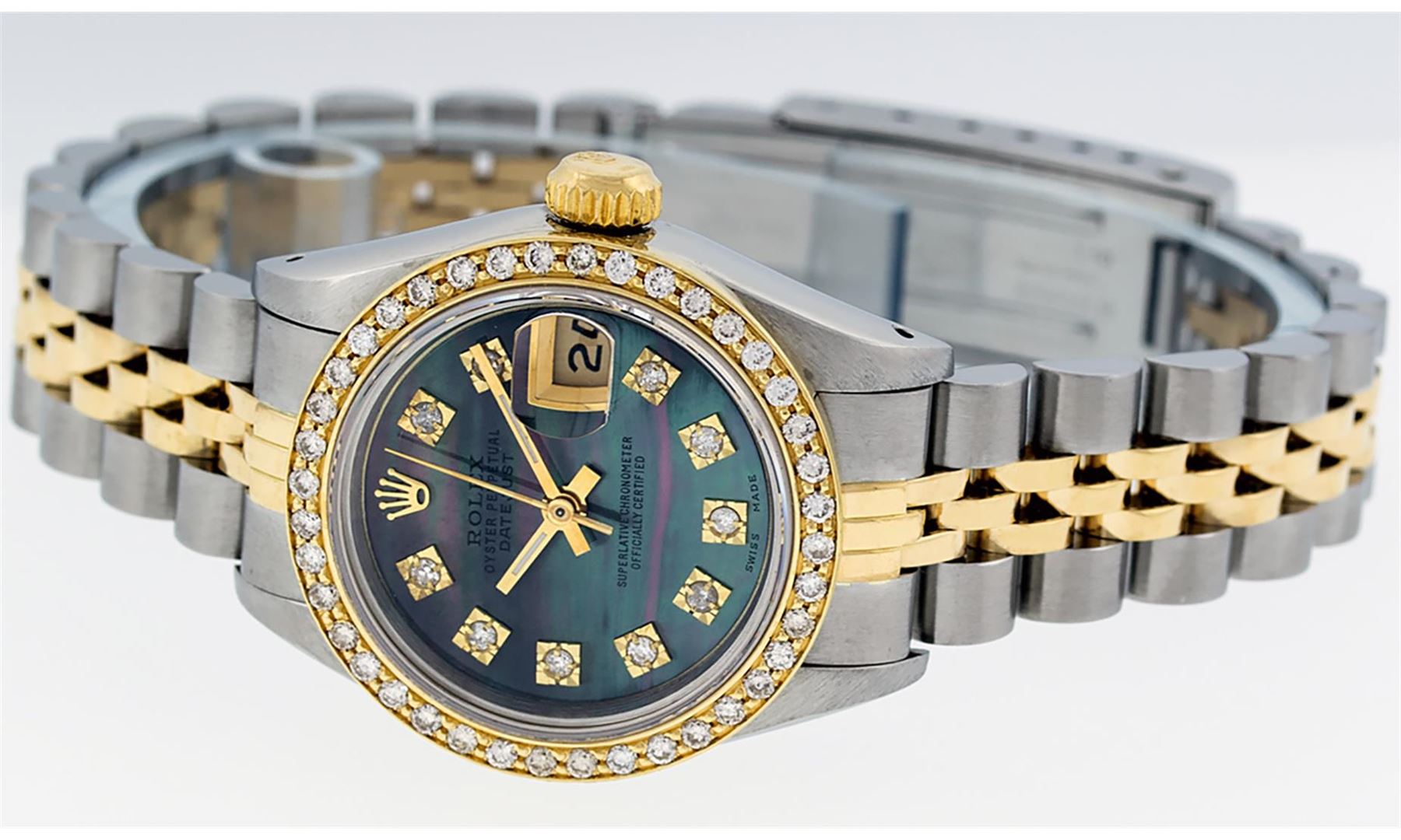 One Ladies Two Tone Rolex Datejust Polished, Serviced & Electronically Tested, Yellow Gold & Stainless Steel Case: 26mm, Yellow Gold Crown, Custom Bezel: New 18K Yellow Gold Beadset Diamond Bezel, Diamond Count: 32 Diamonds On Bezel, Total Weight .70 Carat, Clarity: SI-VS, Color: G to H. Custom Crystal: New Scratch Resistant Synthetic Sapphire Cyclops Lens. Custom Hands: New Luminescent Hands. Movement: Automatic Winding Movement. Custom Dial: Tahitian MOP With Single Cut Diamond Hour Markers, 10 Diamonds In Dial, G To H In Color, SI-VS Clarity. Date Window: 3 O'Clock Position Date Display, Model: Datejust. Condition: G-6 Extra Fine. Bracelet: Two Tone Yellow Gold & Stainless Steel Jubilee Band. Bright Polish. 6.0 Inch Length, Adjustable. Standard Clasp, With Rolex Logo. This Watch Has Been Serviced Time Tested And Is In Excellent Condition It Is Free Of All Scratches And Dents.