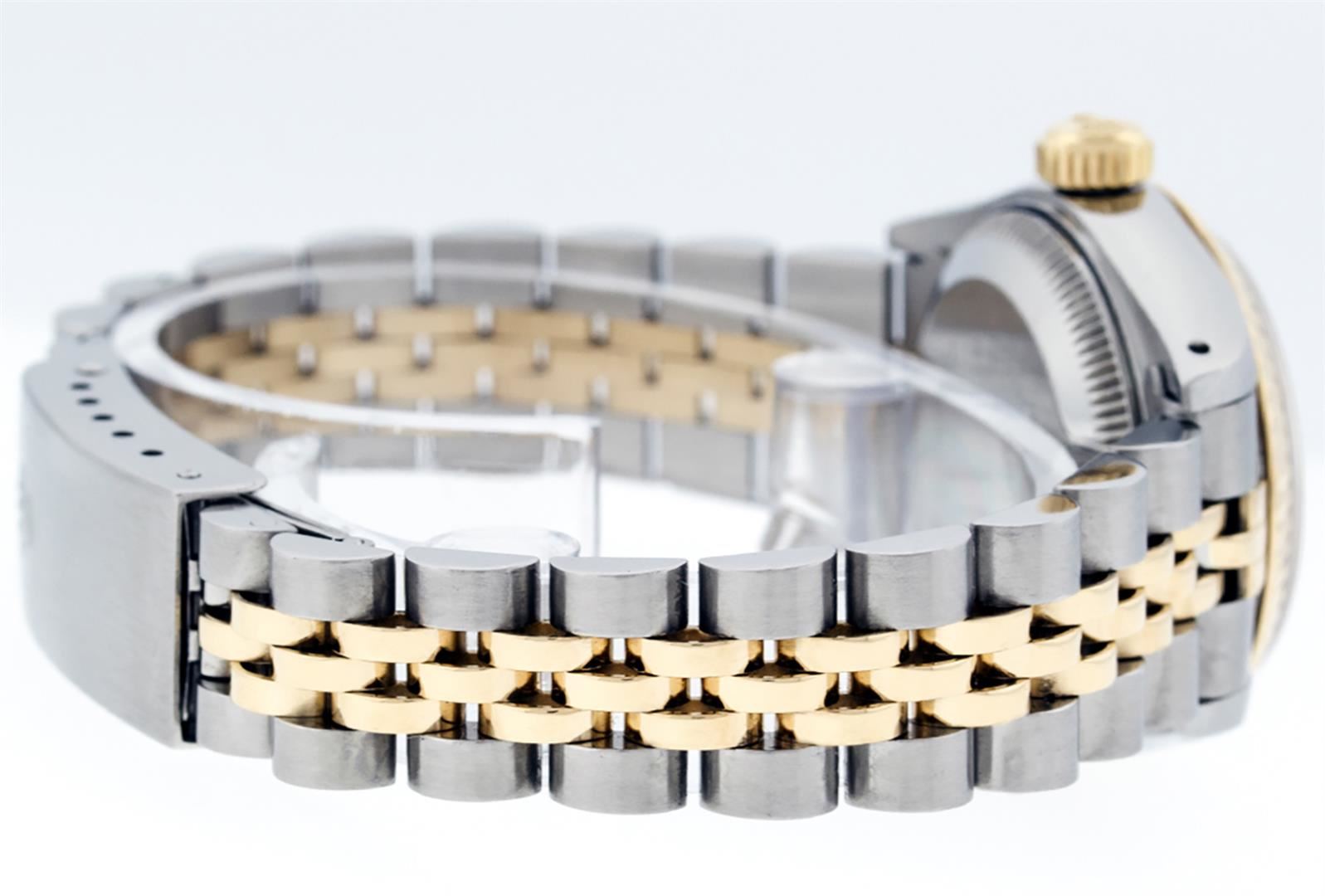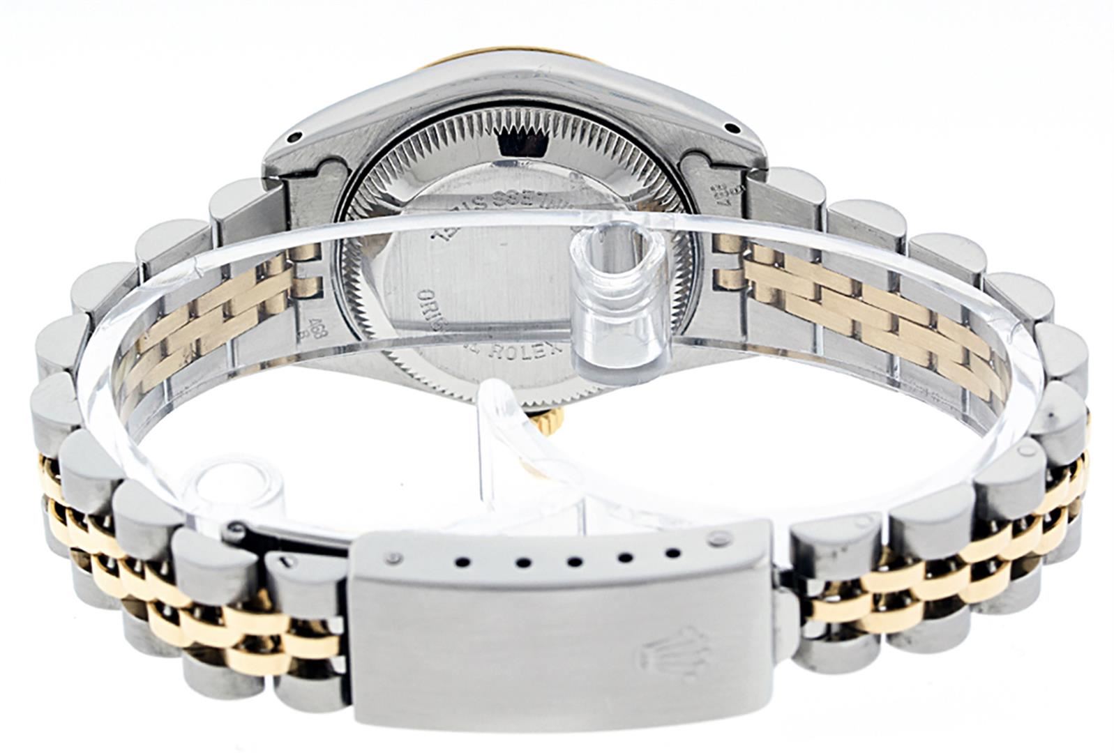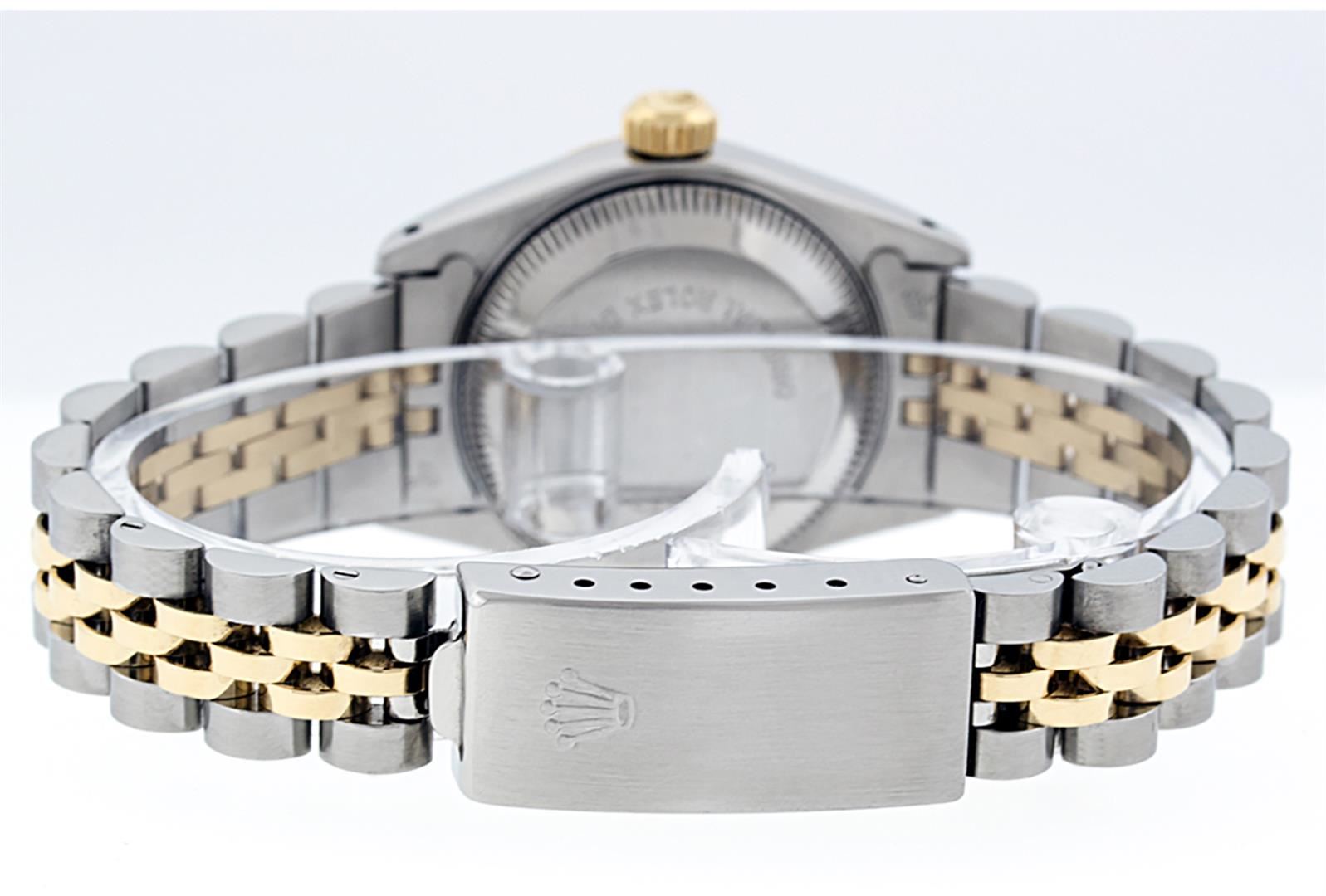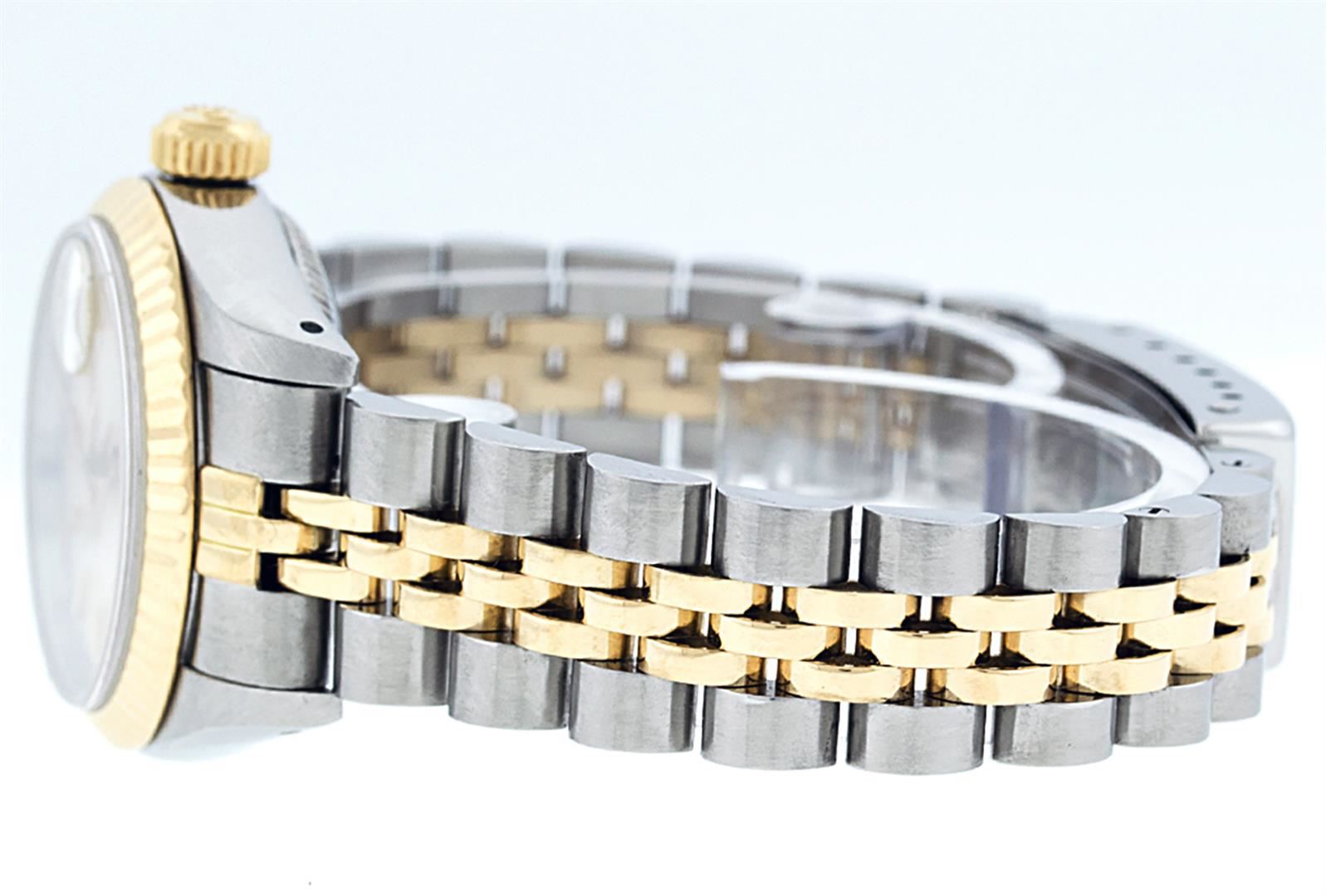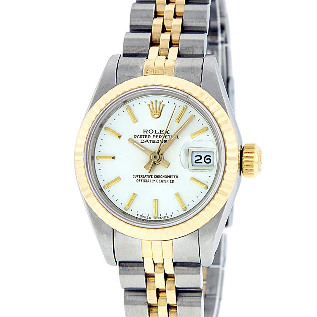 One Ladies Two Tone Rolex Datejust Polished, Serviced & Electronically Tested, Yellow Gold & Stainless Steel Case: 26mm, Yellow Gold Crown, Bezel: Yellow Gold Fluted Bezel. Custom Crystal: New Acrylic Cyclops Lens. Custom Hands: New Luminescent Hands. Movement: Automatic Winding Movement. Custom Dial: White Index With Dash Track & Lumi Dots. Date Window: 3 O'Clock Position Date Display, Model: Datejust. Condition: G-6 Extra Fine. Bracelet: Two Tone Yellow Gold & Stainless Steel Jubilee Band. Bright Polish. 6.0 Inch Length, Adjustable. Standard Clasp, With Rolex Logo. This Watch Has Been Serviced Time Tested And Is In Excellent Condition It Is Free Of All Scratches And Dents.