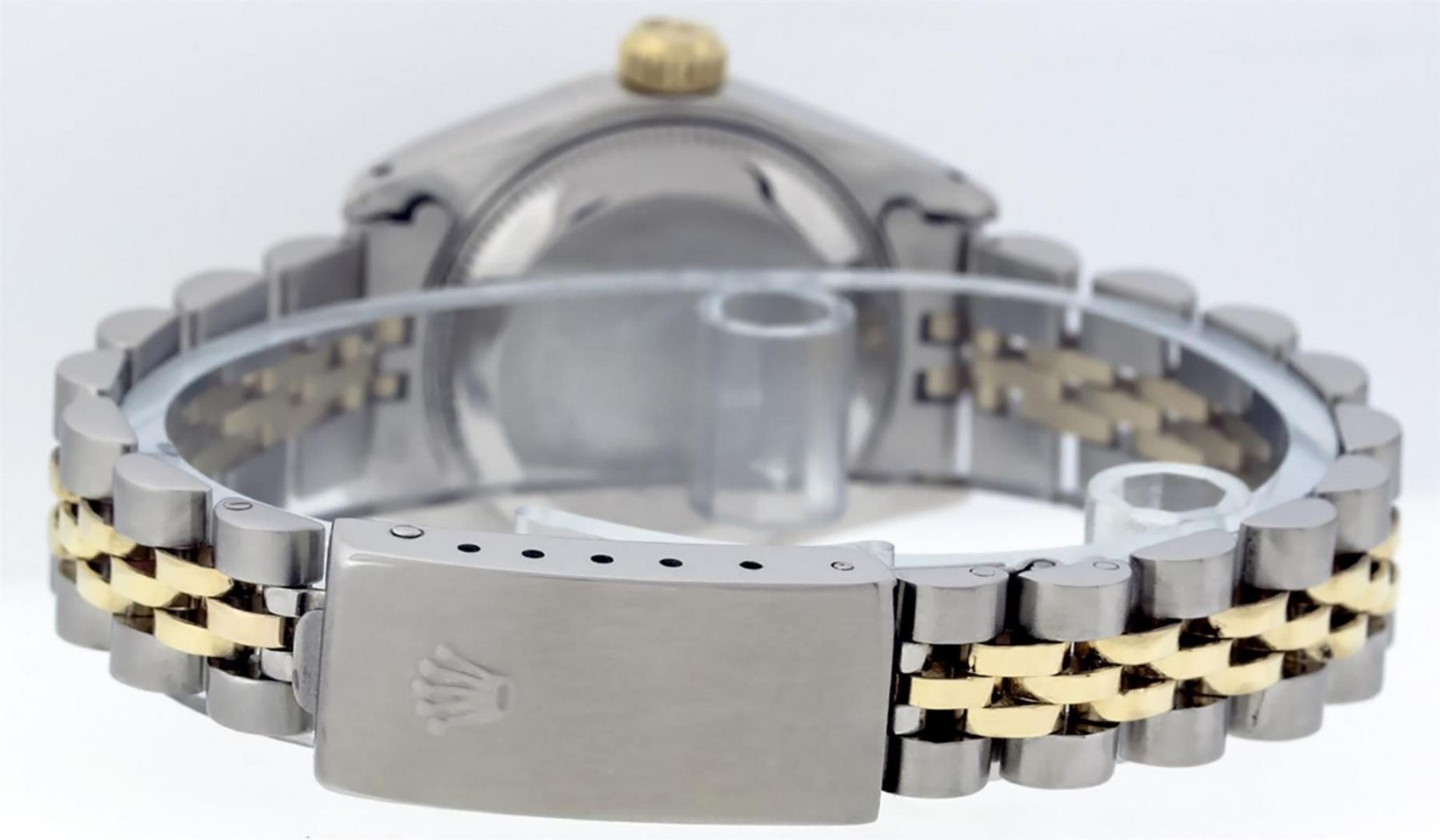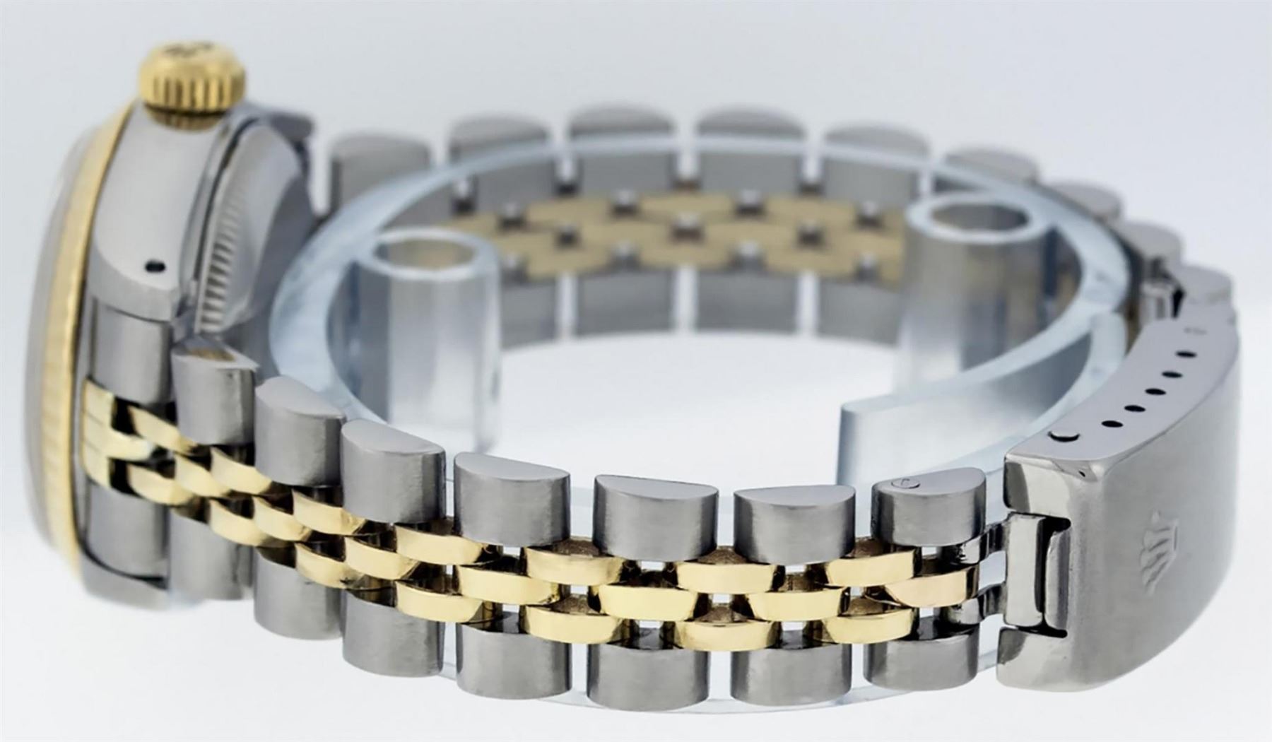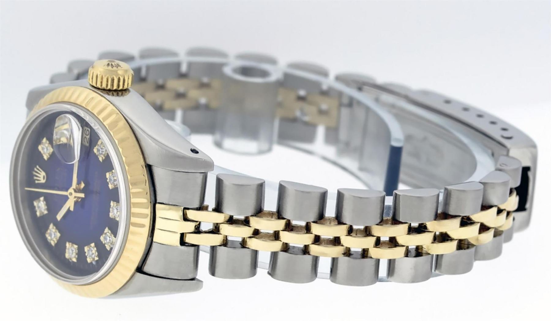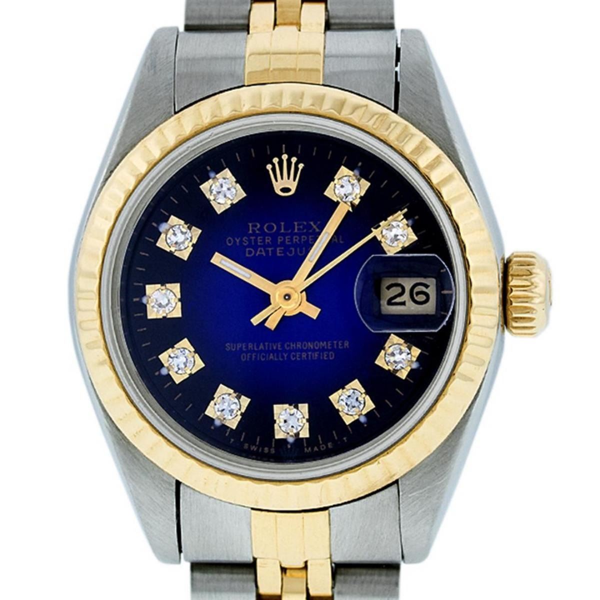 One Ladies Two Tone Yellow Gold Rolex Datejust Polished, Serviced & Electronically Tested, Yellow Gold & Stainless Steel Case: 26mm, Yellow Gold Crown, Bezel: Yellow Gold Fluted Bezel. Custom Crystal: New Acrylic Cyclops Lens. Custom Hands: New Luminescent Hands. Movement: Automatic Winding Movement. Custom Dial: Blue Vignette With Diamond Hour Markers And Dash Track, Diamond Count: 10 Diamonds, Color: G to H, Clarity: VS2-SI1. Date Window: 3 O'Clock Position Date Display, Model: Datejust. Condition: G-6 Extra Fine. Bracelet: Two Tone Yellow Gold Yellow Gold & Stainless Steel Jubilee. Bright Polish. 6.0 Inch Length, Adjustable. Standard Clasp, With Rolex Logo. This Watch Has Been Serviced Time Tested And Is In Excellent Condition It Is Free Of All Scratches And Dents.