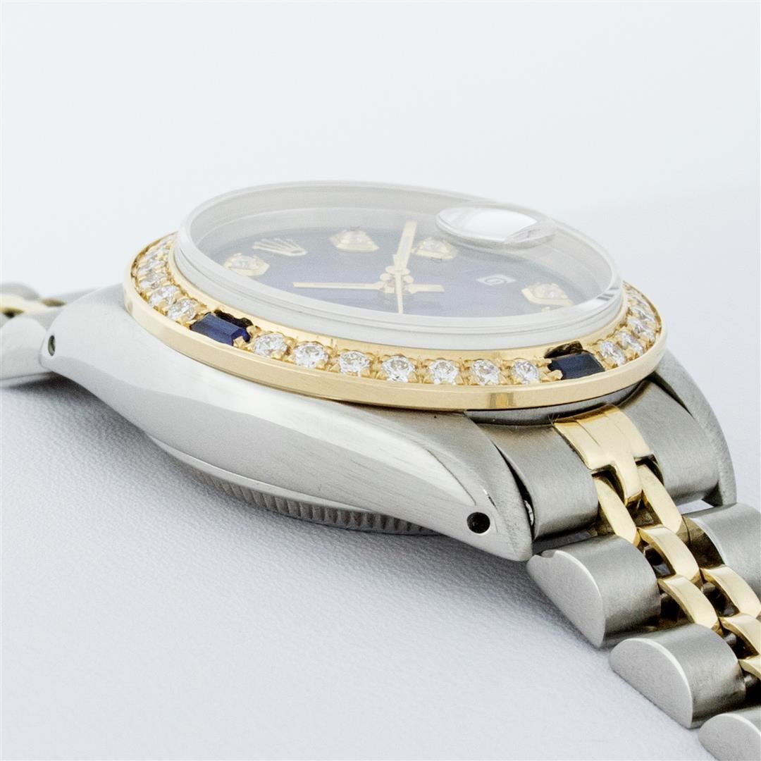 One Ladies Two Tone Yellow Gold Rolex Datejust Polished, Serviced & Electronically Tested, Yellow Gold & Stainless Steel Case: 26mm, Yellow Gold Crown, Custom Bezel: New 18K Yellow Gold Sapphire Beadset Diamond Bezel, Diamond + Gem Count: 28 Diamonds + 4 Sapphires, Total Weight.70 Carat, Clarity: SI-VS, Color: G to H. Custom Crystal: New Scratch Resistant Synthetic Sapphire Cyclops Lens. Custom Hands: New Luminescent Hands. Movement: Automatic Winding Movement. Custom Dial: Blue Vignette Set With Diamond Hour Markers & Dash Track, Diamond Count: 10 Diamonds in Dial, G To H In Color, SI-VS Clarity. Date Window: 3 O'Clock Position Date Display, Model: Datejust, Condition: G-6 Extra Fine. Bracelet: Two Tone Yellow Gold Yellow Gold & Stainless Steel Jubilee Band. Bright Polish. 6.0 Inch Length, Adjustable. Standard Clasp, With Rolex Logo. This Watch Has Been Serviced Time Tested And Is In Excellent Condition It Is Free Of All Scratches And Dents.