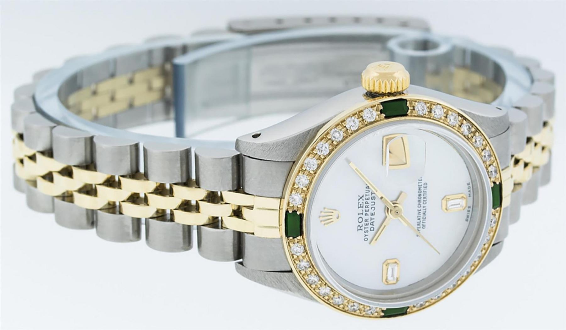 One Ladies Two Tone Yellow Gold Rolex Datejust Polished, Serviced & Electronically Tested, Yellow Gold & Stainless Steel Case: 26mm, Yellow Gold Crown, Custom Bezel: New 18K Yellow Gold Emerald Beadset Diamond Bezel, Diamond Count: 28 Diamonds + 4 Emeralds In Bezel. Total Bezel Weight.70 Carat, Clarity: SI-VS, Color: G to H. Custom Crystal: New Scratch Resistant Synthetic Sapphire Cyclops Lens. Custom Hands: New Luminescent Hands. Movement: Automatic Winding Movement. Custom Dial: Mother Of Pearl With Baguette Diamonds, STone Yellow Gold Count: 2 Baguettes. Date Window: 3 O'Clock Position Date Display, Model: Datejust. Condition: G-6 Extra Fine. Bracelet: Two Tone Yellow Gold Yellow Gold & Stainless Steel Jubilee Band. Bright Polish. 6.0 Inch Length, Adjustable. Standard Clasp, With Rolex Logo. This Watch Has Been Serviced Time Tested And Is In Excellent Condition It Is Free Of All Scratches And Dents.
