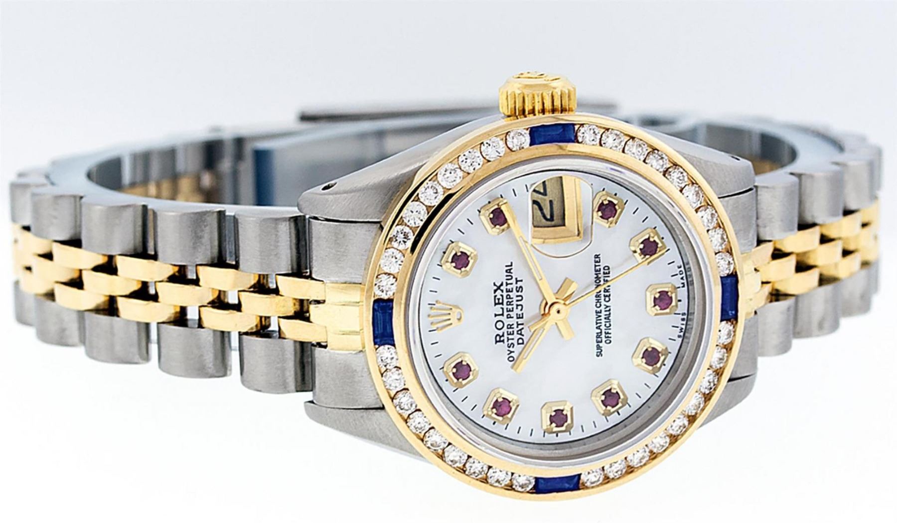 One Ladies Two Tone Yellow Gold Rolex Datejust Polished, Serviced & Electronically Tested, Yellow Gold & Stainless Steel Case: 26mm, Yellow Gold Crown, Custom Bezel: New 18K Yellow Gold Sapphire Channel Set Diamond Bezel, Diamond + Gem Count: 36 Diamonds + 4 Sapphires, Total Weight 1.00 Carat, Clarity: SI-VS, Color: G to H. Custom Crystal: New Scratch Resistant Synthetic Sapphire Cyclops Lens. Custom Hands: New Luminescent Hands. Movement: Automatic Winding Movement. Custom Dial: Mother Of Pearl with Ruby Hour Markers And Dash Tracks, STone Yellow Gold Count: 10 Rubies In Dial. Date Window: 3 O'Clock Position Date Display, Model: Datejust, Condition: G-6 Extra Fine. Bracelet: Two Tone Yellow Gold Yellow Gold & Stainless Steel Jubilee. Bright Polish. 6.0 Inch Length, Adjustable. Standard Clasp, With Rolex Logo. This Watch Has Been Serviced Time Tested And Is In Excellent Condition It Is Free Of All Scratches And Dents.