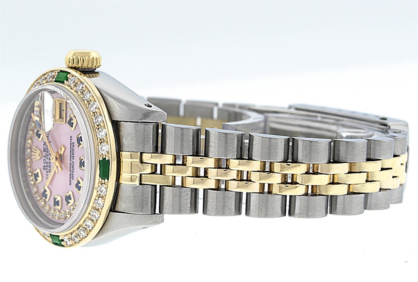 One Ladies Two Tone Yellow Gold Rolex Datejust Polished, Serviced & Electronically Tested, Yellow Gold & Stainless Steel Case: 26mm, Yellow Gold Crown, Custom Bezel: New 18K New Yellow Gold Emerald Beadset Diamond Bezel, Diamond Count: 28 Diamonds + 4 Emeralds In Dial, Total Weight.70 Carat, Clarity: SI-VS, Color: G to H. Custom Crystal: New Scratch Resistant Synthetic Sapphire Cyclops Lens. Custom Hands: New Luminescent Hands. Movement: Automatic Winding Movement. Custom Dial: Pink Mother Of Pearl Sapphire String Diamond Dial, STone Yellow Gold Count: 10 Sapphires + 33 Diamonds In Dial, Clarity: SI-VS, Color: G to H. Date Window: 3 O'Clock Position Date Display, Model: Datejust. Condition: G-6 Extra Fine. Bracelet: Two Tone Yellow Gold Yellow Gold & Stainless Steel Jubilee Band. Bright Polish. 6.0 Inch Length, Adjustable. Standard Clasp, With Rolex Logo. This Watch Has Been Serviced Time Tested And Is In Excellent Condition It Is Free Of All Scratches And Dents.