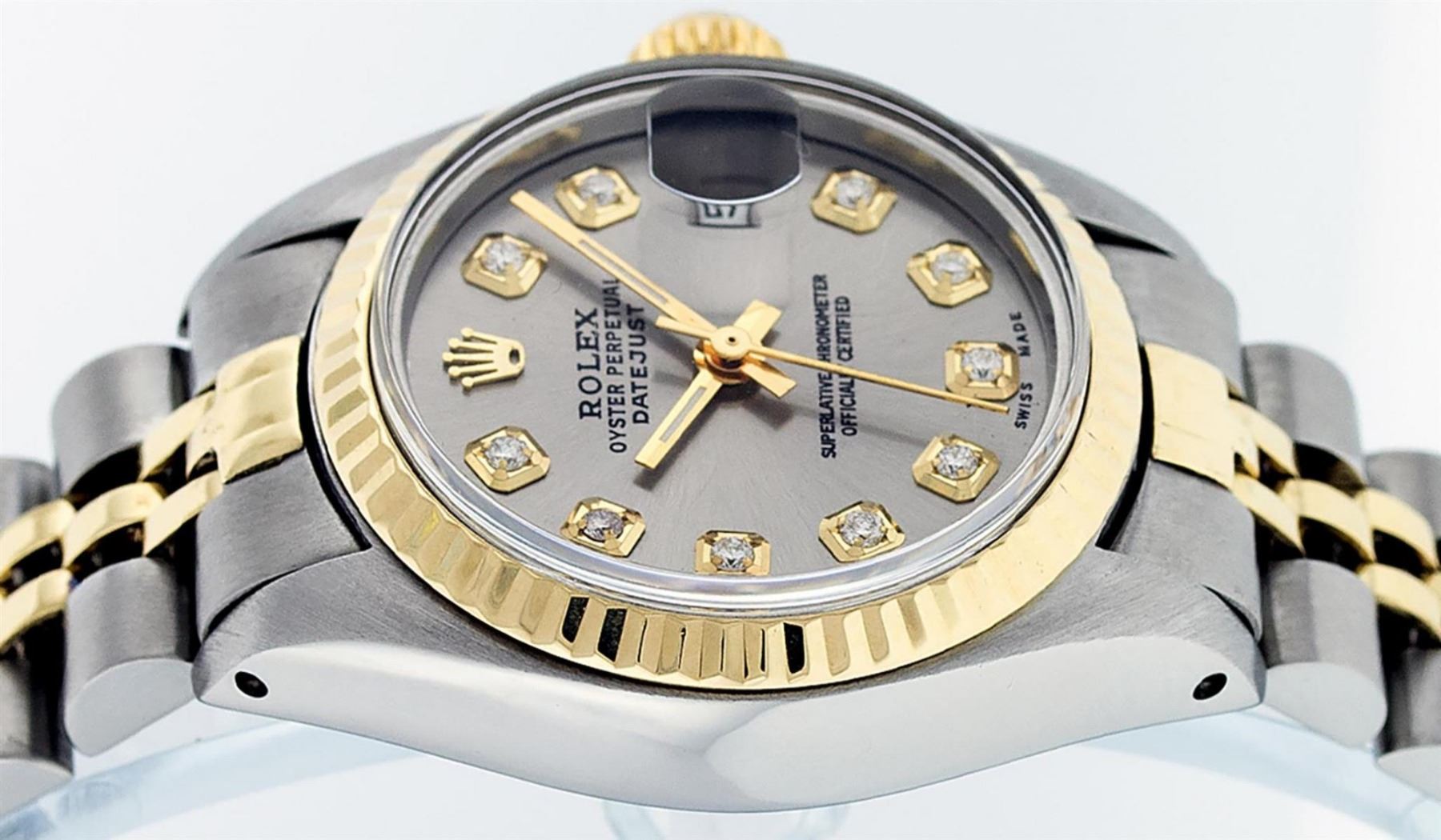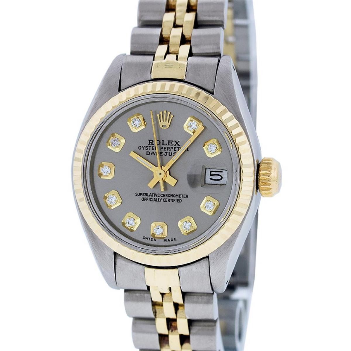 One Ladies Two Tone Yellow Gold Rolex Datejust Polished, Serviced & Electronically Tested, Yellow Gold & Stainless Steel Case: 26mm, Yellow Gold Crown, Bezel: Yellow Gold Fluted Bezel. Custom Crystal: New Acrylic Cyclops Lens. Custom Hands: New Luminescent Hands. Movement: Automatic Winding Movement. Custom Dial: Slate Grey With Diamond Hour Markers, Diamond Count: 10 Diamonds, Color: G to H, Clarity: VS2-SI1. Date Window: 3 O'Clock Position Date Display, Model: Datejust. Condition: G-6 Extra Fine. Bracelet: Two Tone Yellow Gold Yellow Gold & Stainless Steel Jubilee Band. Bright Polish. 6.0 Inch Length, Adjustable. Standard Clasp, With Rolex Logo. This Watch Has Been Serviced Time Tested And Is In Excellent Condition It Is Free Of All Scratches And Dents.