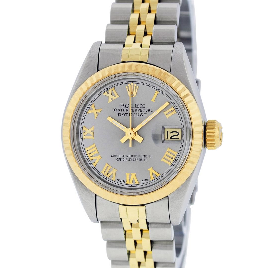 One Ladies Two Tone Rolex Datejust Polished, Serviced & Electronically Tested, Yellow Gold & Stainless Steel, Case Size: 26mm, Yellow Gold Crown, Bezel: Yellow Gold Fluted Bezel. Custom Crystal: New Acrylic Cyclops Lens. Custom Hands: New Luminescent Hands. Movement: Automatic Winding Movement. Custom Dial: Slate Grey Roman Dial. Date Window: 3 O'Clock Position Date Display, Model: Datejust. Condition: G-6 Extra Fine. Bracelet: Two Tone Yellow Gold & Stainless Steel Jubilee. Bright Polish. 6.0 Inch Length, Adjustable. Standard Clasp, With Rolex Logo. This Watch Has Been Serviced Time Tested And Is In Excellent Condition It Is Free Of All Scratches And Dents.
