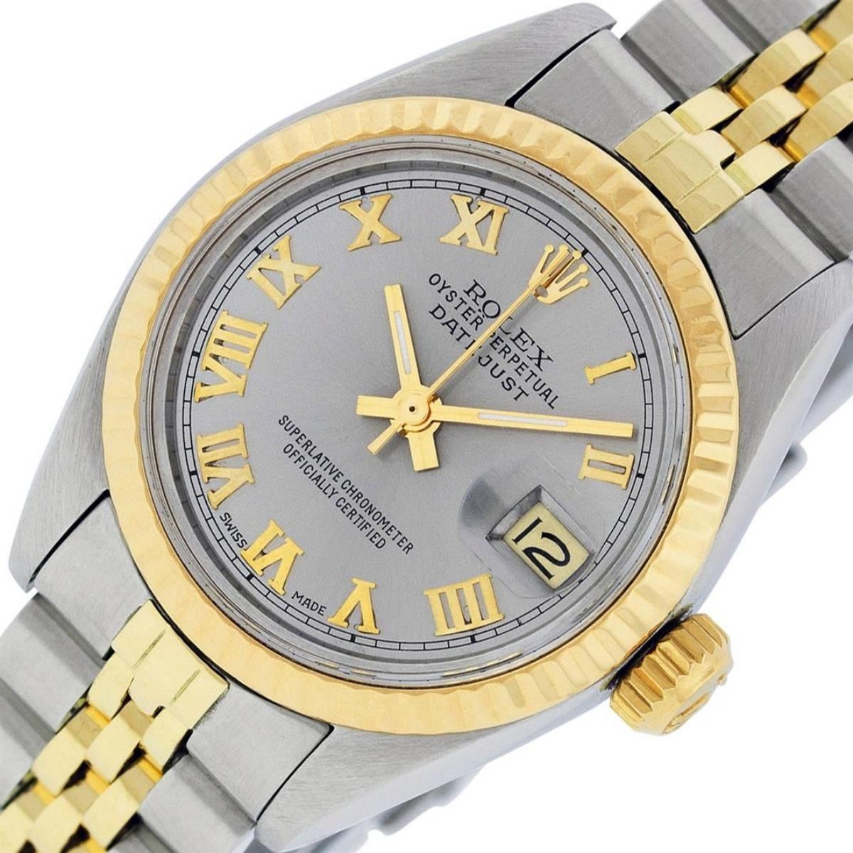 One Ladies Two Tone Rolex Datejust Polished, Serviced & Electronically Tested, Yellow Gold & Stainless Steel, Case Size: 26mm, Yellow Gold Crown, Bezel: Yellow Gold Fluted Bezel. Custom Crystal: New Acrylic Cyclops Lens. Custom Hands: New Luminescent Hands. Movement: Automatic Winding Movement. Custom Dial: Slate Grey Roman Dial. Date Window: 3 O'Clock Position Date Display, Model: Datejust. Condition: G-6 Extra Fine. Bracelet: Two Tone Yellow Gold & Stainless Steel Jubilee. Bright Polish. 6.0 Inch Length, Adjustable. Standard Clasp, With Rolex Logo. This Watch Has Been Serviced Time Tested And Is In Excellent Condition It Is Free Of All Scratches And Dents.