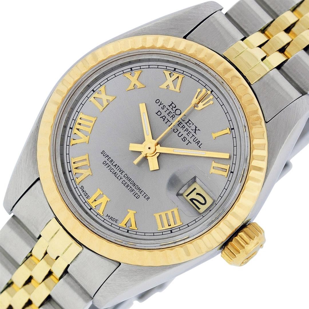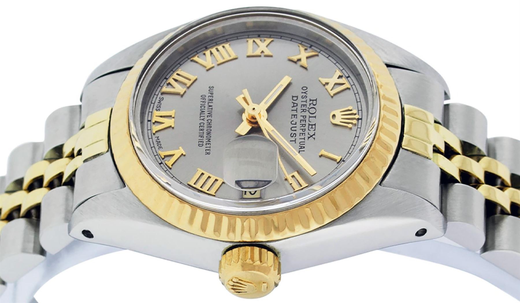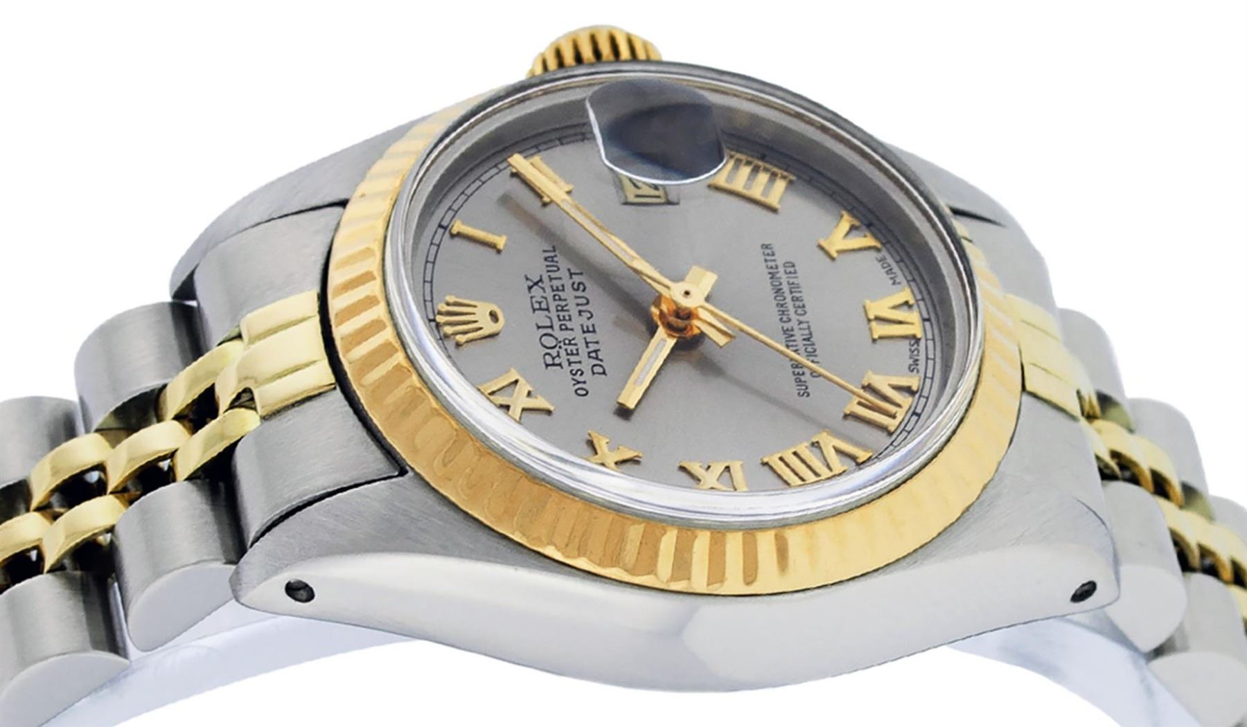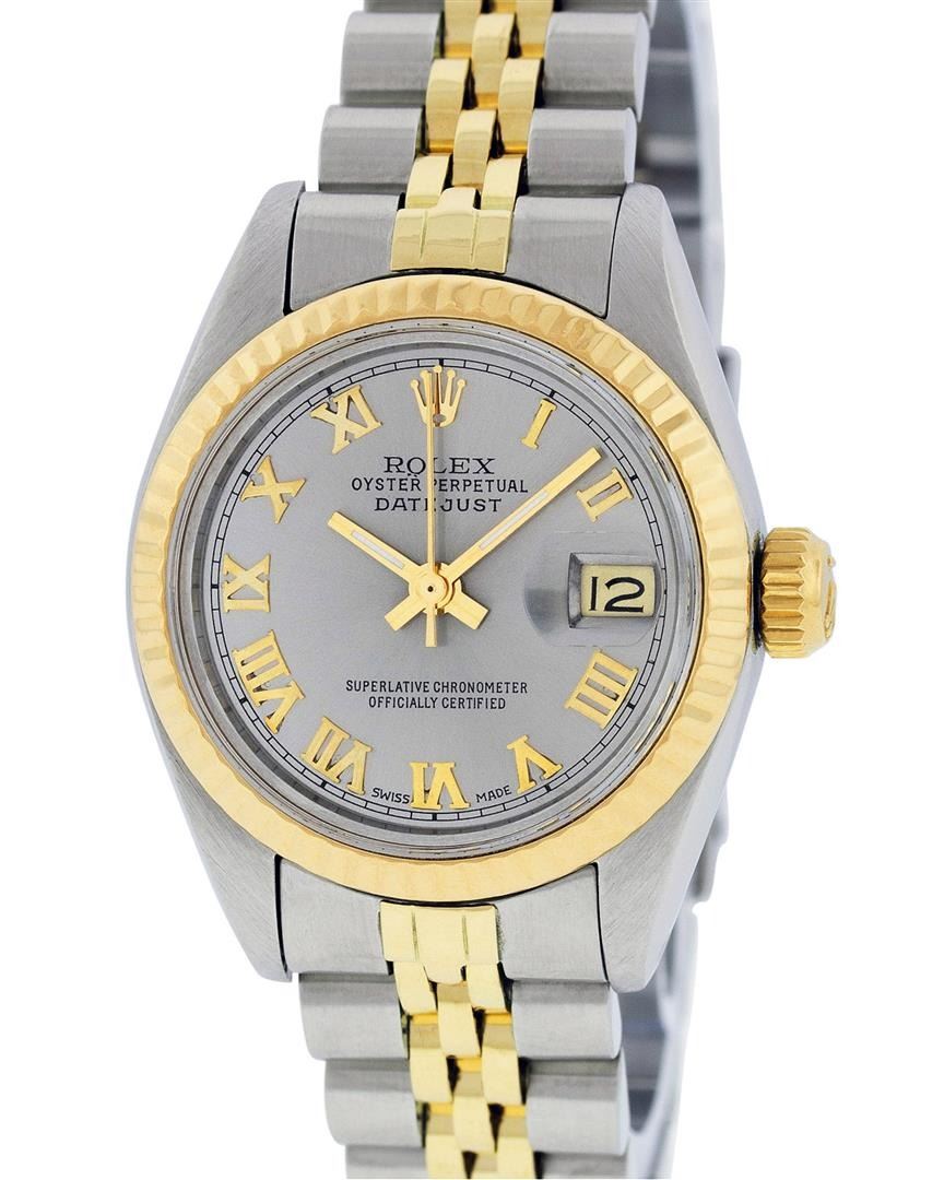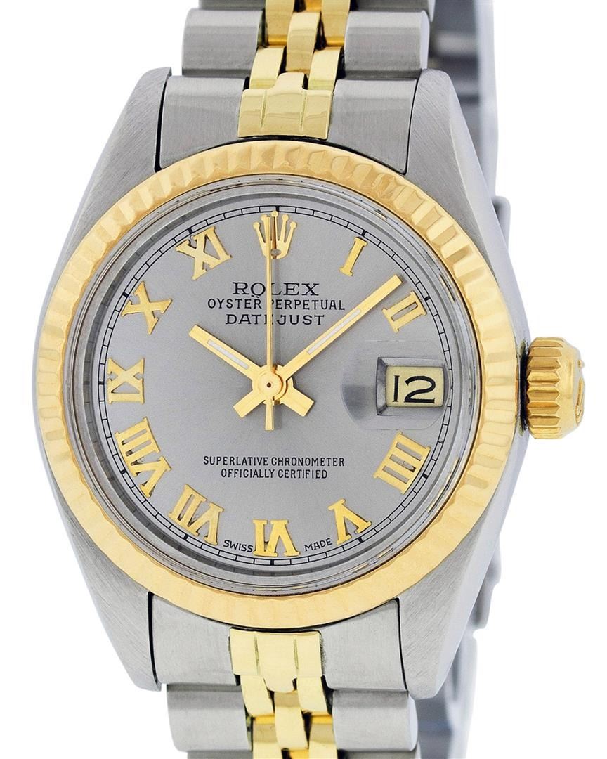 One Ladies Pre Owned Two Tone 14K Yellow Gold & Stainless Steel Rolex Polished, Serviced & Electronically Tested, Rolex 14K Yellow Gold & Stainless Steel, Rolex Case Size: 26mm, Rolex Yellow Gold Crown, Rolex Bezel: 14K Yellow Gold Fluted Bezel. Custom Crystal: New Plastic With Magnified Date Window. Hands: Luminescent Hands. Rolex Movement: Automatic Winding Movement 2030. Rolex Dial: Slate Grey Roman Dial With Square Track. Date Window: 3 O'Clock Position Date Display, Model: Date. Condition: G-6 Extra Fine. Rolex Bracelet: Two Tone 14K Yellow Gold & Stainless Steel Jubilee Band. Bright Polish. 6.0 Inch Length, Adjustable. Standard Clasp, With Rolex Logo. This Watch Has Been Serviced Time Tested And Is In Excellent Condition It Is Free Of All Scratches And Dents.