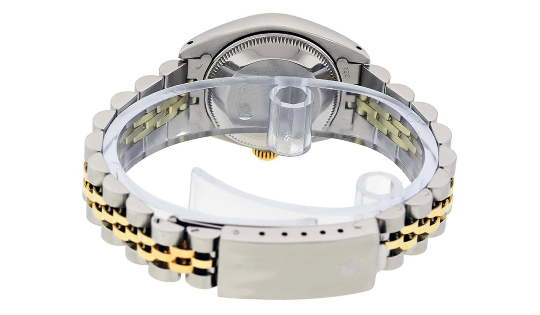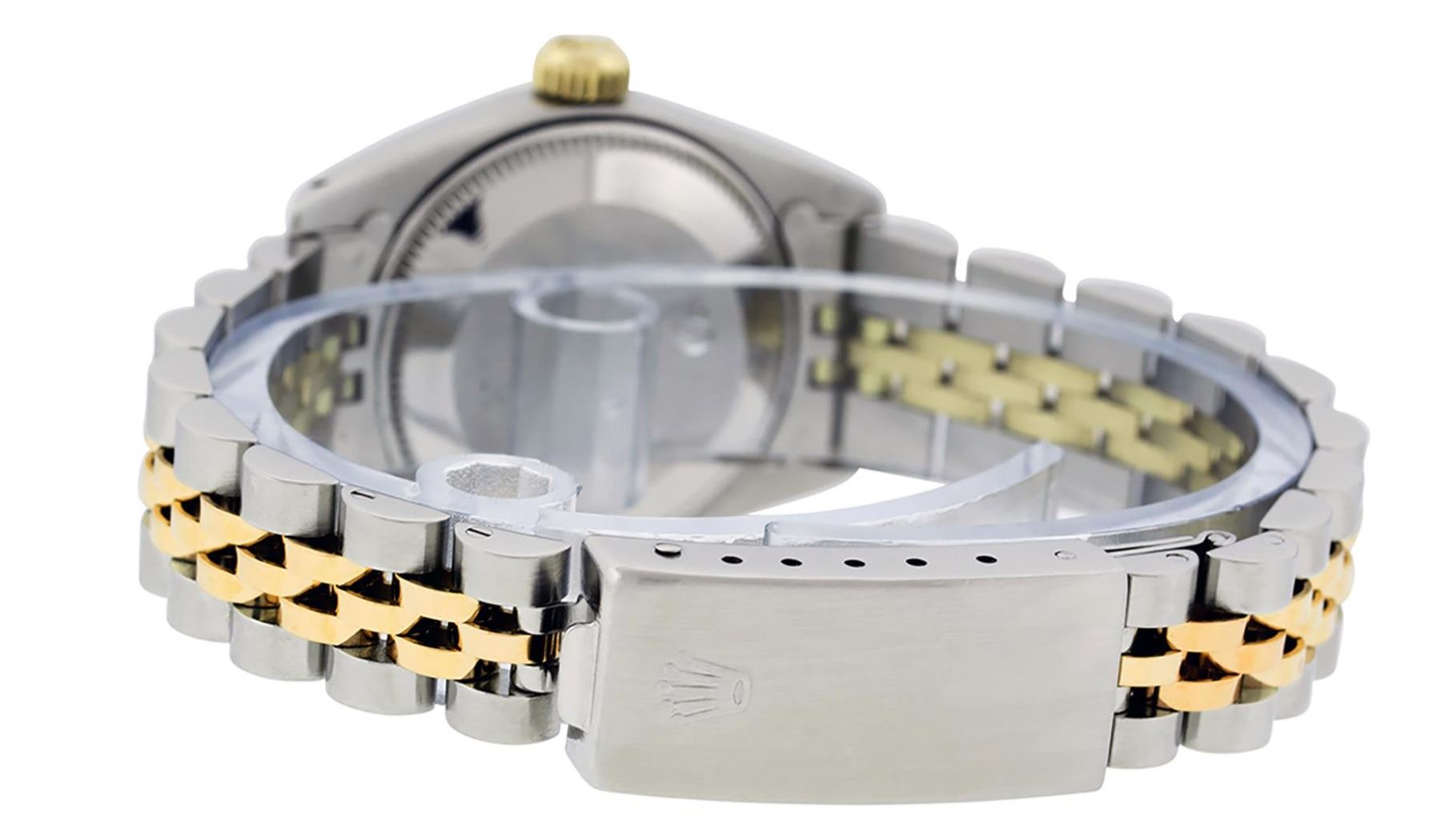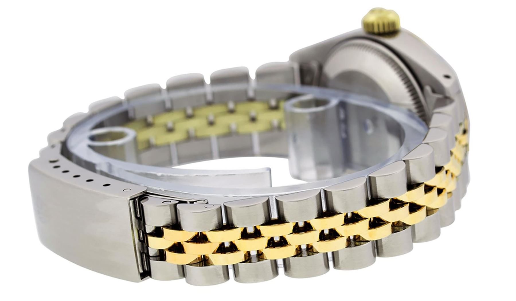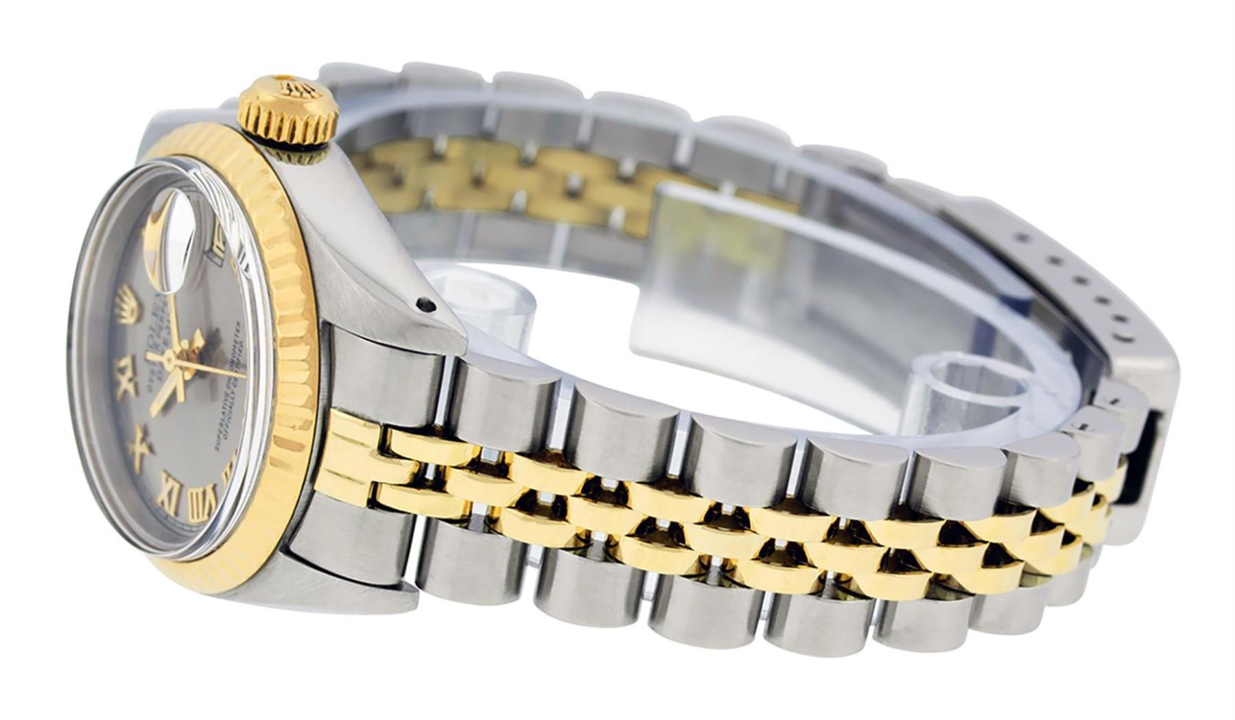 One Ladies Pre Owned Two Tone 14K Yellow Gold & Stainless Steel Rolex Polished, Serviced & Electronically Tested, Rolex 14K Yellow Gold & Stainless Steel, Rolex Case Size: 26mm, Rolex Yellow Gold Crown, Rolex Bezel: 14K Yellow Gold Fluted Bezel. Custom Crystal: New Plastic With Magnified Date Window. Hands: Luminescent Hands. Rolex Movement: Automatic Winding Movement 2030. Rolex Dial: Slate Grey Roman Dial With Square Track. Date Window: 3 O'Clock Position Date Display, Model: Date. Condition: G-6 Extra Fine. Rolex Bracelet: Two Tone 14K Yellow Gold & Stainless Steel Jubilee Band. Bright Polish. 6.0 Inch Length, Adjustable. Standard Clasp, With Rolex Logo. This Watch Has Been Serviced Time Tested And Is In Excellent Condition It Is Free Of All Scratches And Dents.