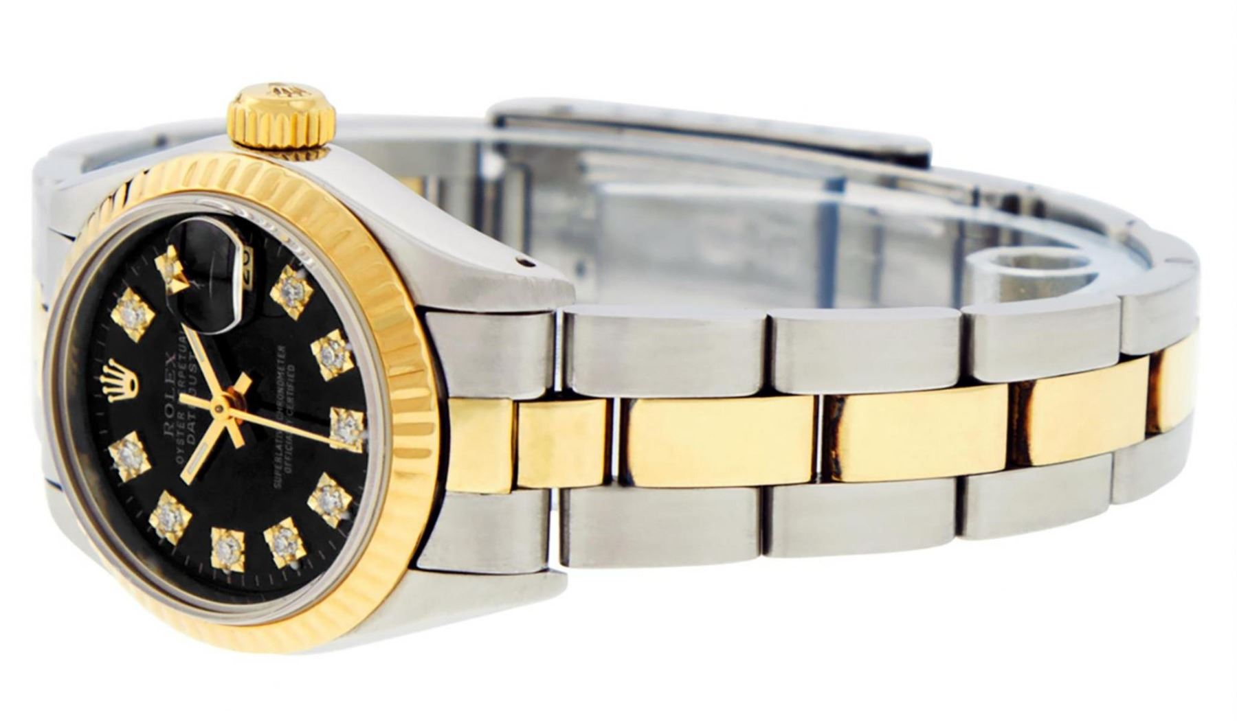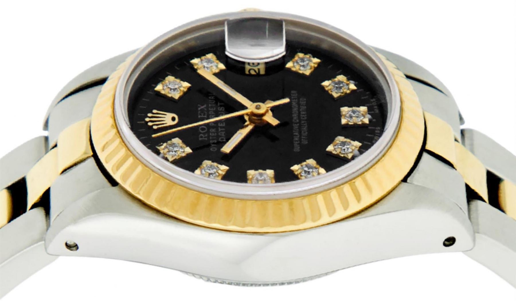 One Ladies Two Tone Yellow Gold And Stainless Steel Rolex Datejust Polished, Serviced & Electronically Tested, Yellow Gold & Stainless Steel Case: 26mm, Yellow Gold Crown, Bezel: Yellow Gold Fluted Bezel. Custom Crystal: New Acrylic Cyclops Lens. Custom Hands: New Luminescent Hands. Movement: Automatic Winding Movement. Custom Dial: Black With Diamond Hour Markers, Diamond Count: 10 Single Cut Diamonds, Color: G to H, Clarity: VS. Date Window: 3 O'Clock Position Date Display, Model: Datejust. Condition: G-6 Extra Fine. Bracelet: Two Tone Yellow Gold & Stainless Steel Oyster Band. Bright Polish. 6.0 Inch Length, Adjustable. Standard Clasp, With Rolex Logo. This Watch Has Been Serviced Time Tested And Is In Excellent Condition It Is Free Of All Scratches And Dents.