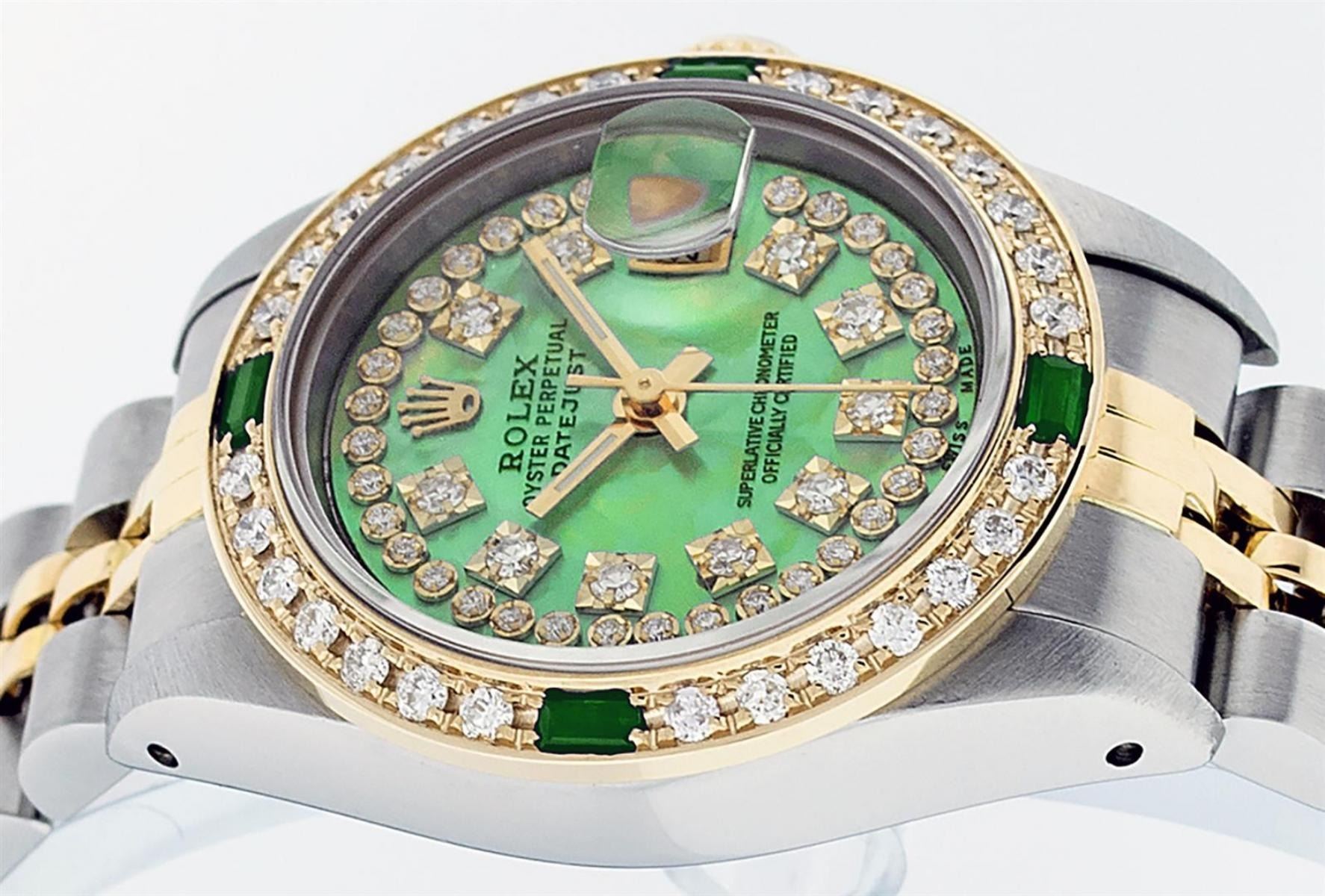 One Ladies Two Tone Rolex Datejust Polished, Serviced & Electronically Tested, Yellow Gold & Stainless Steel Case: 26mm, Yellow Gold Crown, Custom Bezel: New 18K Yellow Gold Emerald Beadset Diamond Bezel, Diamond + Gem Count: 28 Diamonds + 4 Emeralds, Total Weight .70 Carat, Clarity: SI-VS, Color: G to H. Custom Crystal: New Scratch Resisant Synthetic Sapphire Cyclops Lens. Custom Hands: New Luminescent Hands. Movement: Automatic Winding Movement. Custom Dial: Green Mother Of Pearl String Diamond Dial, Diamond Count: 43 Diamond in Dial, G To H In Color, VS Clarity. Date Window: 3 O'Clock Position Date Display, Model: Datejust, Condition: G-6 Extra Fine. Bracelet: Two Tone Yellow Gold & Stainless Steel Jubilee. Bright Polish. 6.0 Inch Length, Adjustable. Standard Clasp, With Rolex Logo. This Watch Has Been Serviced Time Tested And Is In Excellent Condition It Is Free Of All Scratches And Dents.