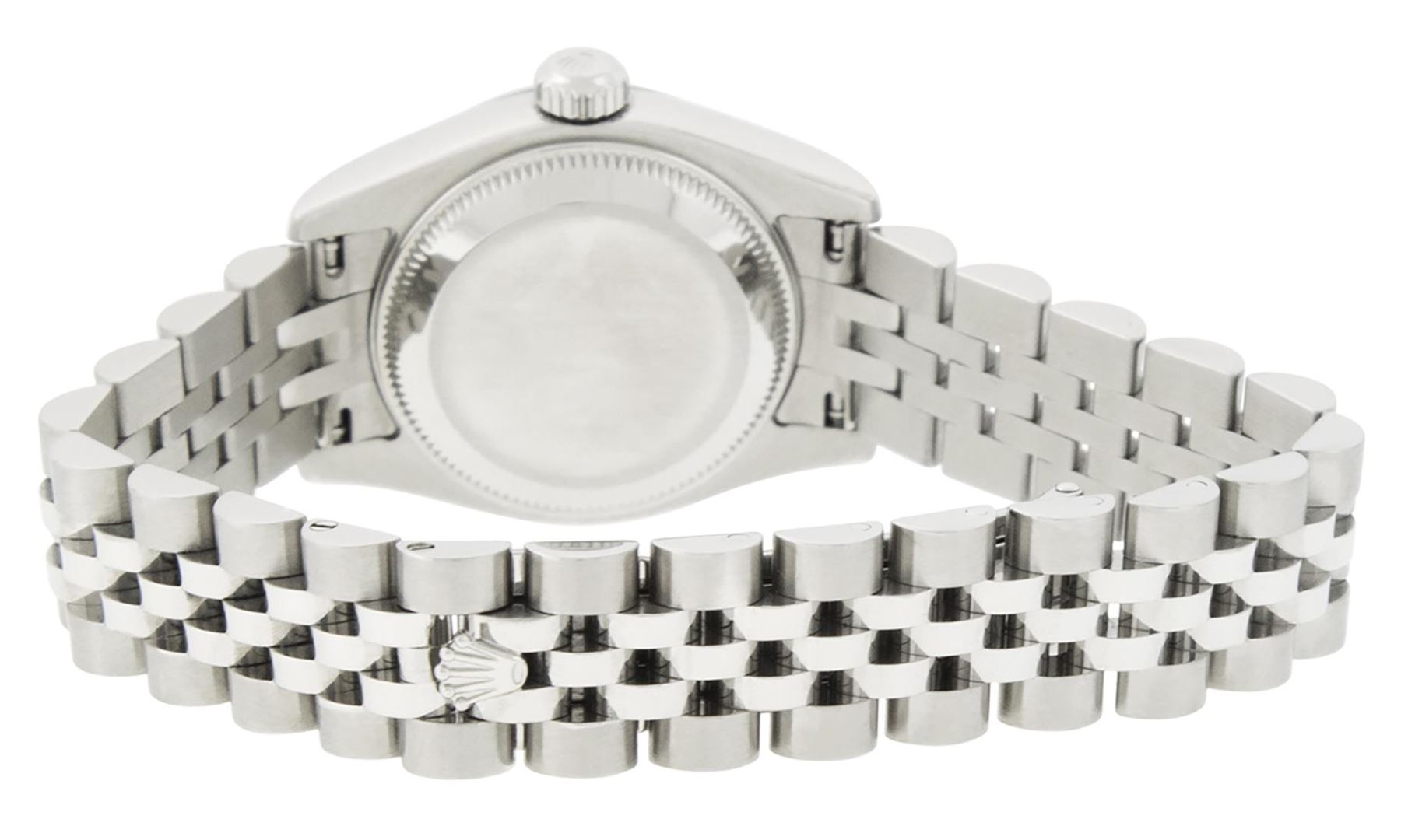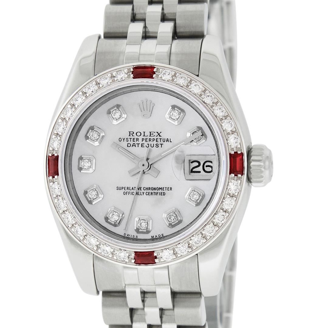 One Quickset Ladies Stainless Pre Owned Steel Rolex Datejust Polished Bright with Satin Finish, Serviced & Electronically Tested, Stainless Steel Case: 26mm, Stainless Steel Crown, Custom Bezel: New 18K White Gold Beadset + Ruby Diamond Bezel, Stone Count