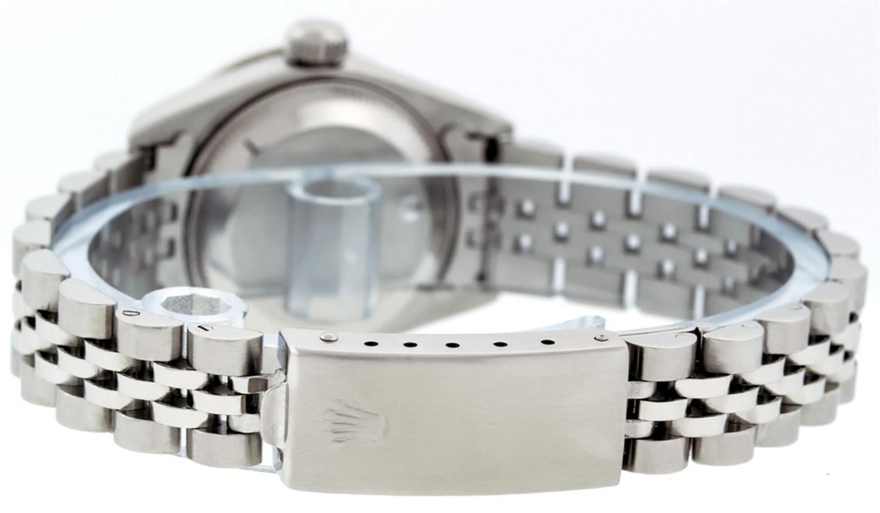 One Quickset Ladies Stainless Steel Rolex Datejust Polished Bright with Satin Finish, Serviced & Electronically Tested, Stainless Steel Case: 26mm, Stainless Steel Crown, Custom Diamond Lugs: 24 Diamonds On Lugs, Clarity: SI-VS, Color: G to H. Custom Bezel: New 18K White Gold Diamond + Ruby Beadset Diamond Bezel, Stone Count: 28 Diamonds + 4 Rubies, Total Weight .70 Carat, Clarity: SI-VS, Color: G to H. Custom Crystal: New Scratch Resistant Synthetic Sapphire Cyclops Lens. Custom Hands: New Luminescent Hands. Movement: Automatic Winding Movement. Custom Dial: Refinished Single Cut Mother Of Pearl String Diamond Dial, 43 Diamonds in Dial G To H In Color, Clarity: VS. Date Window: 3 O'Clock Position Date Display, Model: Quickset Datejust. Condition: G-6 Extra Fine. Bracelet: Stainless Steel Jubilee Band. Bright Polish & Satin Finish. 6.0 Inch Length, Adjustable. Standard Clasp, With Rolex Logo. This Watch Has Been Serviced Time Tested And Is In Excellent Condition It Is Free Of All Scratches And Dents.