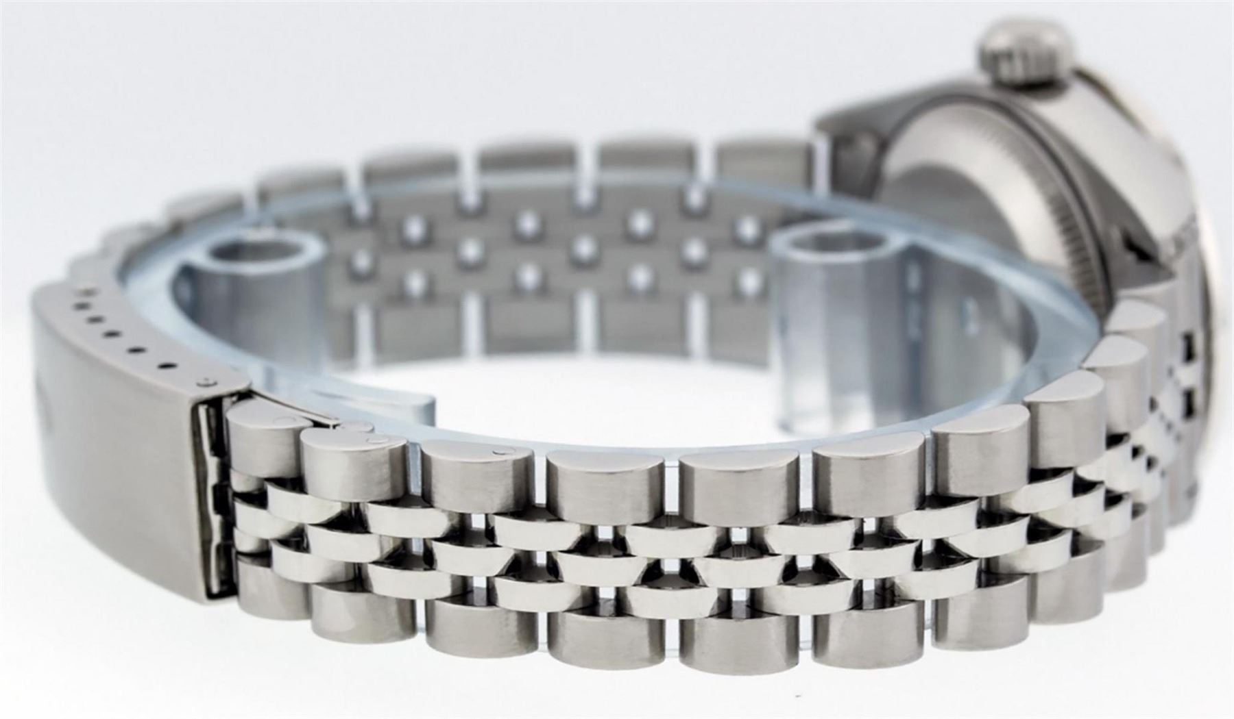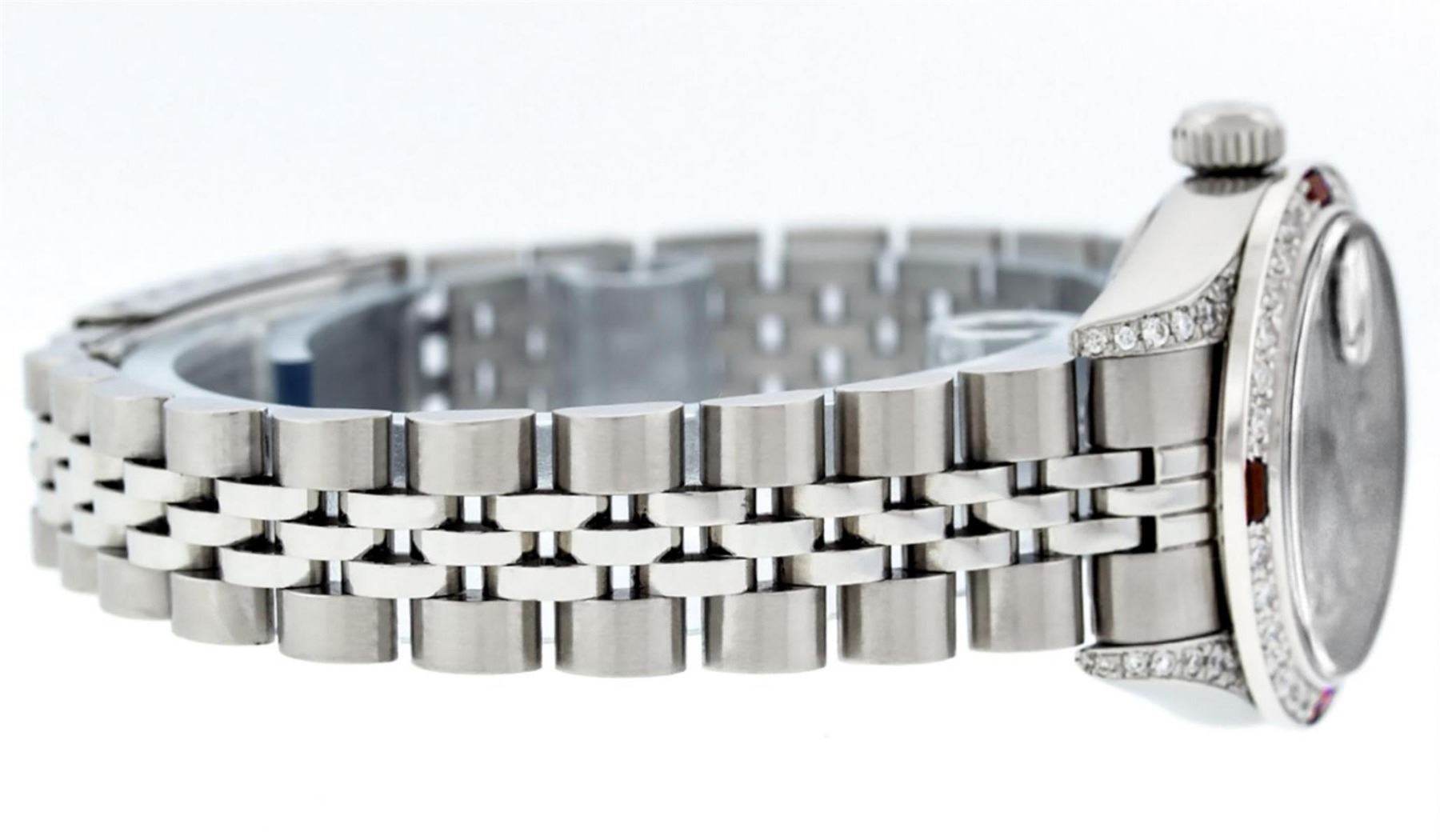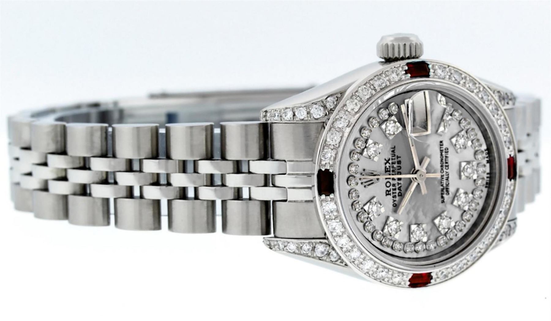 One Quickset Ladies Stainless Steel Rolex Datejust Polished Bright with Satin Finish, Serviced & Electronically Tested, Stainless Steel Case: 26mm, Stainless Steel Crown, Custom Diamond Lugs: 24 Diamonds On Lugs, Clarity: SI-VS, Color: G to H. Custom Bezel: New 18K White Gold Diamond + Ruby Beadset Diamond Bezel, Stone Count: 28 Diamonds + 4 Rubies, Total Weight .70 Carat, Clarity: SI-VS, Color: G to H. Custom Crystal: New Scratch Resistant Synthetic Sapphire Cyclops Lens. Custom Hands: New Luminescent Hands. Movement: Automatic Winding Movement. Custom Dial: Refinished Single Cut Mother Of Pearl String Diamond Dial, 43 Diamonds in Dial G To H In Color, Clarity: VS. Date Window: 3 O'Clock Position Date Display, Model: Quickset Datejust. Condition: G-6 Extra Fine. Bracelet: Stainless Steel Jubilee Band. Bright Polish & Satin Finish. 6.0 Inch Length, Adjustable. Standard Clasp, With Rolex Logo. This Watch Has Been Serviced Time Tested And Is In Excellent Condition It Is Free Of All Scratches And Dents.