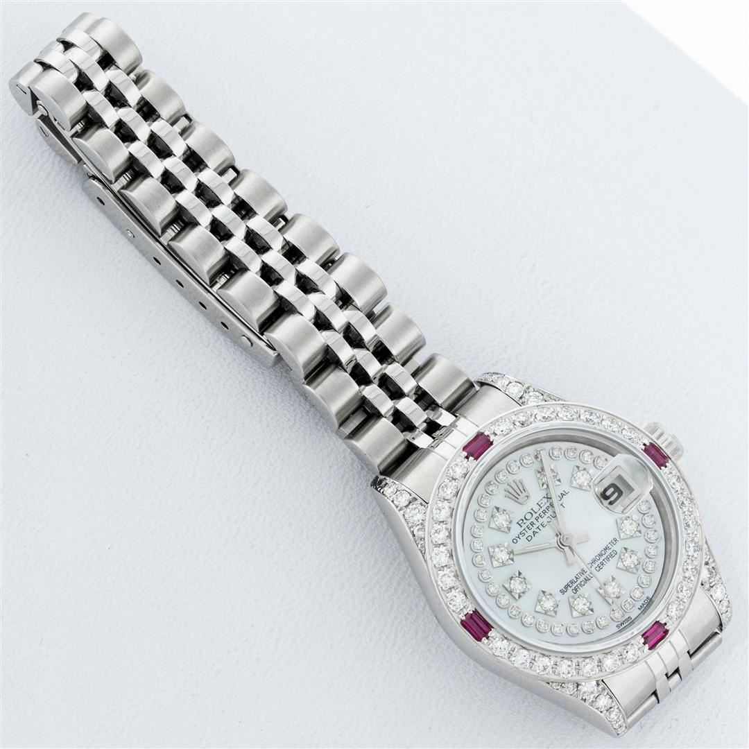 One Quickset Ladies Stainless Steel Rolex Datejust Polished Bright with Satin Finish, Serviced & Electronically Tested, Stainless Steel Case: 26mm, Stainless Steel Crown, Custom Diamond Lugs: 24 Diamonds On Lugs, Clarity: SI-VS, Color: G to H. Custom Bezel: New 18K White Gold Diamond + Ruby Beadset Diamond Bezel, Stone Count: 28 Diamonds + 4 Rubies, Total Weight .70 Carat, Clarity: SI-VS, Color: G to H. Custom Crystal: New Scratch Resistant Synthetic Sapphire Cyclops Lens. Custom Hands: New Luminescent Hands. Movement: Automatic Winding Movement. Custom Dial: Refinished Single Cut Mother Of Pearl String Diamond Dial, 43 Diamonds in Dial G To H In Color, Clarity: VS. Date Window: 3 O'Clock Position Date Display, Model: Quickset Datejust. Condition: G-6 Extra Fine. Bracelet: Stainless Steel Jubilee Band. Bright Polish & Satin Finish. 6.0 Inch Length, Adjustable. Standard Clasp, With Rolex Logo. This Watch Has Been Serviced Time Tested And Is In Excellent Condition It Is Free Of All Scratches And Dents.