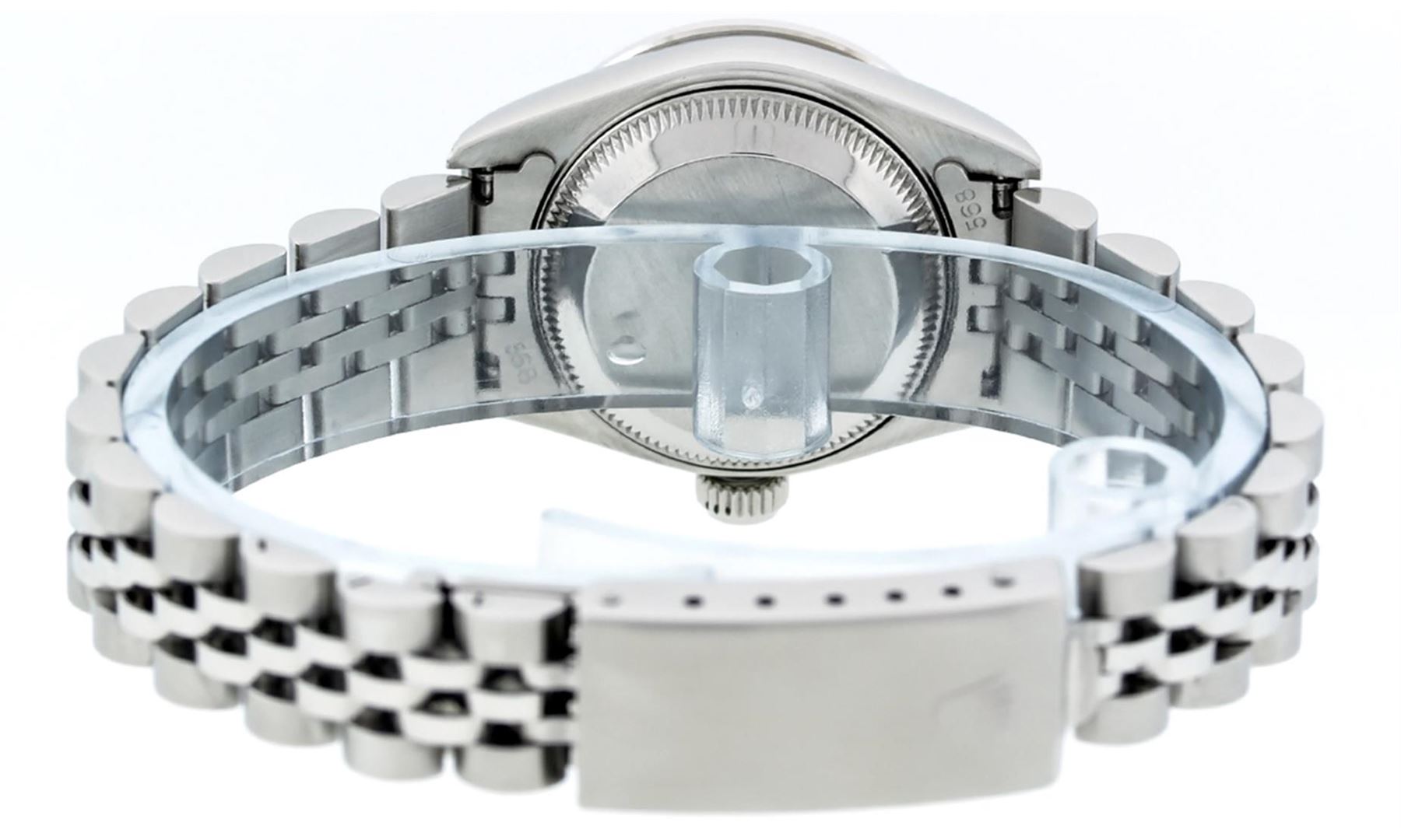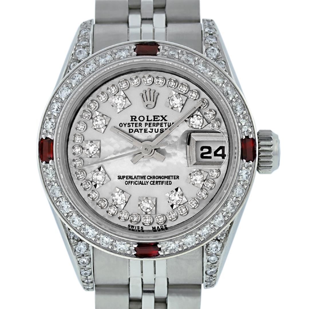One Quickset Ladies Stainless Steel Rolex Datejust Polished Bright with Satin Finish, Serviced & Electronically Tested, Stainless Steel Case: 26mm, Stainless Steel Crown, Custom Diamond Lugs: 24 Diamonds On Lugs, Clarity: SI-VS, Color: G to H. Custom Bezel: New 18K White Gold Diamond + Ruby Beadset Diamond Bezel, Stone Count: 28 Diamonds + 4 Rubies, Total Weight .70 Carat, Clarity: SI-VS, Color: G to H. Custom Crystal: New Scratch Resistant Synthetic Sapphire Cyclops Lens. Custom Hands: New Luminescent Hands. Movement: Automatic Winding Movement. Custom Dial: Refinished Single Cut Mother Of Pearl String Diamond Dial, 43 Diamonds in Dial G To H In Color, Clarity: VS. Date Window: 3 O'Clock Position Date Display, Model: Quickset Datejust. Condition: G-6 Extra Fine. Bracelet: Stainless Steel Jubilee Band. Bright Polish & Satin Finish. 6.0 Inch Length, Adjustable. Standard Clasp, With Rolex Logo. This Watch Has Been Serviced Time Tested And Is In Excellent Condition It Is Free Of All Scratches And Dents.