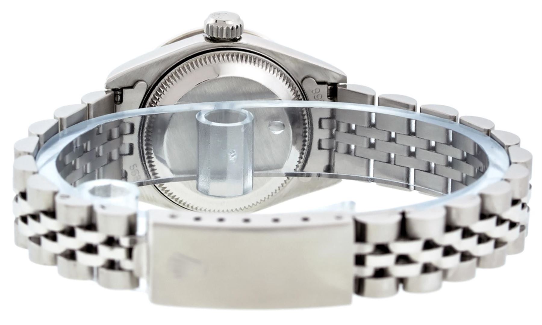 One Quickset Ladies Stainless Steel Rolex Datejust Polished Bright with Satin Finish, Serviced & Electronically Tested, Stainless Steel Case: 26mm, Stainless Steel Crown, Custom Diamond Lugs: 24 Diamonds On Lugs, Clarity: SI-VS, Color: G to H. Custom Bezel: New 18K White Gold Diamond + Ruby Beadset Diamond Bezel, Stone Count: 28 Diamonds + 4 Rubies, Total Weight .70 Carat, Clarity: SI-VS, Color: G to H. Custom Crystal: New Scratch Resistant Synthetic Sapphire Cyclops Lens. Custom Hands: New Luminescent Hands. Movement: Automatic Winding Movement. Custom Dial: Refinished Single Cut Mother Of Pearl String Diamond Dial, 43 Diamonds in Dial G To H In Color, Clarity: VS. Date Window: 3 O'Clock Position Date Display, Model: Quickset Datejust. Condition: G-6 Extra Fine. Bracelet: Stainless Steel Jubilee Band. Bright Polish & Satin Finish. 6.0 Inch Length, Adjustable. Standard Clasp, With Rolex Logo. This Watch Has Been Serviced Time Tested And Is In Excellent Condition It Is Free Of All Scratches And Dents.