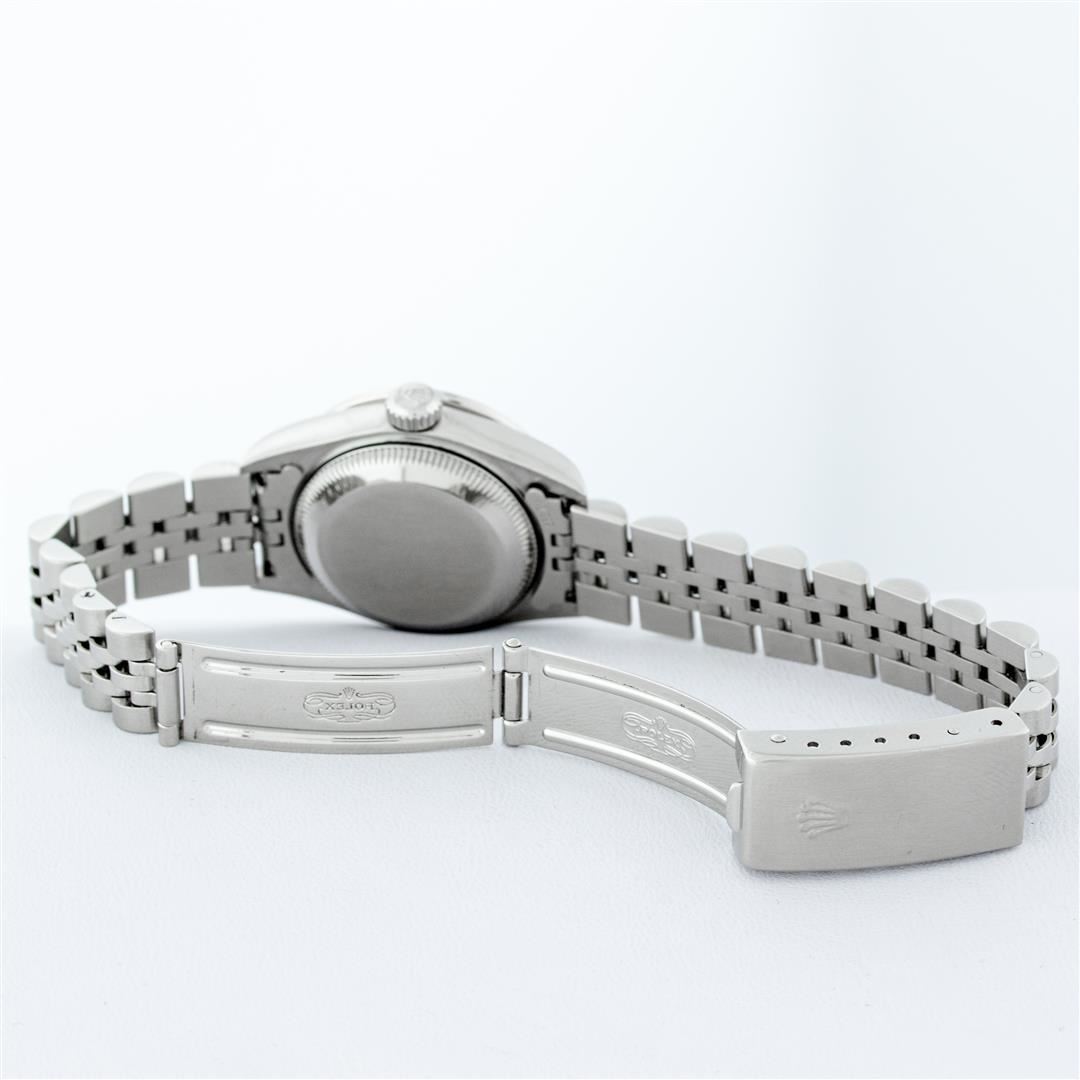 One Quickset Ladies Stainless Steel Rolex Datejust Polished Bright with Satin Finish, Serviced & Electronically Tested, Stainless Steel Case: 26mm, Stainless Steel Crown, Custom Diamond Lugs: 24 Diamonds On Lugs, Clarity: SI-VS, Color: G to H. Custom Bezel: New 18K White Gold Diamond + Ruby Beadset Diamond Bezel, Stone Count: 28 Diamonds + 4 Rubies, Total Weight .70 Carat, Clarity: SI-VS, Color: G to H. Custom Crystal: New Scratch Resistant Synthetic Sapphire Cyclops Lens. Custom Hands: New Luminescent Hands. Movement: Automatic Winding Movement. Custom Dial: Refinished Single Cut Mother Of Pearl String Diamond Dial, 43 Diamonds in Dial G To H In Color, Clarity: VS. Date Window: 3 O'Clock Position Date Display, Model: Quickset Datejust. Condition: G-6 Extra Fine. Bracelet: Stainless Steel Jubilee Band. Bright Polish & Satin Finish. 6.0 Inch Length, Adjustable. Standard Clasp, With Rolex Logo. This Watch Has Been Serviced Time Tested And Is In Excellent Condition It Is Free Of All Scratches And Dents.