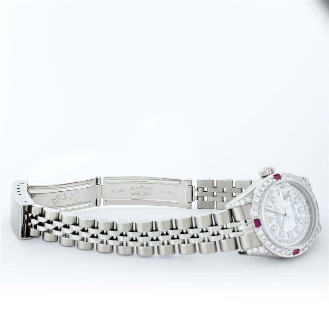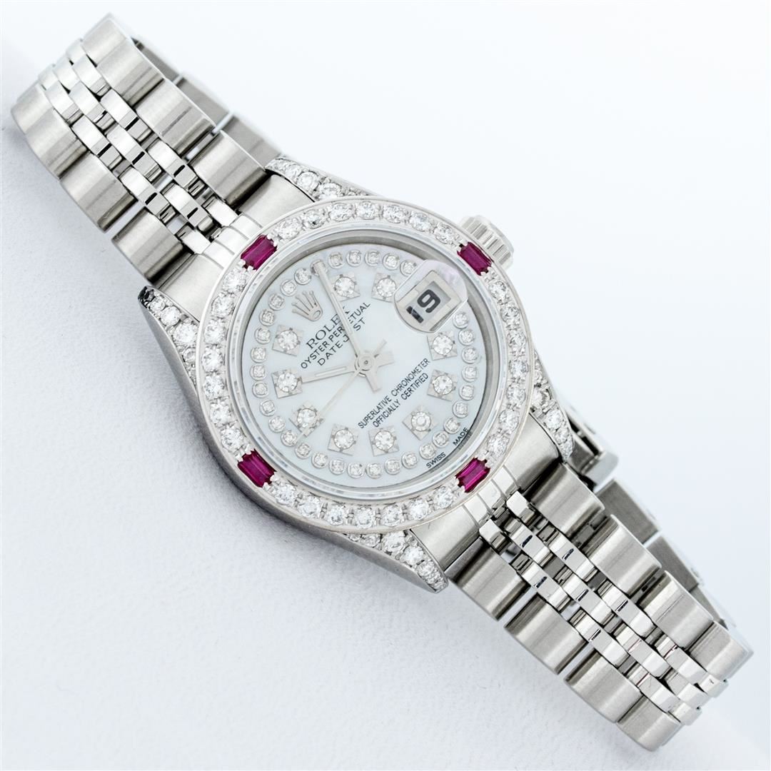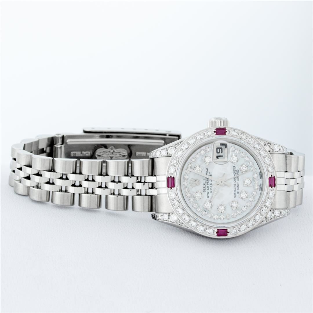 One Quickset Ladies Stainless Steel Rolex Datejust Polished Bright with Satin Finish, Serviced & Electronically Tested, Stainless Steel Case: 26mm, Stainless Steel Crown, Custom Diamond Lugs: 24 Diamonds On Lugs, Clarity: SI-VS, Color: G to H. Custom Bezel: New 18K White Gold Diamond + Ruby Beadset Diamond Bezel, Stone Count: 28 Diamonds + 4 Rubies, Total Weight .70 Carat, Clarity: SI-VS, Color: G to H. Custom Crystal: New Scratch Resistant Synthetic Sapphire Cyclops Lens. Custom Hands: New Luminescent Hands. Movement: Automatic Winding Movement. Custom Dial: Refinished Single Cut Mother Of Pearl String Diamond Dial, 43 Diamonds in Dial G To H In Color, Clarity: VS. Date Window: 3 O'Clock Position Date Display, Model: Quickset Datejust. Condition: G-6 Extra Fine. Bracelet: Stainless Steel Jubilee Band. Bright Polish & Satin Finish. 6.0 Inch Length, Adjustable. Standard Clasp, With Rolex Logo. This Watch Has Been Serviced Time Tested And Is In Excellent Condition It Is Free Of All Scratches And Dents.