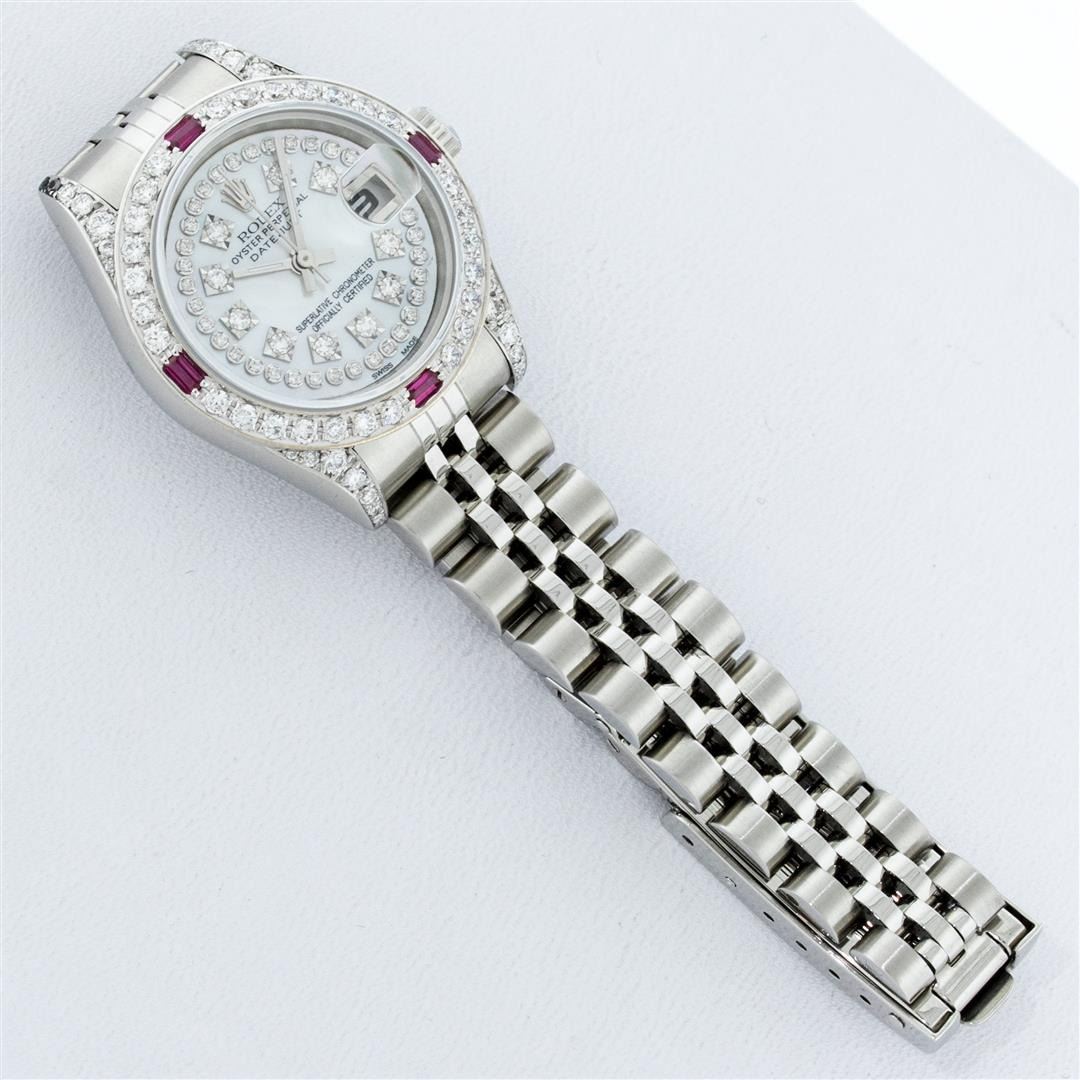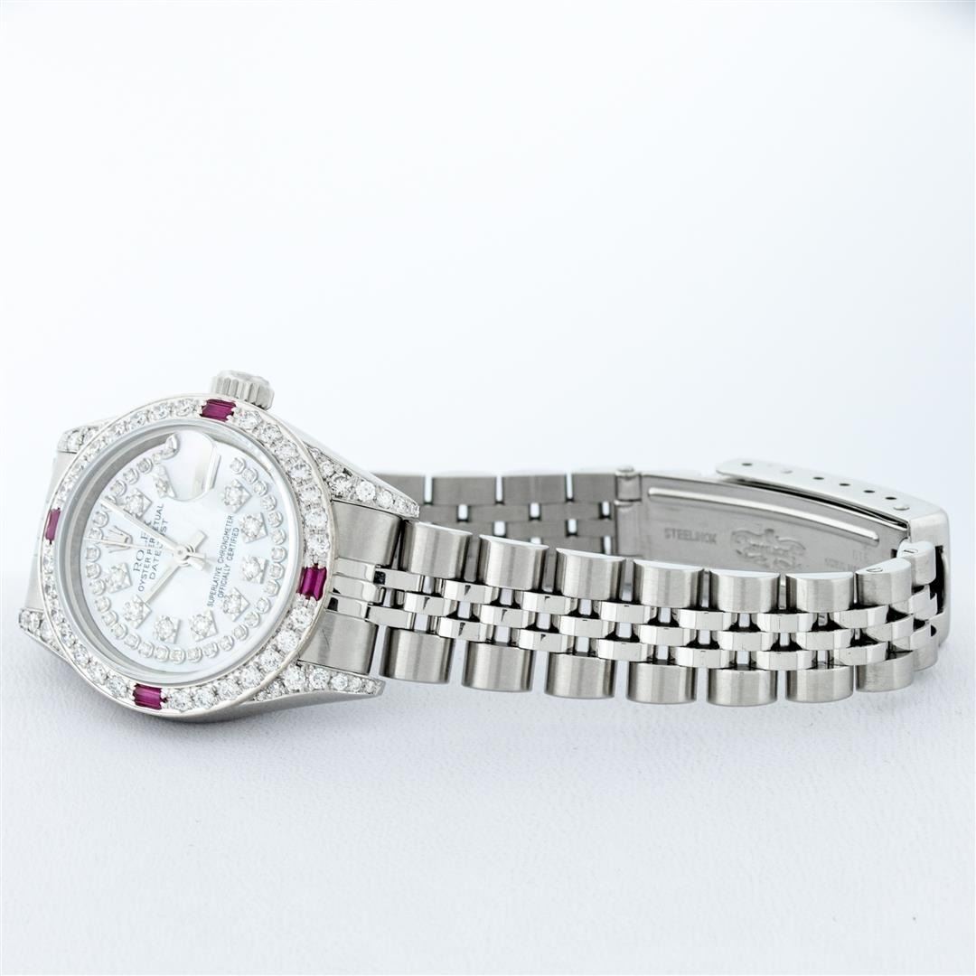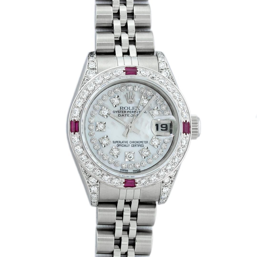 One Quickset Ladies Stainless Steel Rolex Datejust Polished Bright with Satin Finish, Serviced & Electronically Tested, Stainless Steel Case: 26mm, Stainless Steel Crown, Custom Diamond Lugs: 24 Diamonds On Lugs, Clarity: SI-VS, Color: G to H. Custom Bezel: New 18K White Gold Diamond + Ruby Beadset Diamond Bezel, Stone Count: 28 Diamonds + 4 Rubies, Total Weight .70 Carat, Clarity: SI-VS, Color: G to H. Custom Crystal: New Scratch Resistant Synthetic Sapphire Cyclops Lens. Custom Hands: New Luminescent Hands. Movement: Automatic Winding Movement. Custom Dial: Refinished Single Cut Mother Of Pearl String Diamond Dial, 43 Diamonds in Dial G To H In Color, Clarity: VS. Date Window: 3 O'Clock Position Date Display, Model: Quickset Datejust. Condition: G-6 Extra Fine. Bracelet: Stainless Steel Jubilee Band. Bright Polish & Satin Finish. 6.0 Inch Length, Adjustable. Standard Clasp, With Rolex Logo. This Watch Has Been Serviced Time Tested And Is In Excellent Condition It Is Free Of All Scratches And Dents.